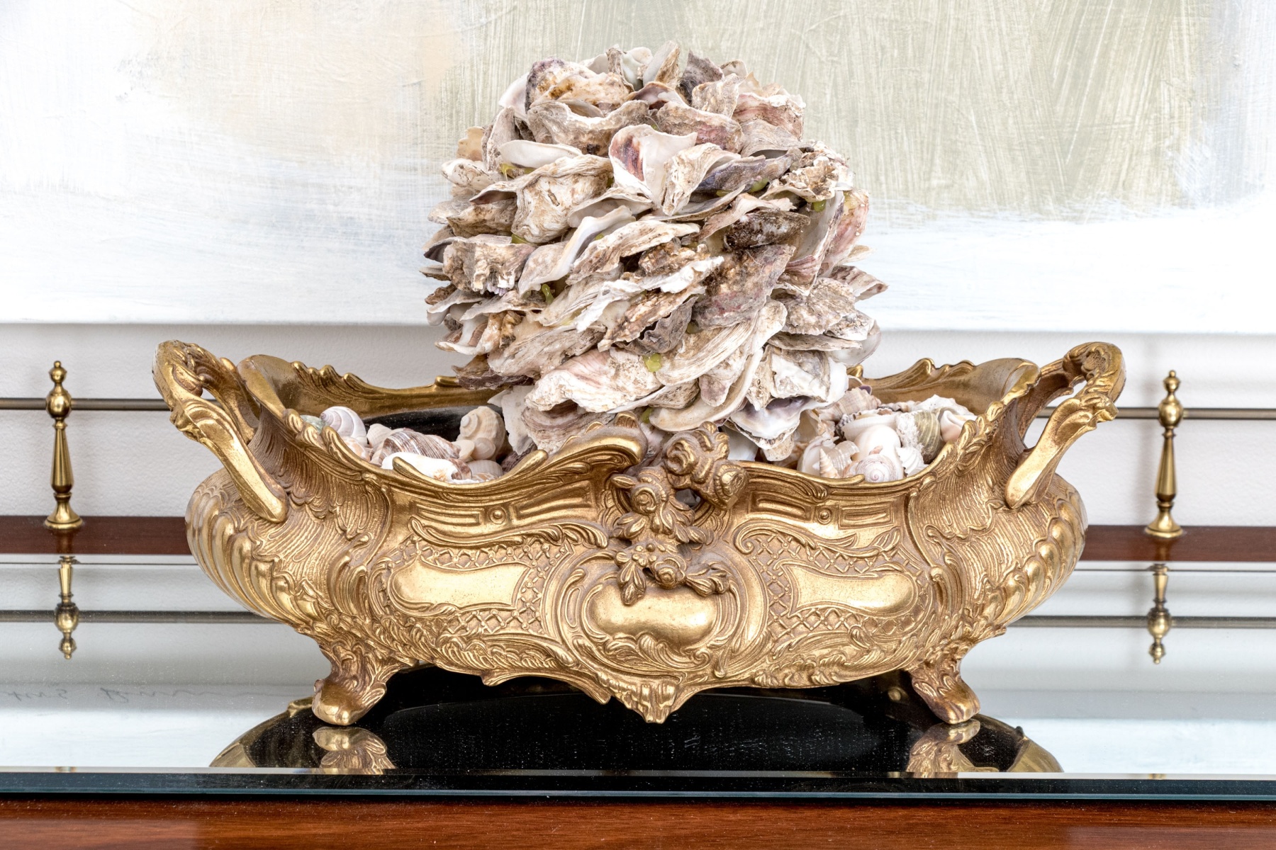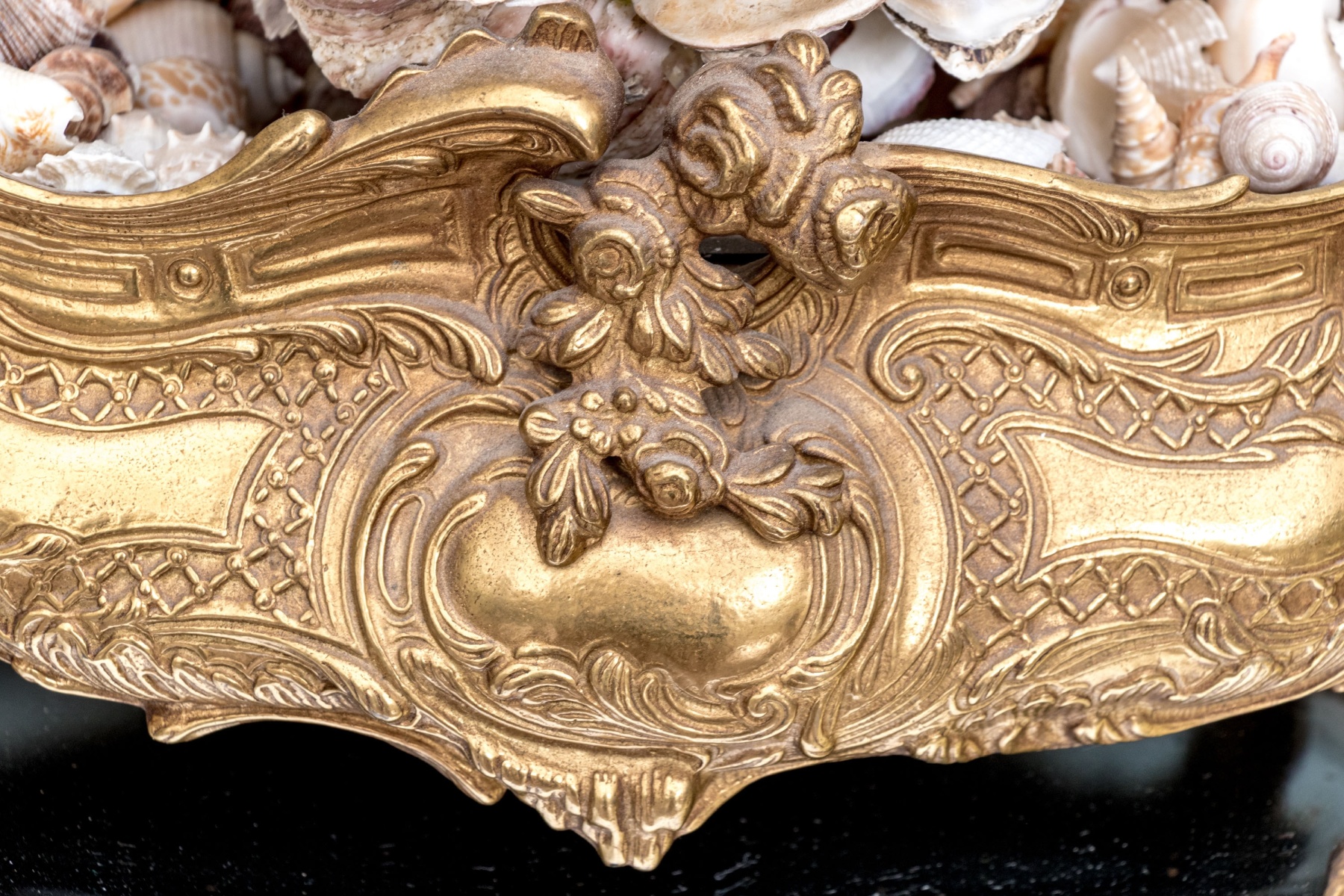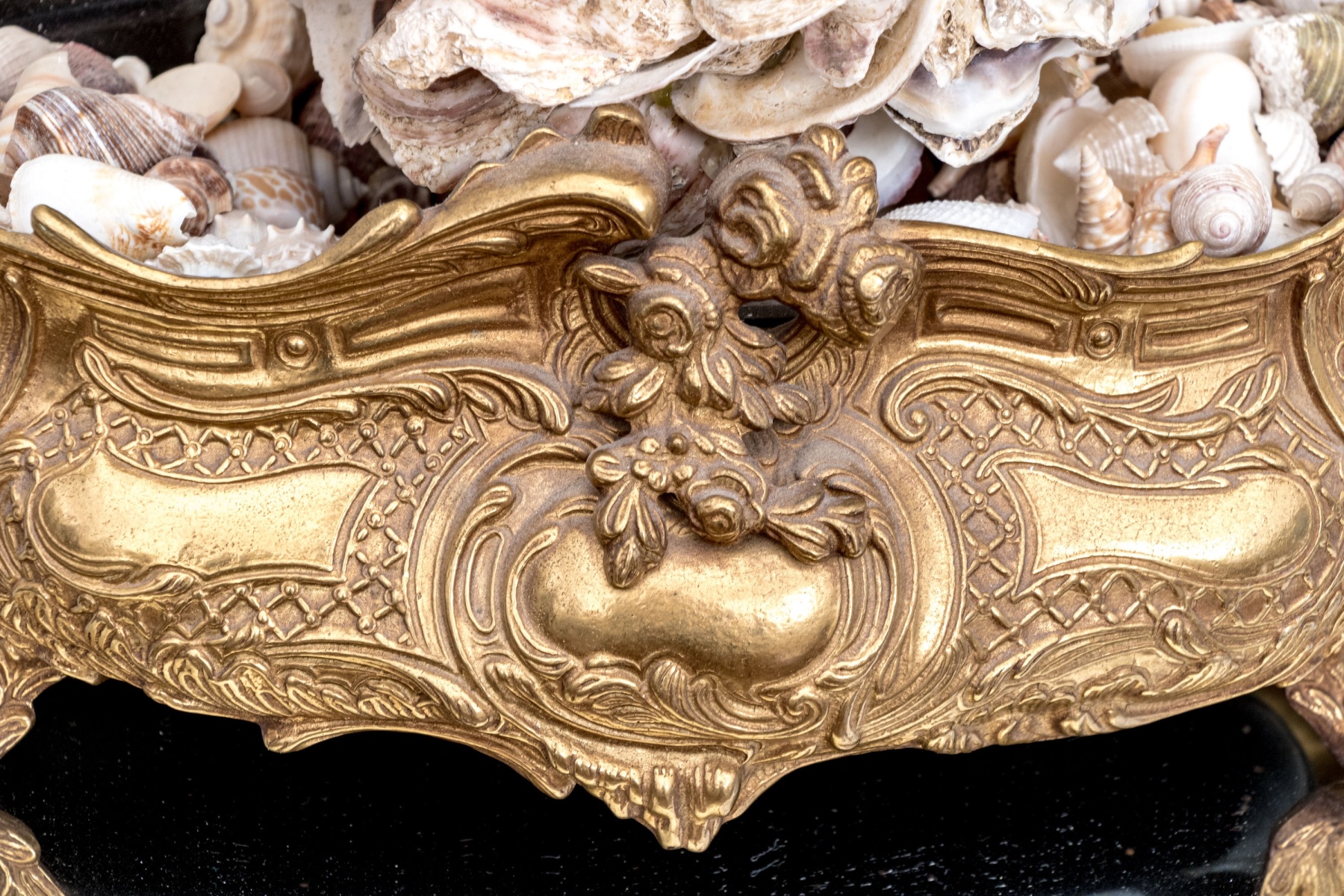 A stunning brass jardiniere with intricate French rococo style, decadently designed with twin handles on either side of a bombe oval body detailed with a swooping, serpentine rim. The body sports shapely plaque surrounded by lattices, foliate flourishes, and finely textured swooping panels around the sides, raised over stout flared feet. Filled with seashells and topped with a shell orb.