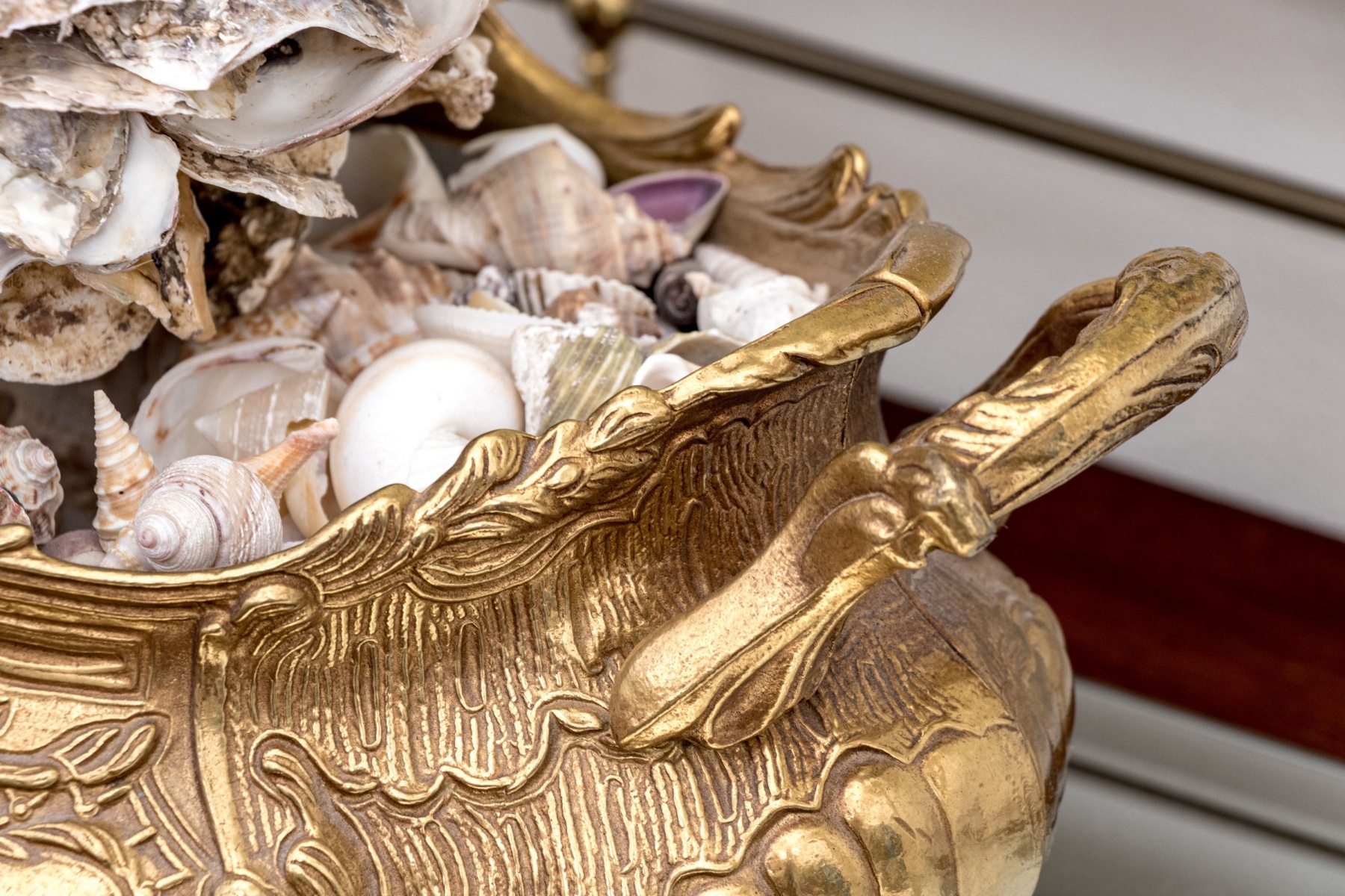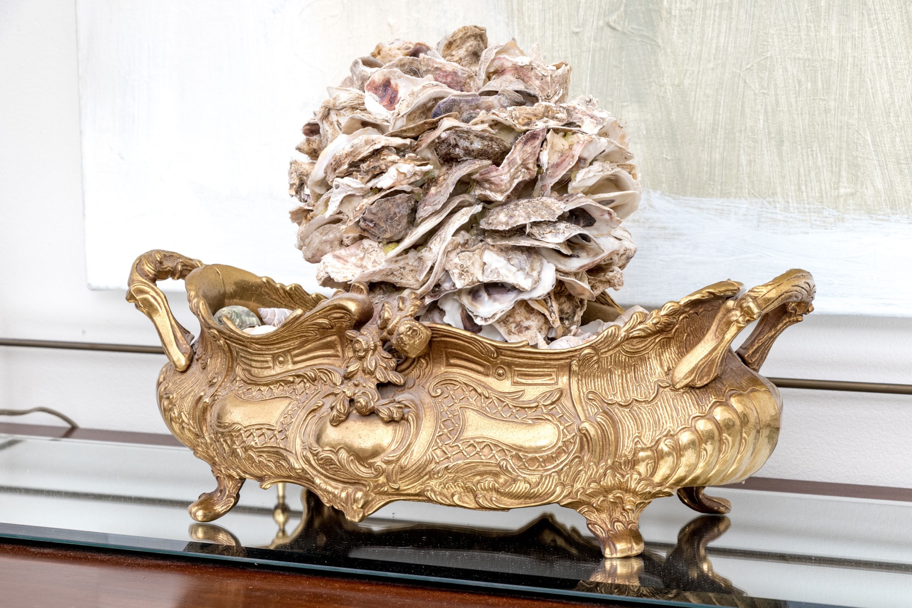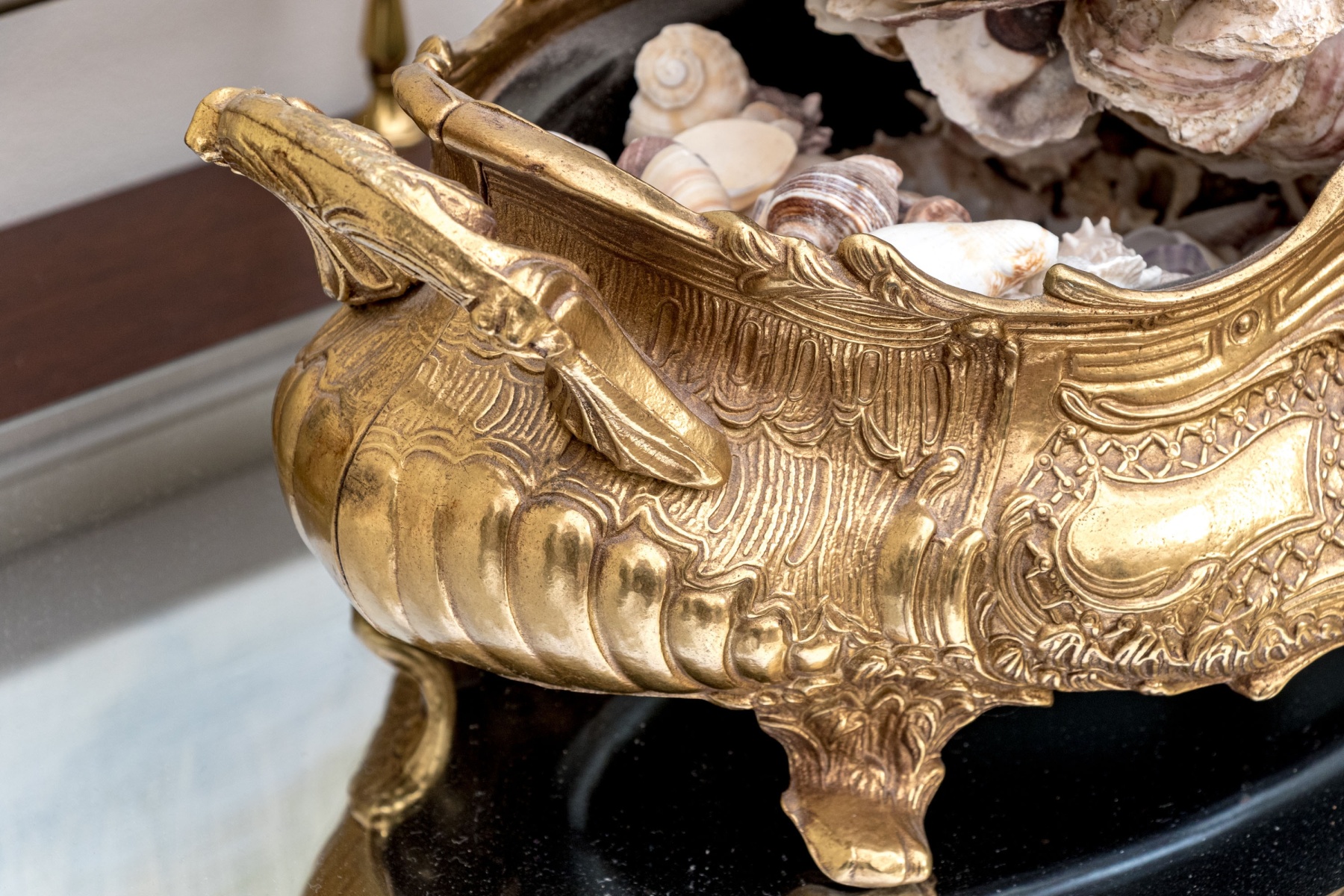 A stunning brass jardiniere with intricate French rococo style, decadently designed with twin handles on either side of a bombe oval body detailed with a swooping, serpentine rim. The body sports shapely plaque surrounded by lattices, foliate flourishes, and finely textured swooping panels around the sides, raised over stout flared feet. Filled with seashells and topped with a shell orb.