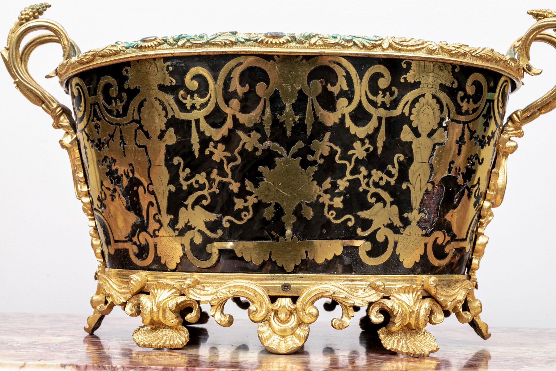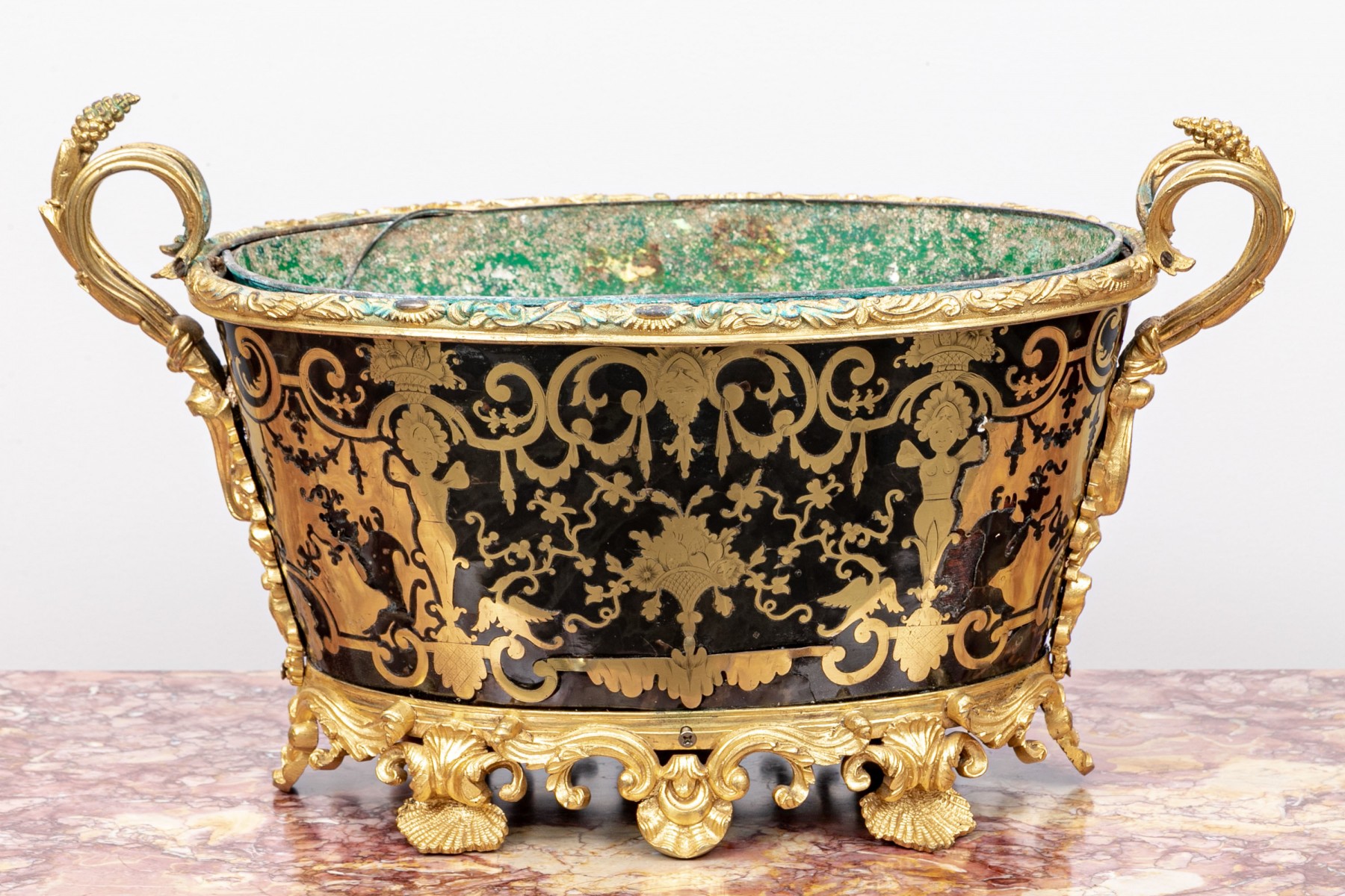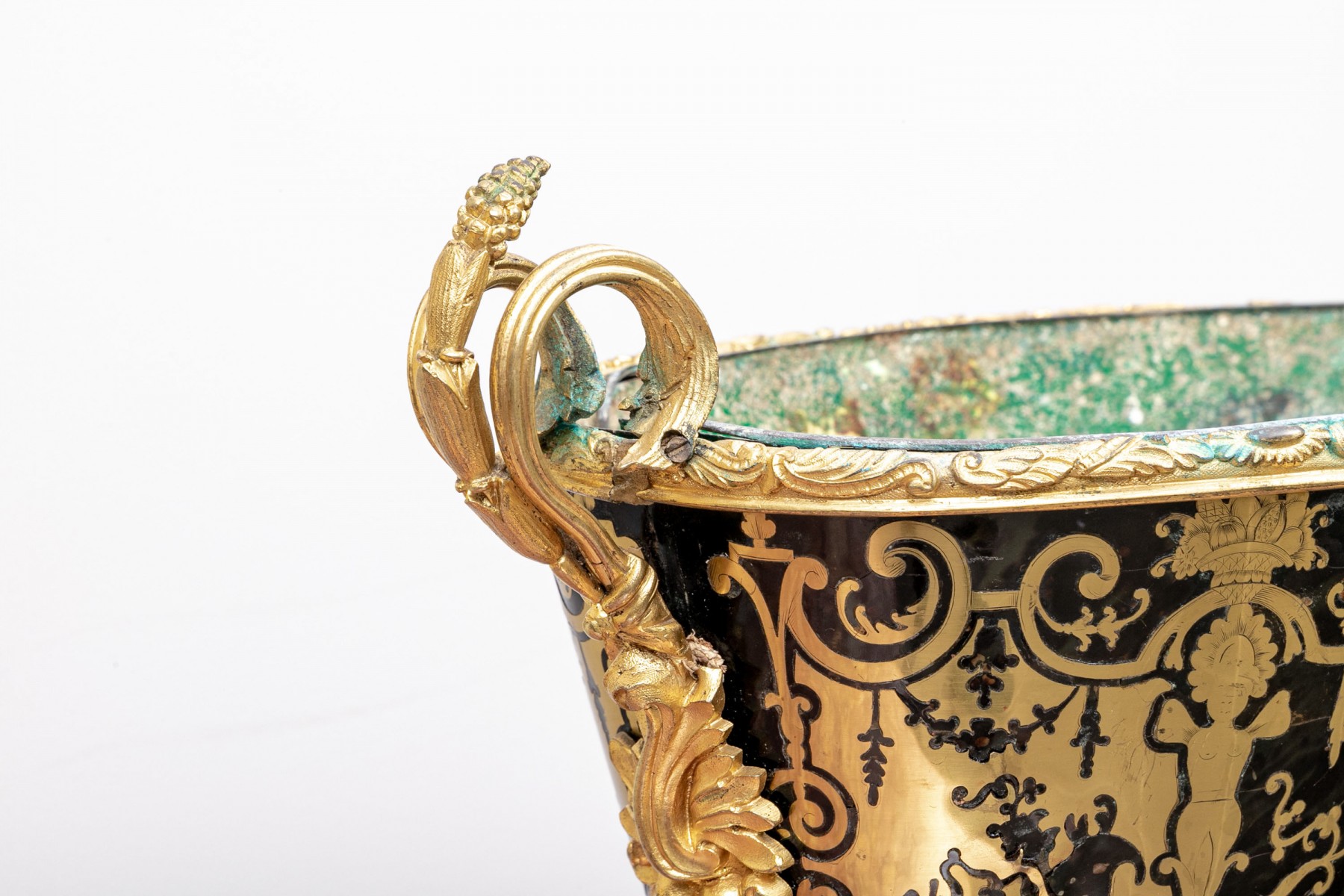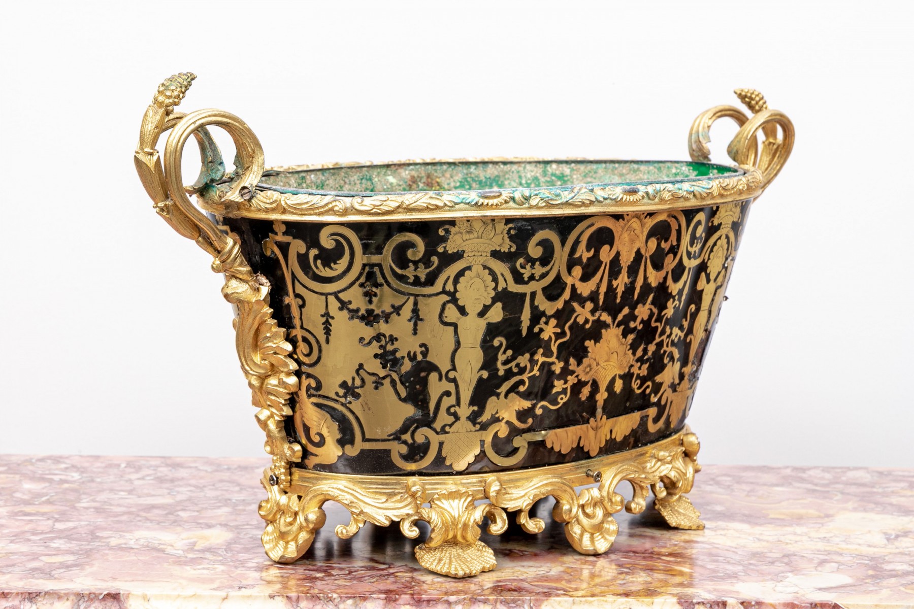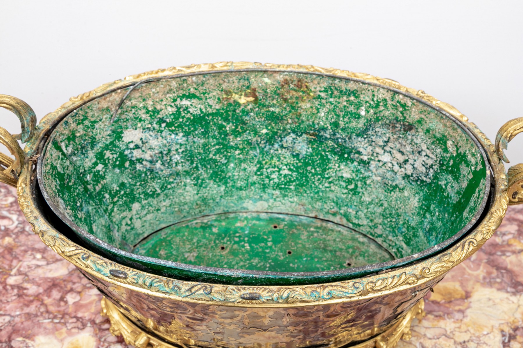 An oval jardiniere with gilt bronze frame with tall scrolled handles and foliate scrolled leafy footed base. The sides with dark overlay with faux gold tone metal overlays with swags, vases with flowers and winged caryatid protomes. With a green painted metal insert (broken and well worn).