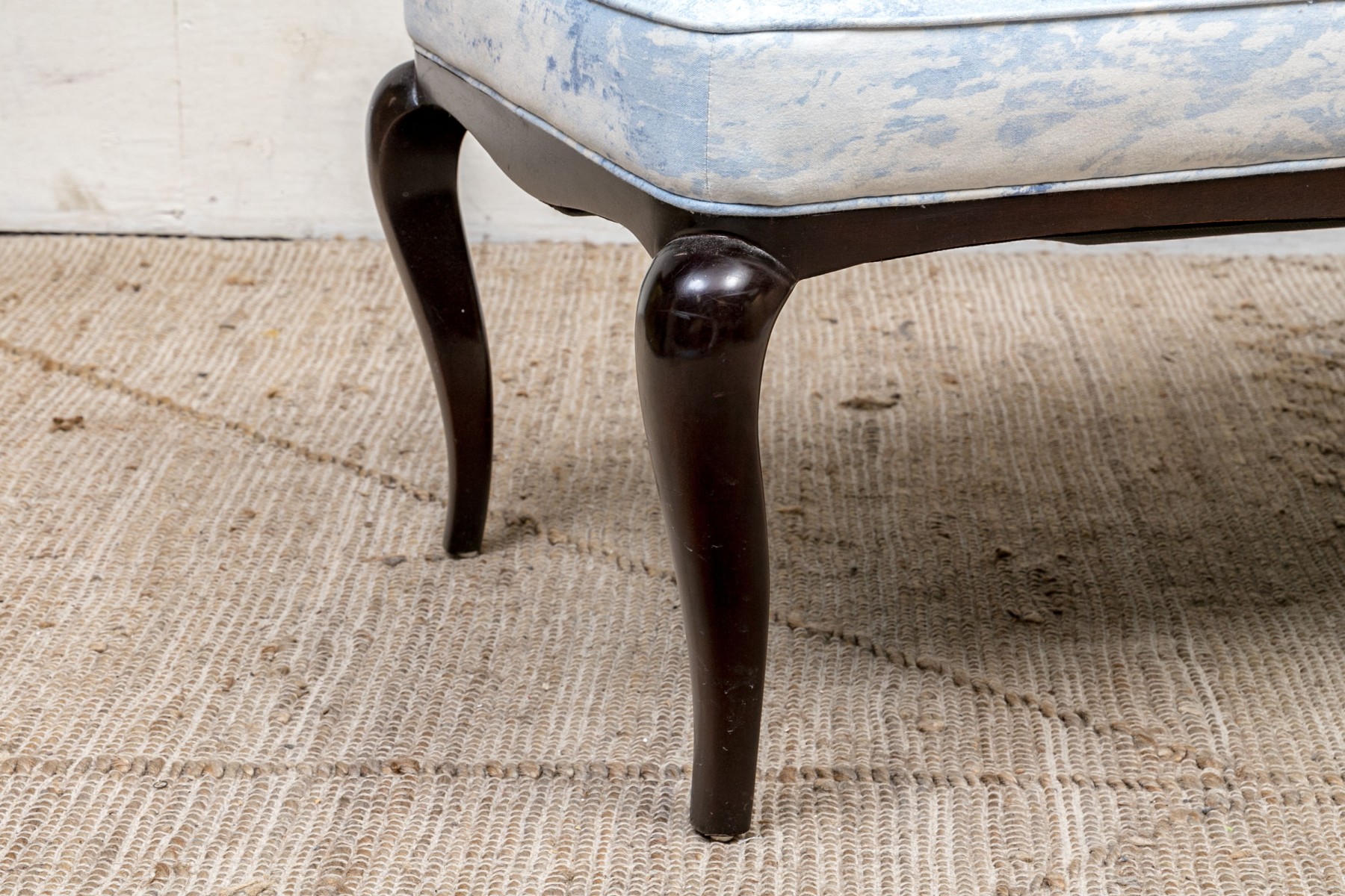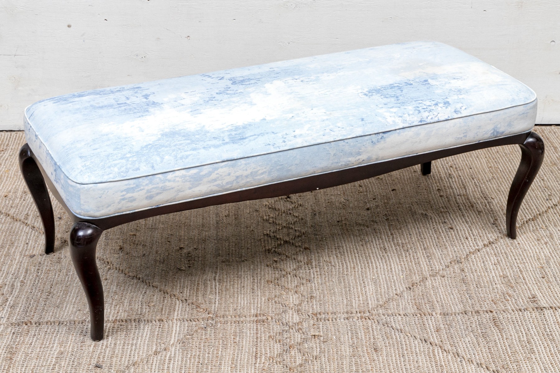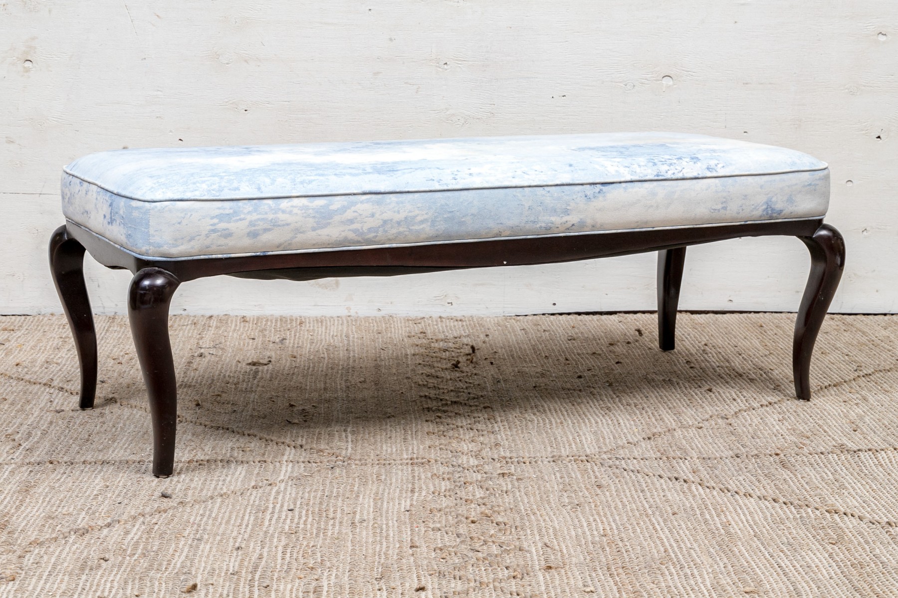 An elegant rectangular bench with a dark stained shaped frame raised on curved legs. The seat upholstered In a watery blue and white print fabric.