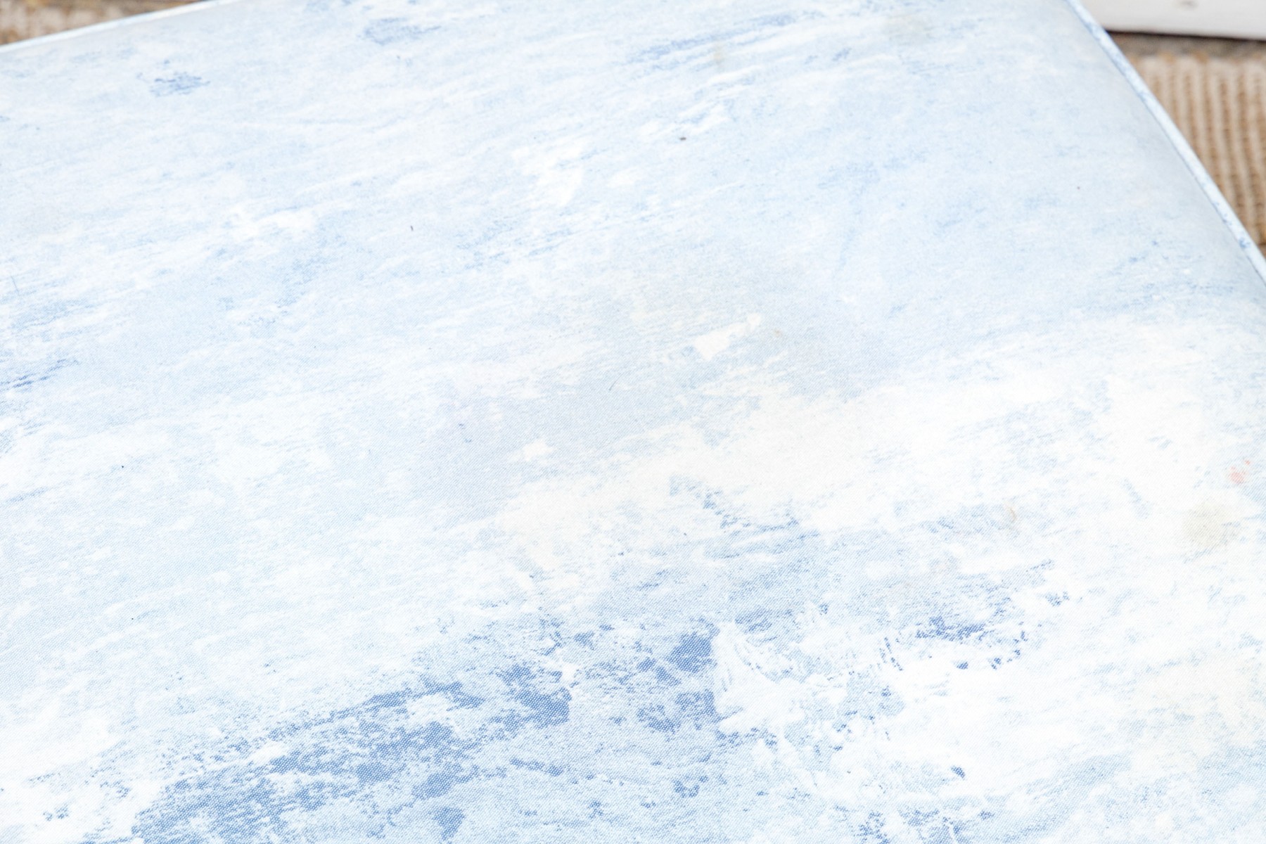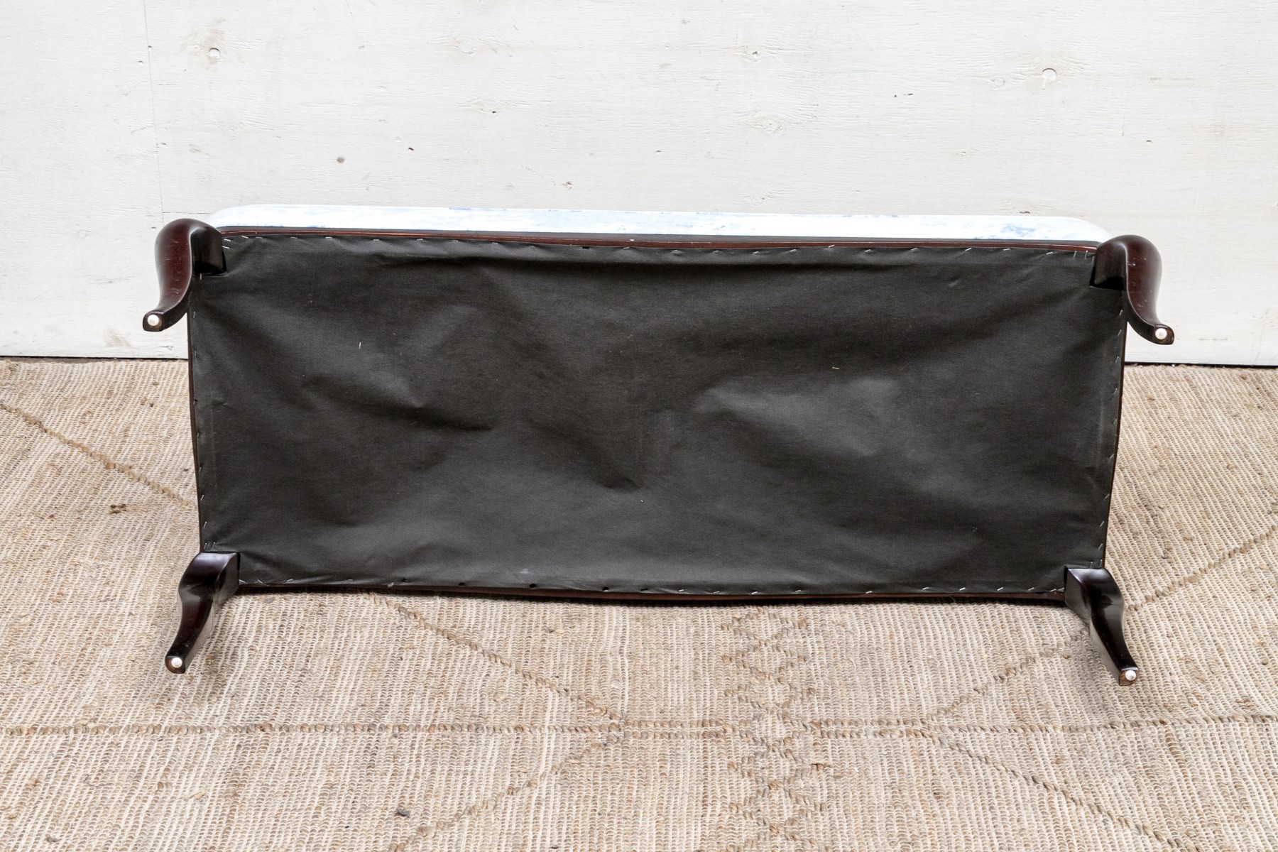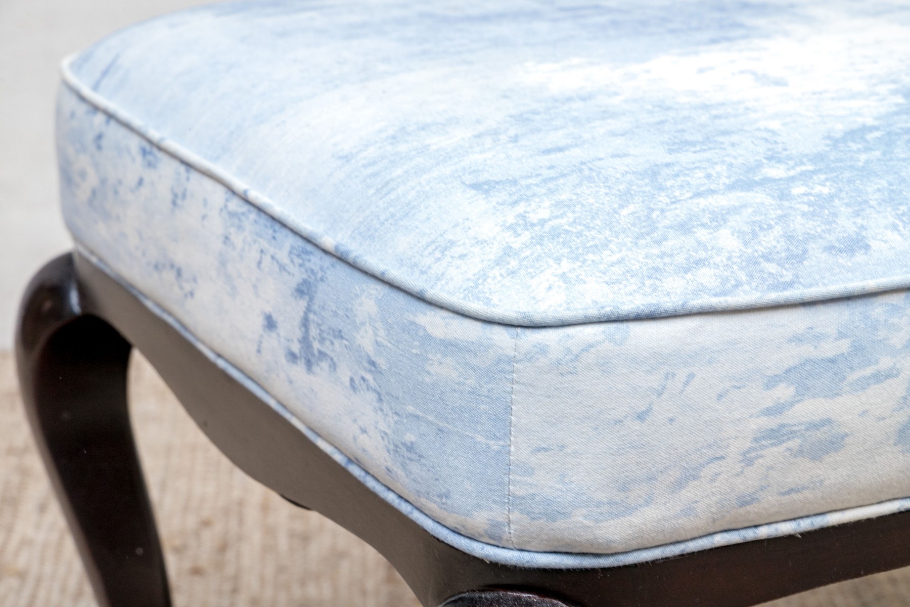 An elegant rectangular bench with a dark stained shaped frame raised on curved legs. The seat upholstered In a watery blue and white print fabric.