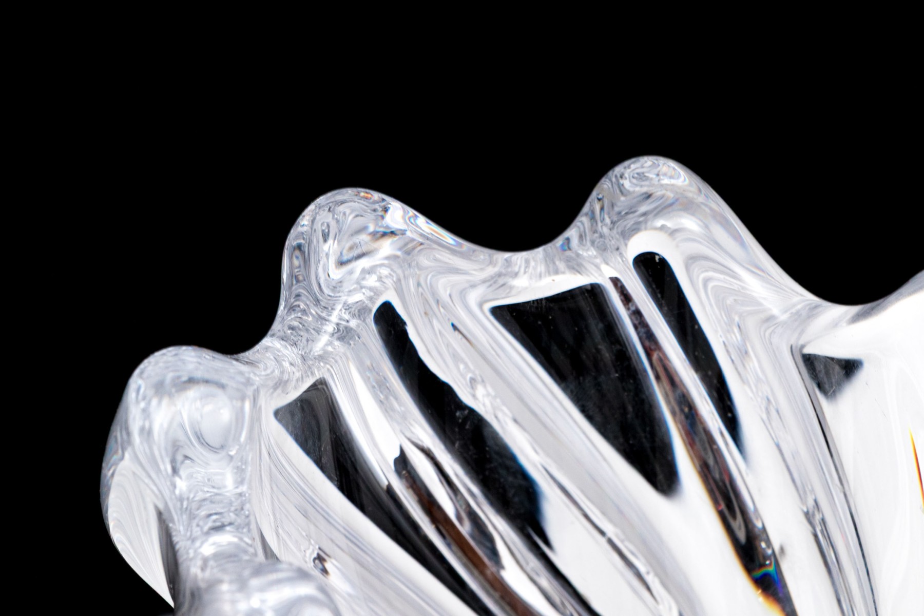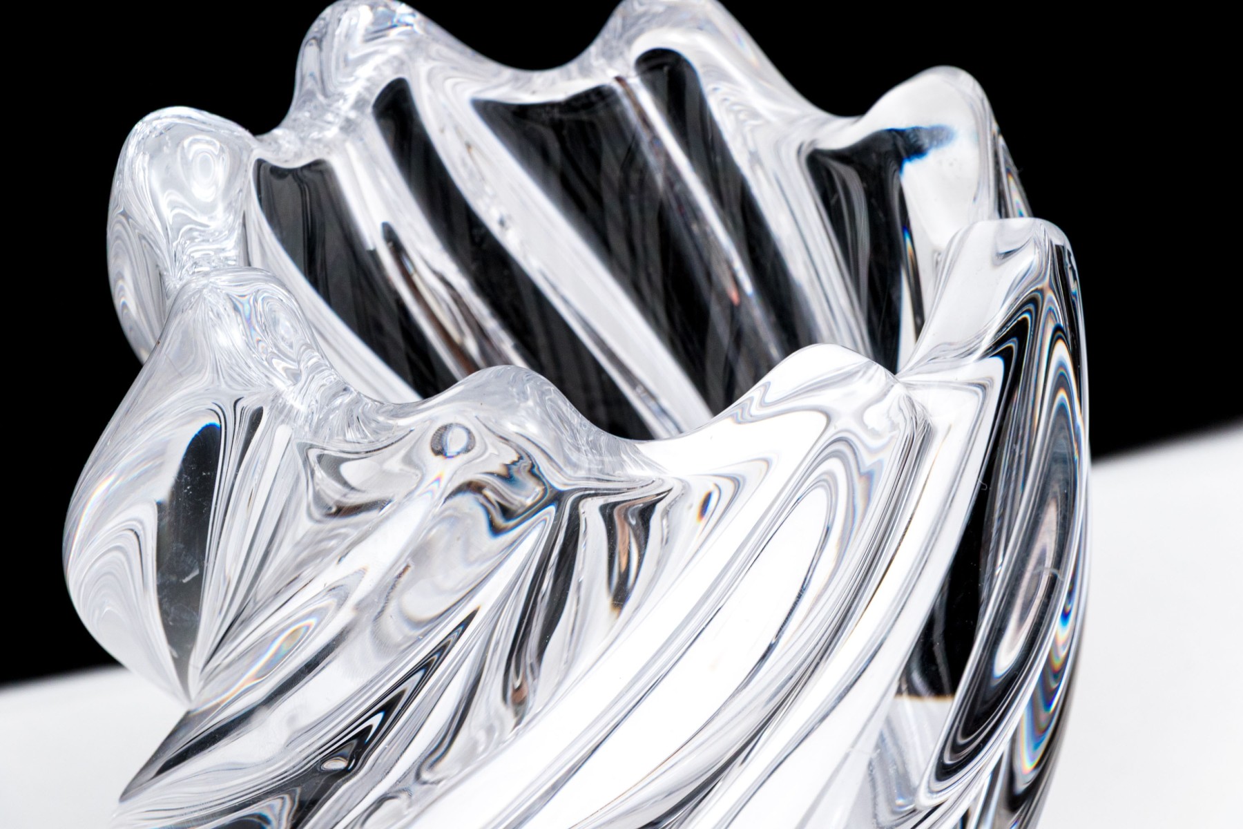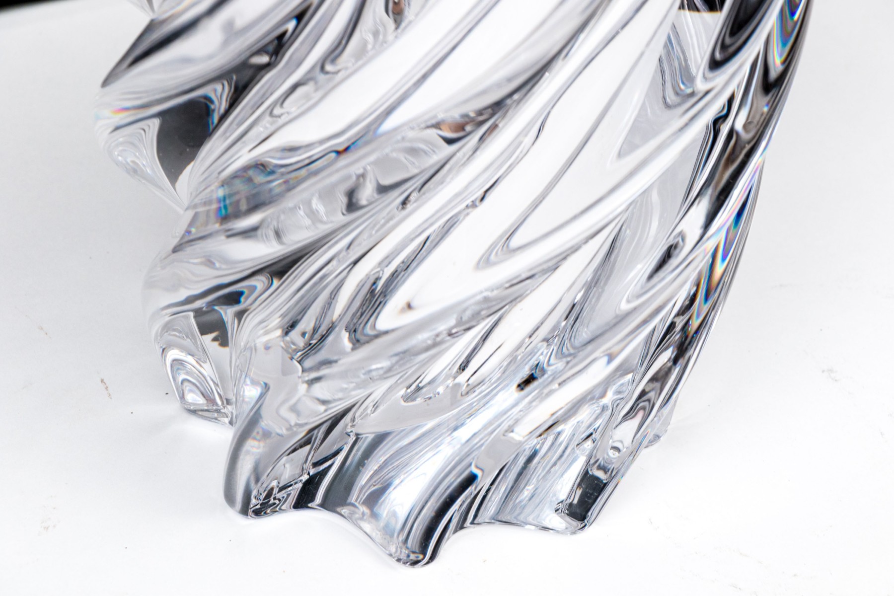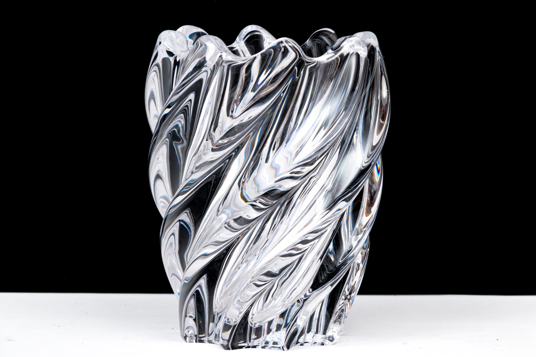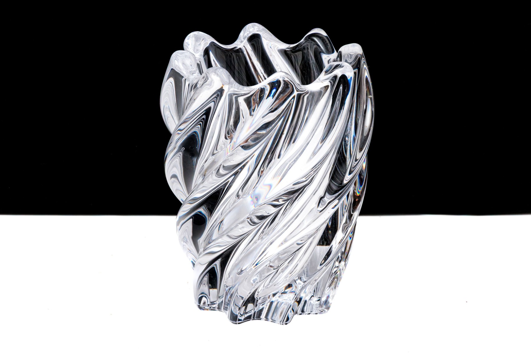 A gorgeous Vannes crystal vase with a thick, spiraling cylindrical form that catches the light beautifully making for a captivating and elegant display. Marked underfoot.