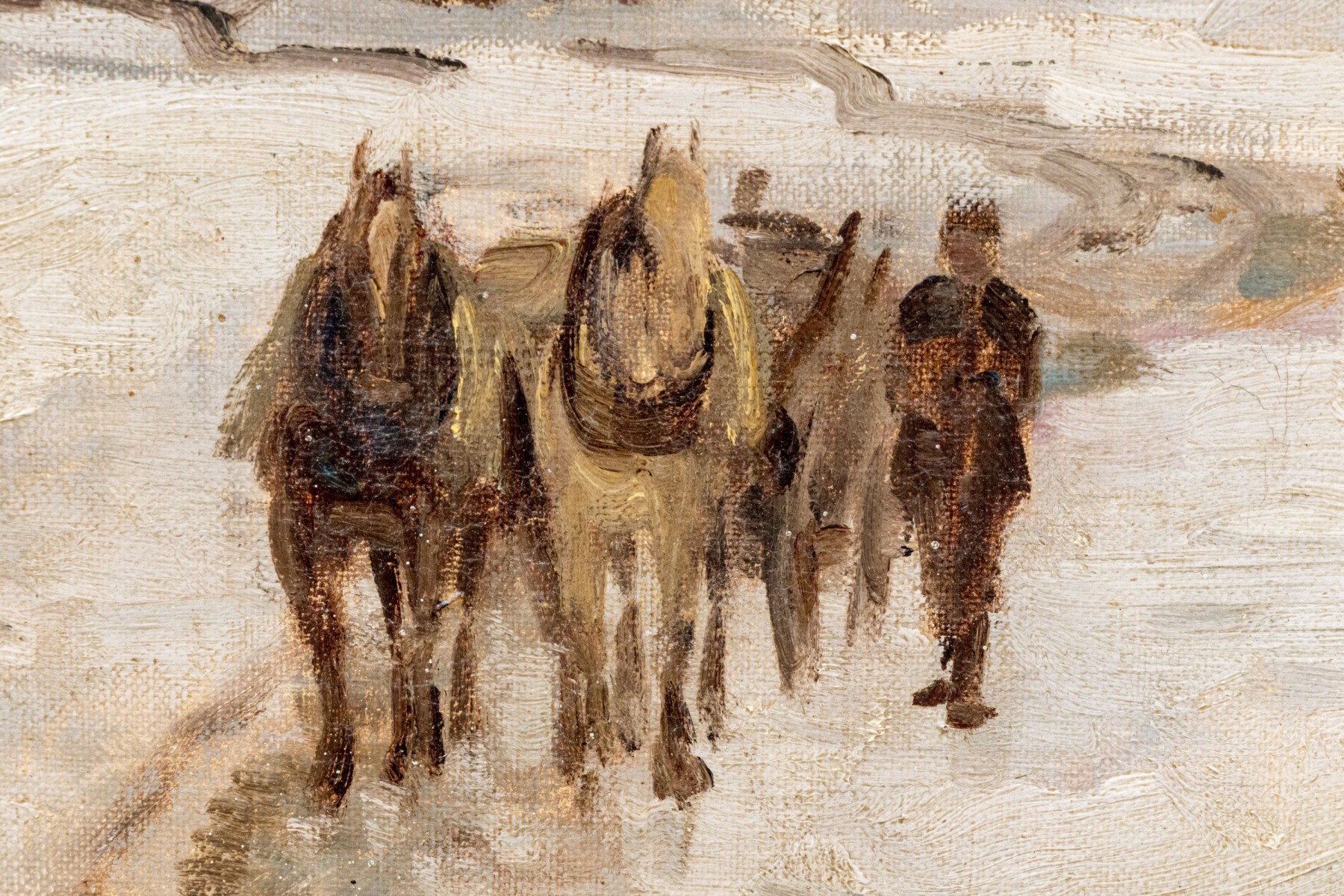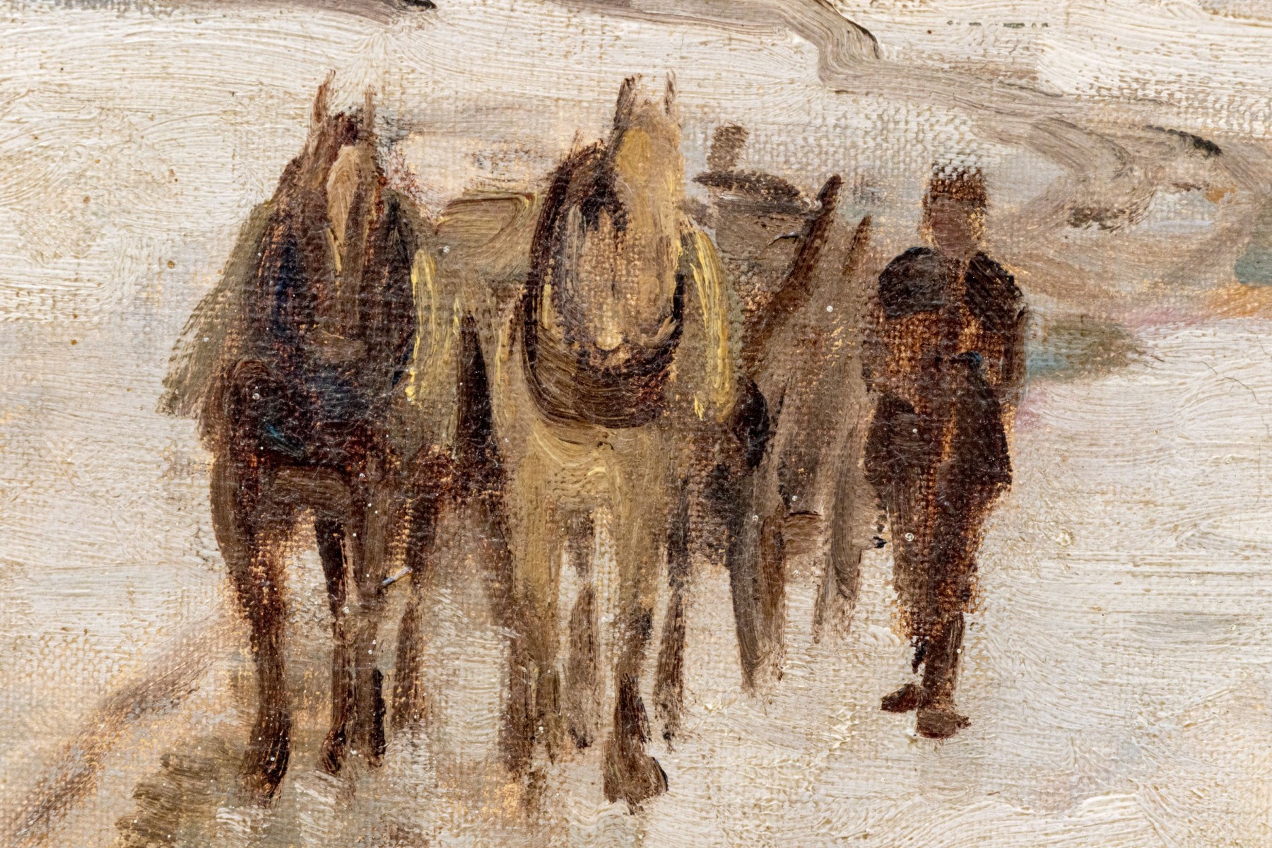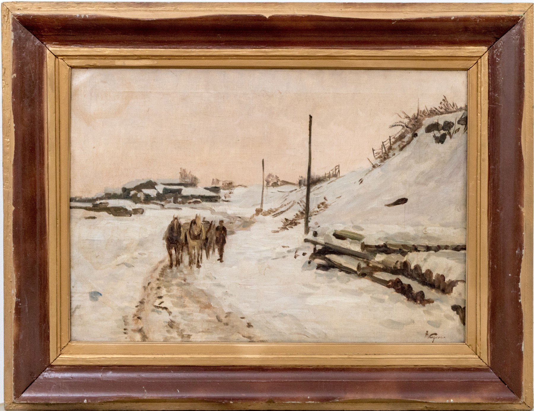 Fritz Wucherer (Swiss-German, 1873-1948) "Schneestimmung" oil painting on board depicting figures and horses traveling a winding dirt path in a snowy landscape past sloping hills. Signed lower right and on the verso with the title.