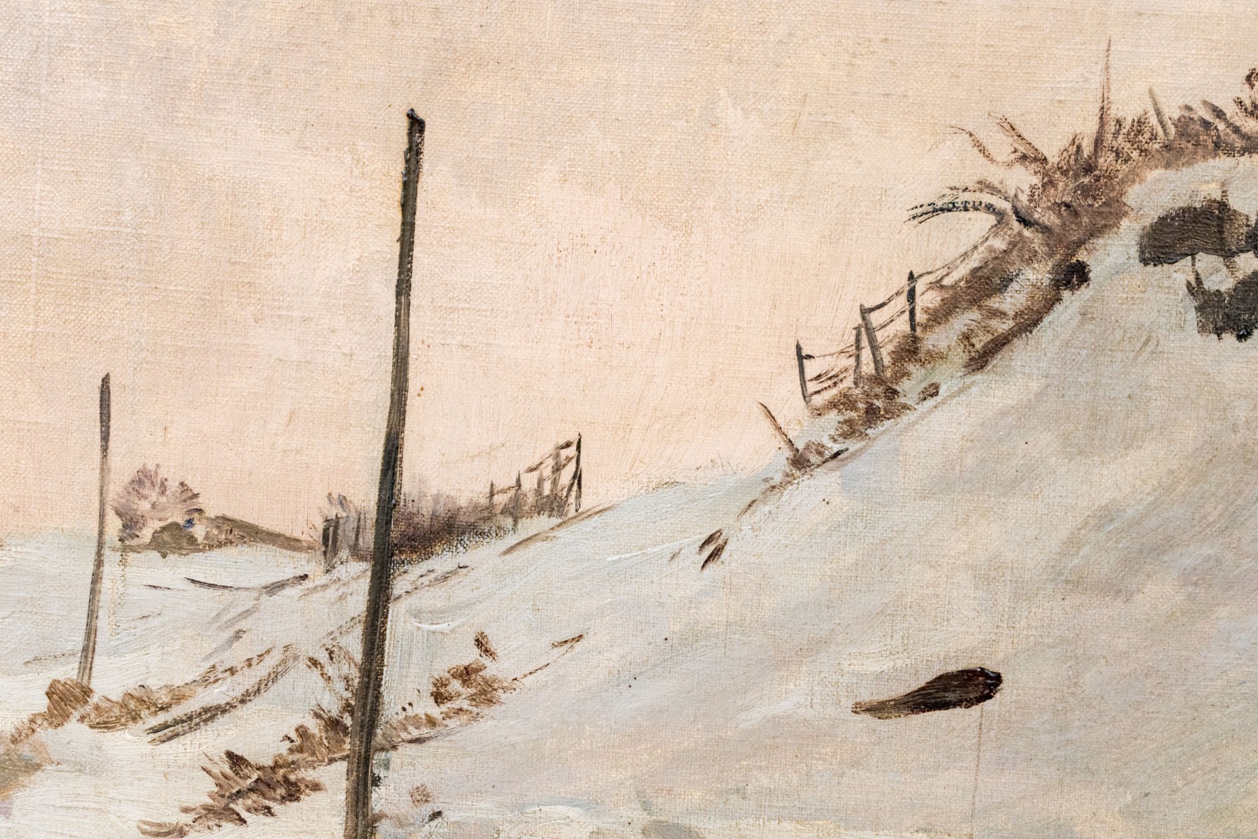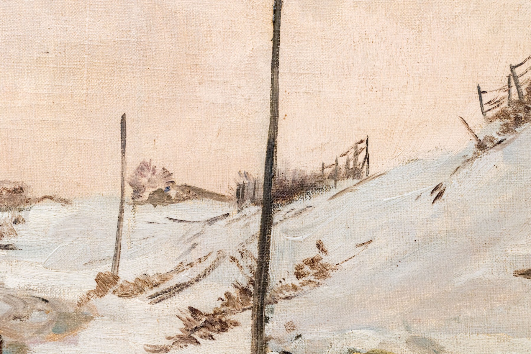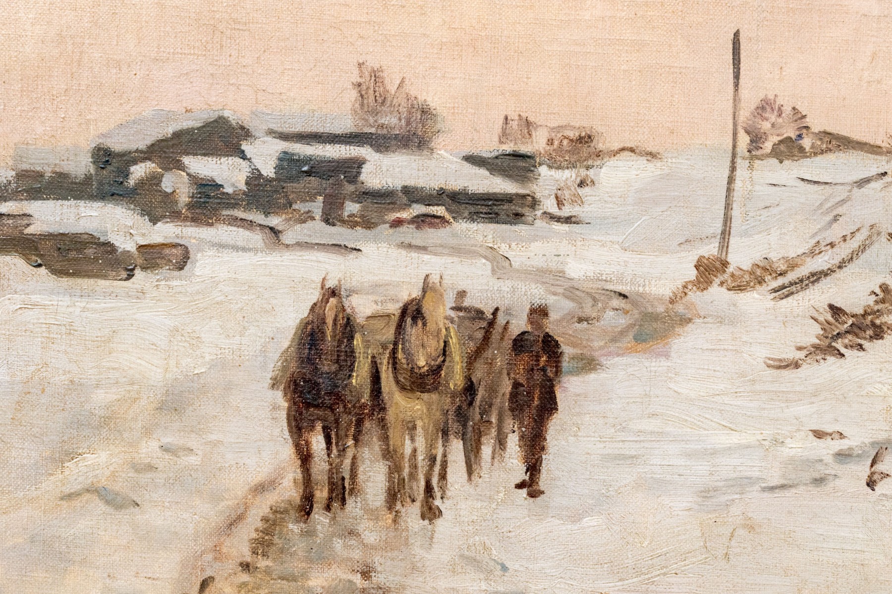 Fritz Wucherer (Swiss-German, 1873-1948) "Schneestimmung" oil painting on board depicting figures and horses traveling a winding dirt path in a snowy landscape past sloping hills. Signed lower right and on the verso with the title.