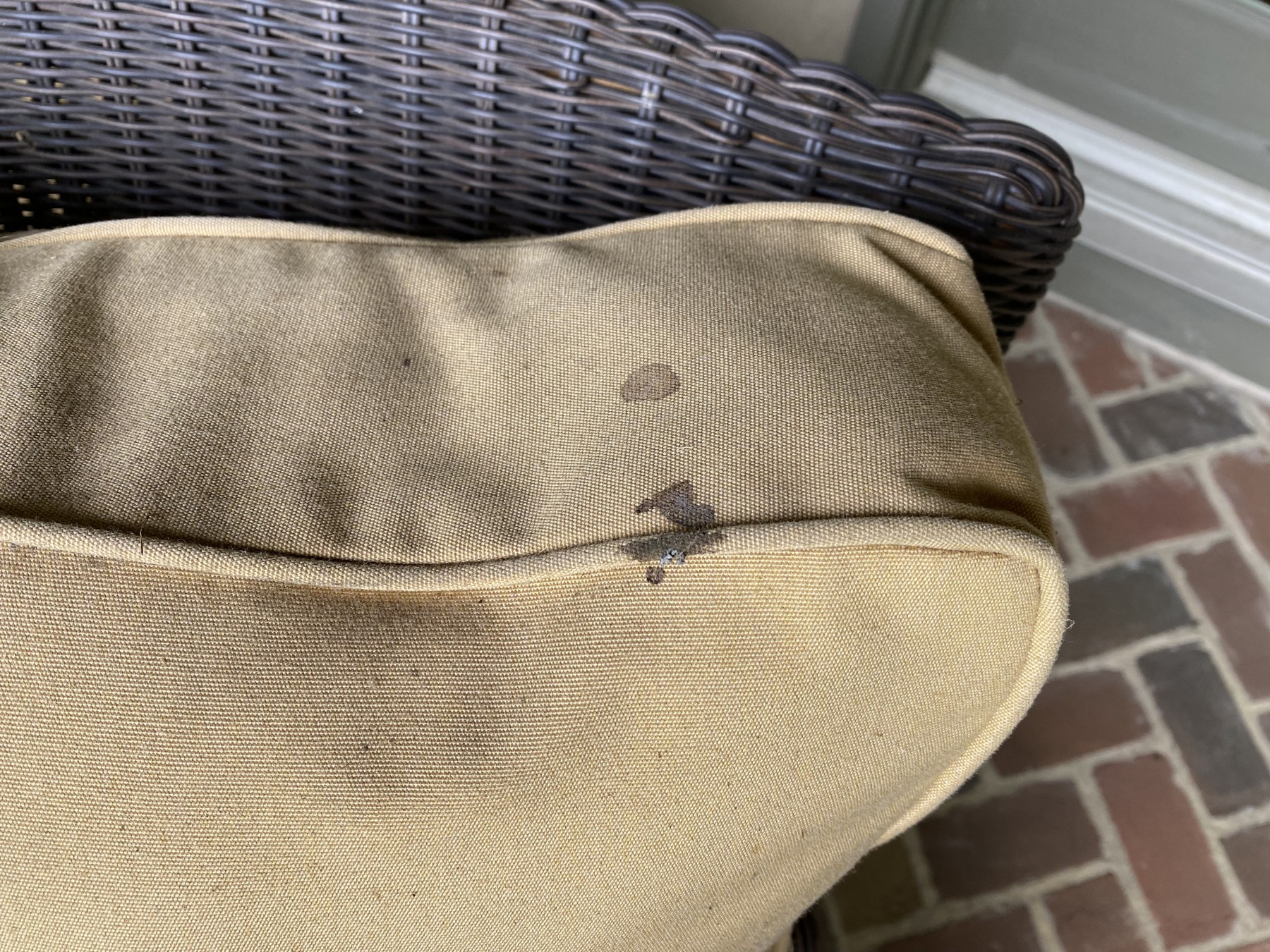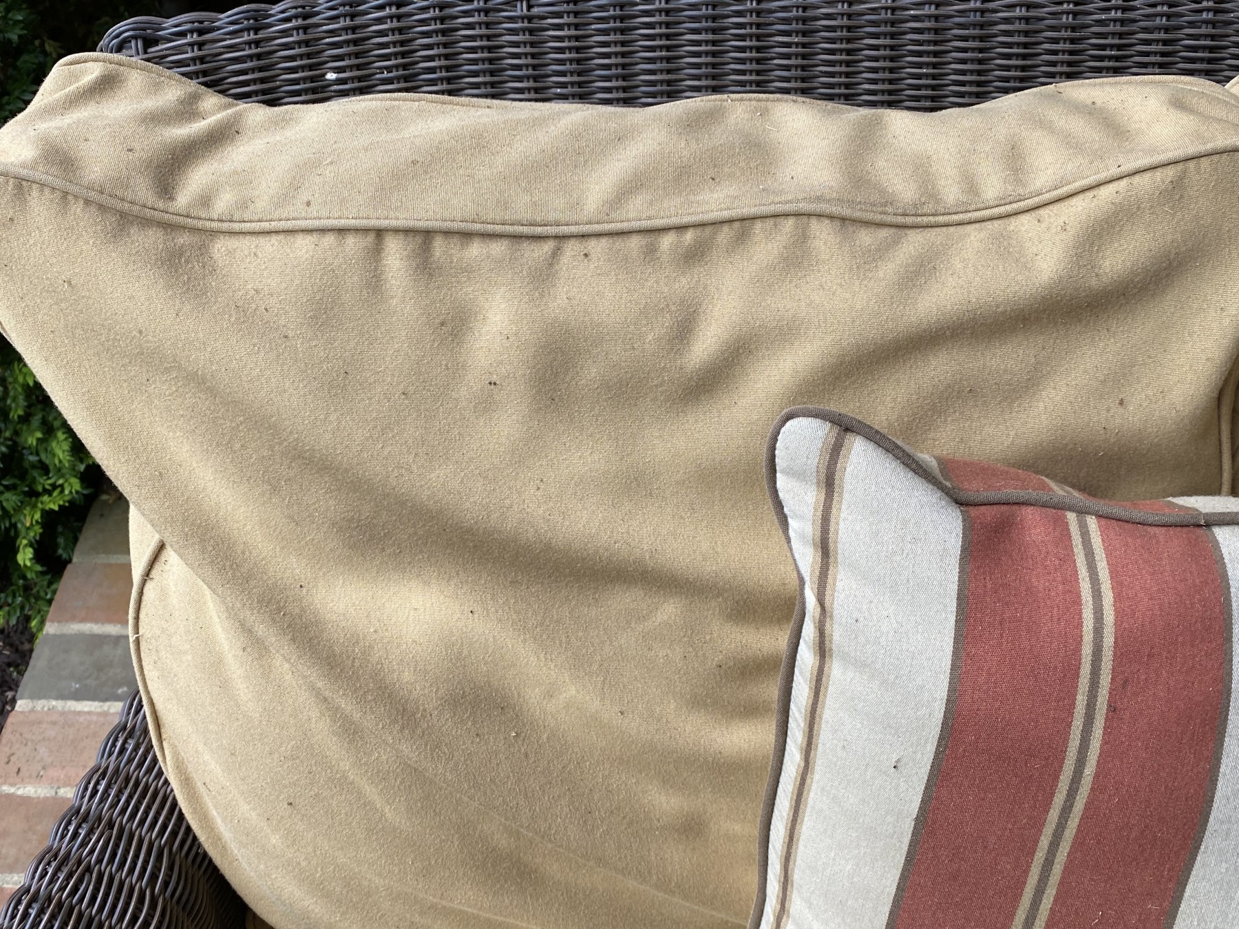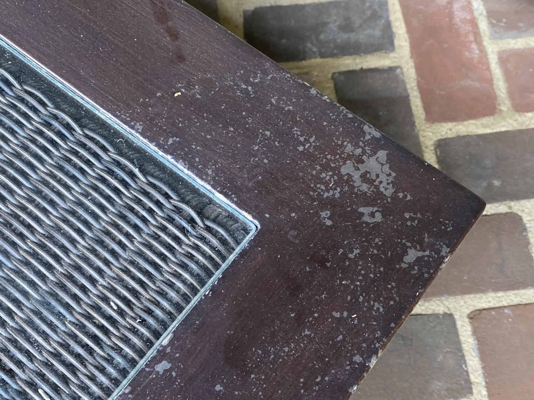 A great set overall with wear commensurate with outdoor use. Wear and staining to the cushions and finish wear around the table tops and feet.