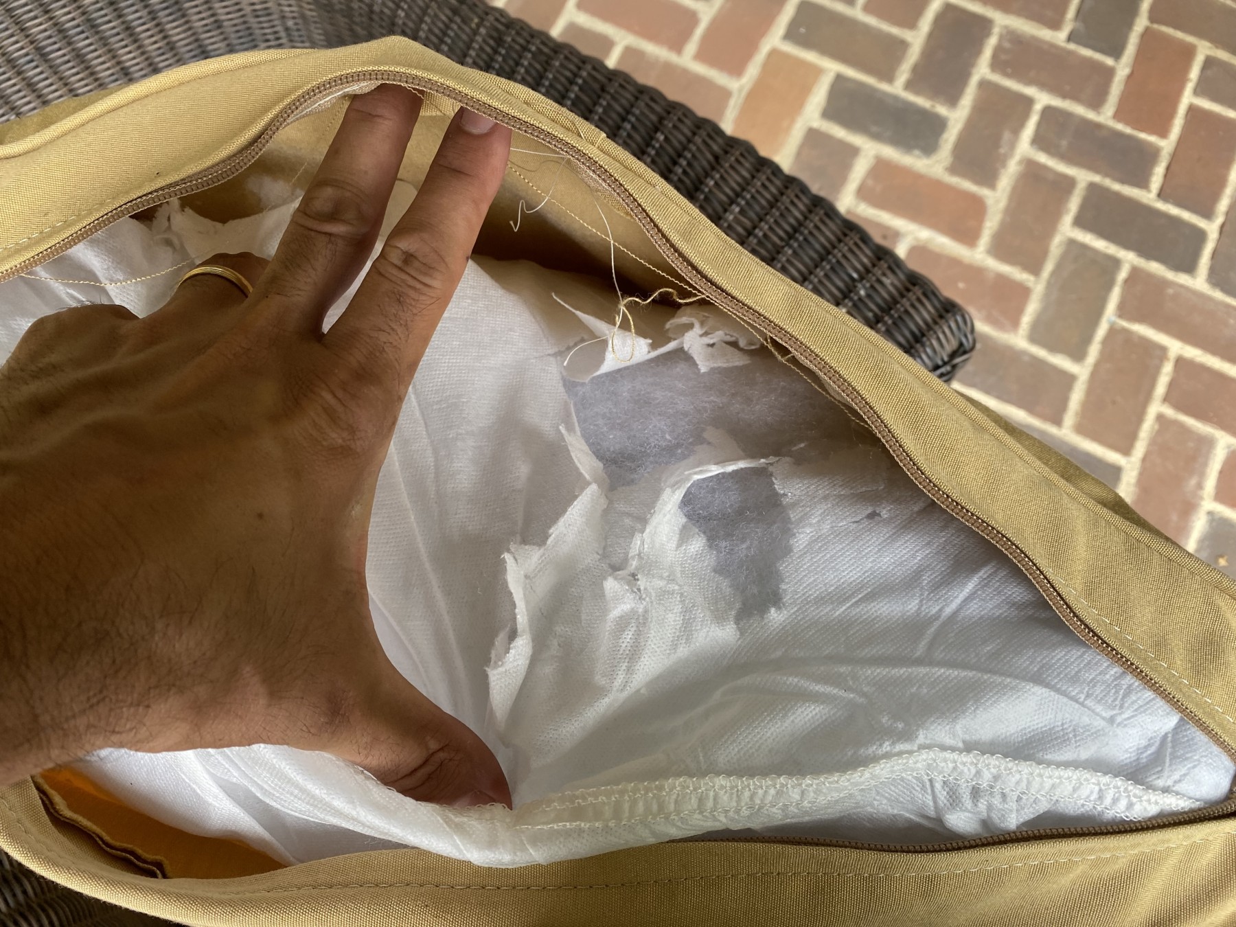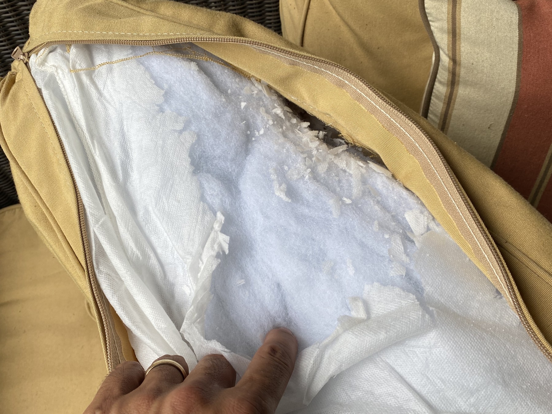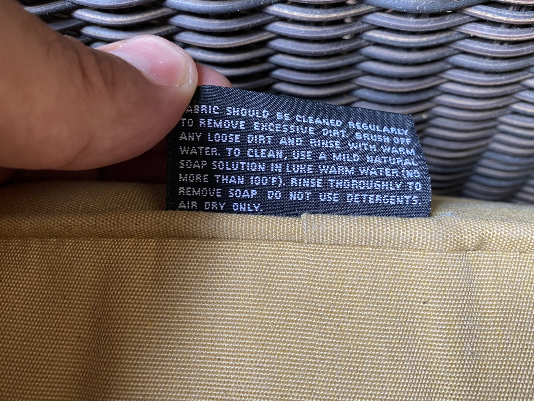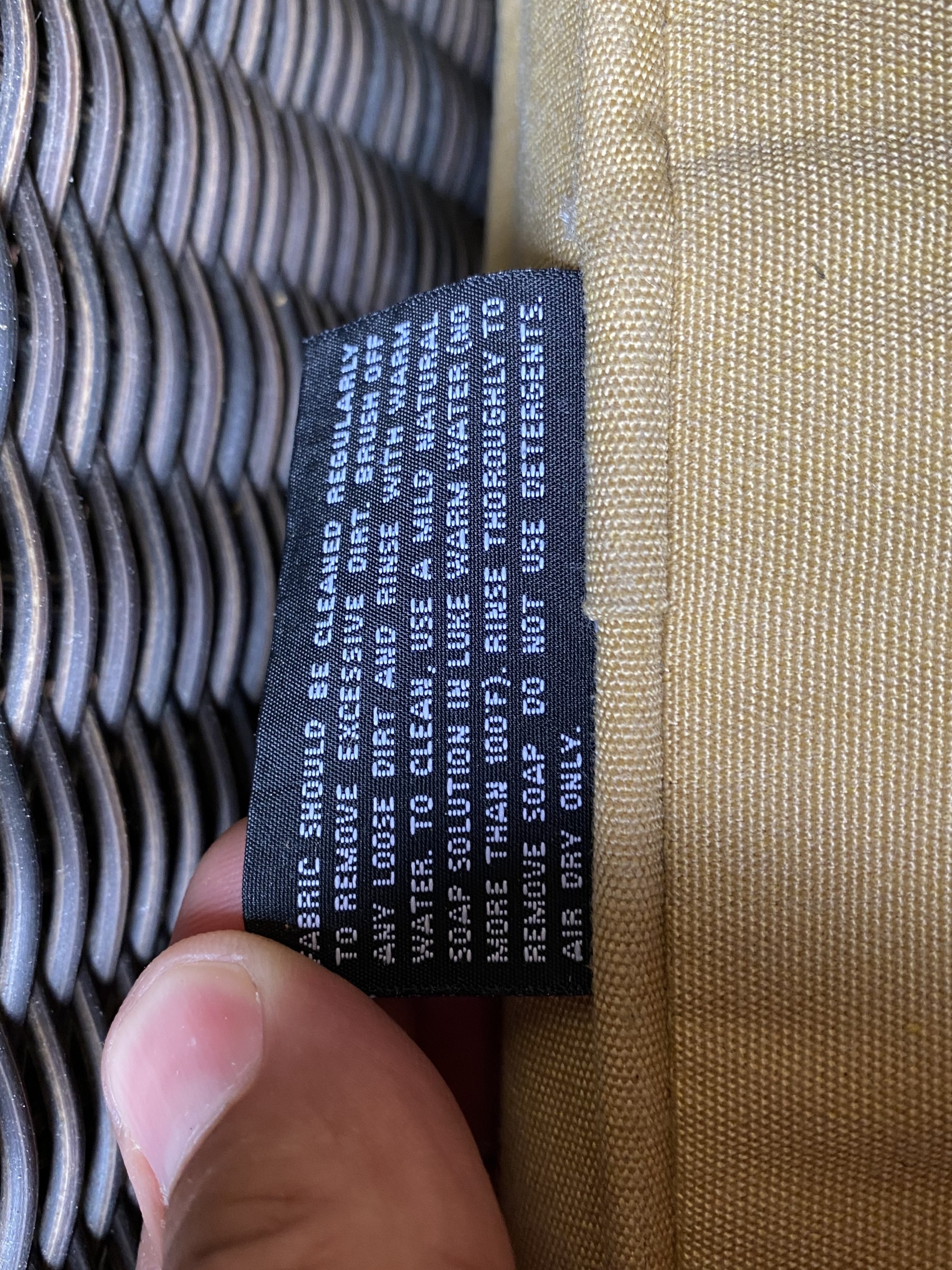 A great set overall with wear commensurate with outdoor use. Wear and staining to the cushions and finish wear around the table tops and feet.