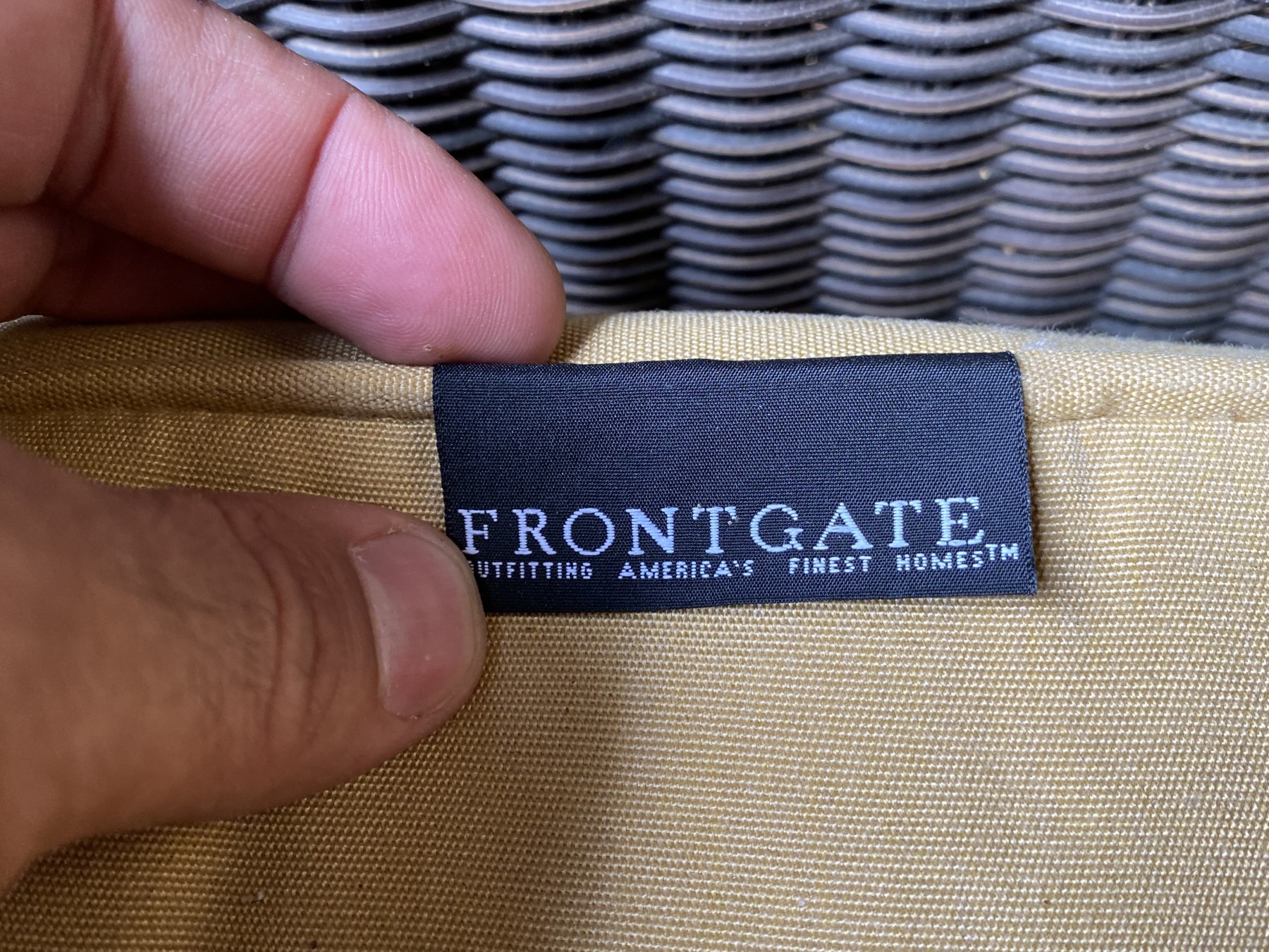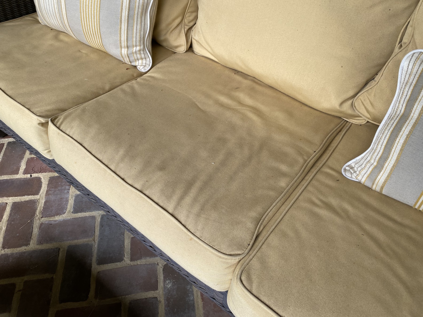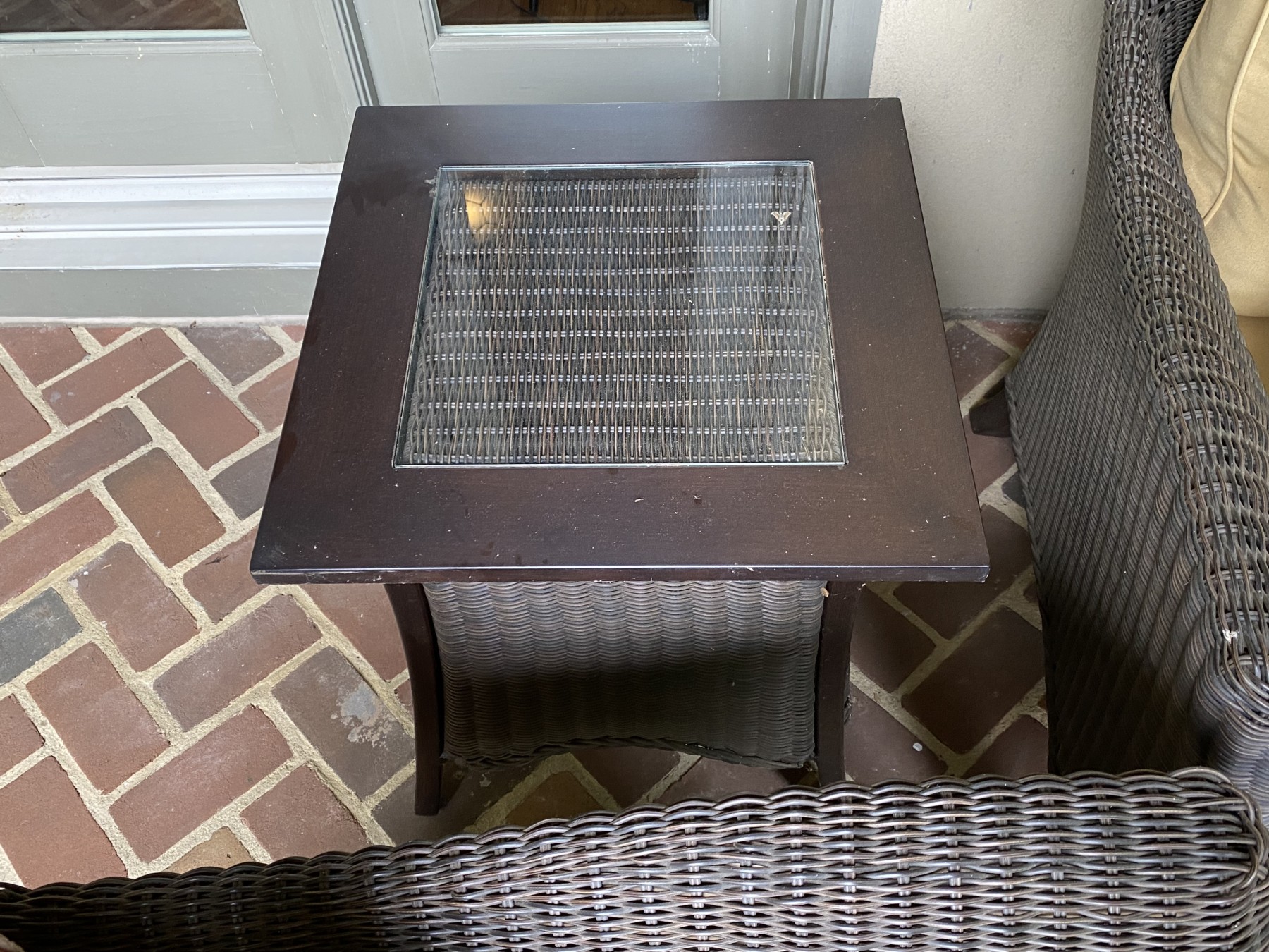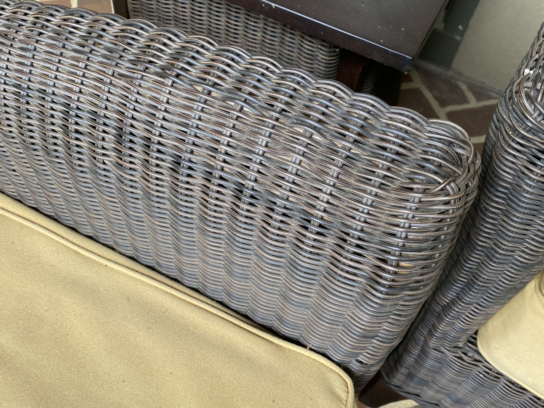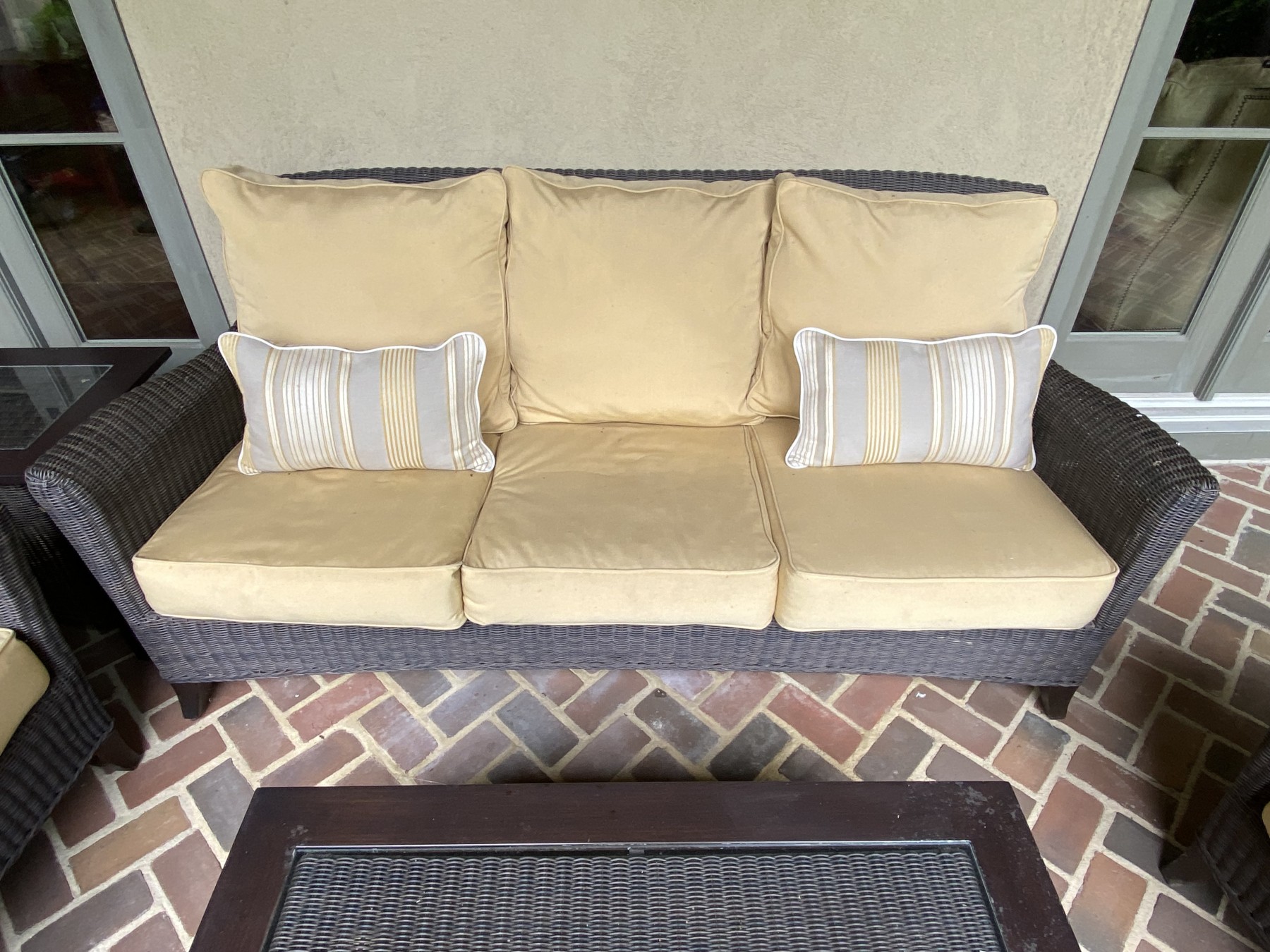 A fantastic suite of Frontgate resin wicker outdoor furniture including a three seater sofa, a loveseat, am armchair, a cocktail table, and a side table. The seating features gently curved rectangular backs and narrow rail armrests, made comfortable with plump yellow back and seat cushions with complimenting accent pillows. The tables are topped with glass with wide dark brown wood borders, tall and subtly arched aprons, and straight tapered legs.