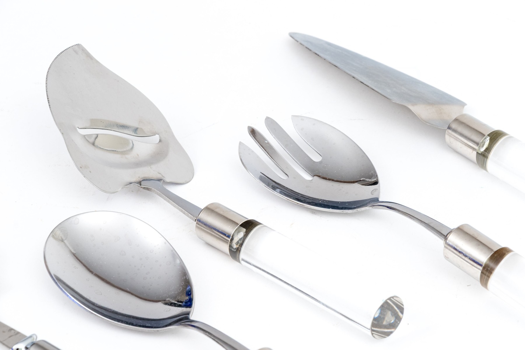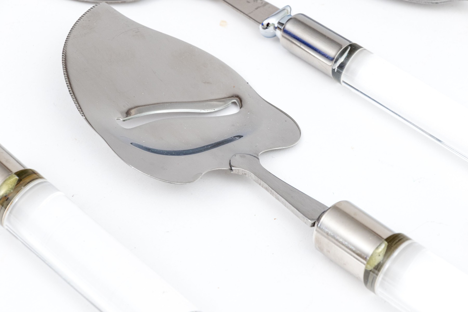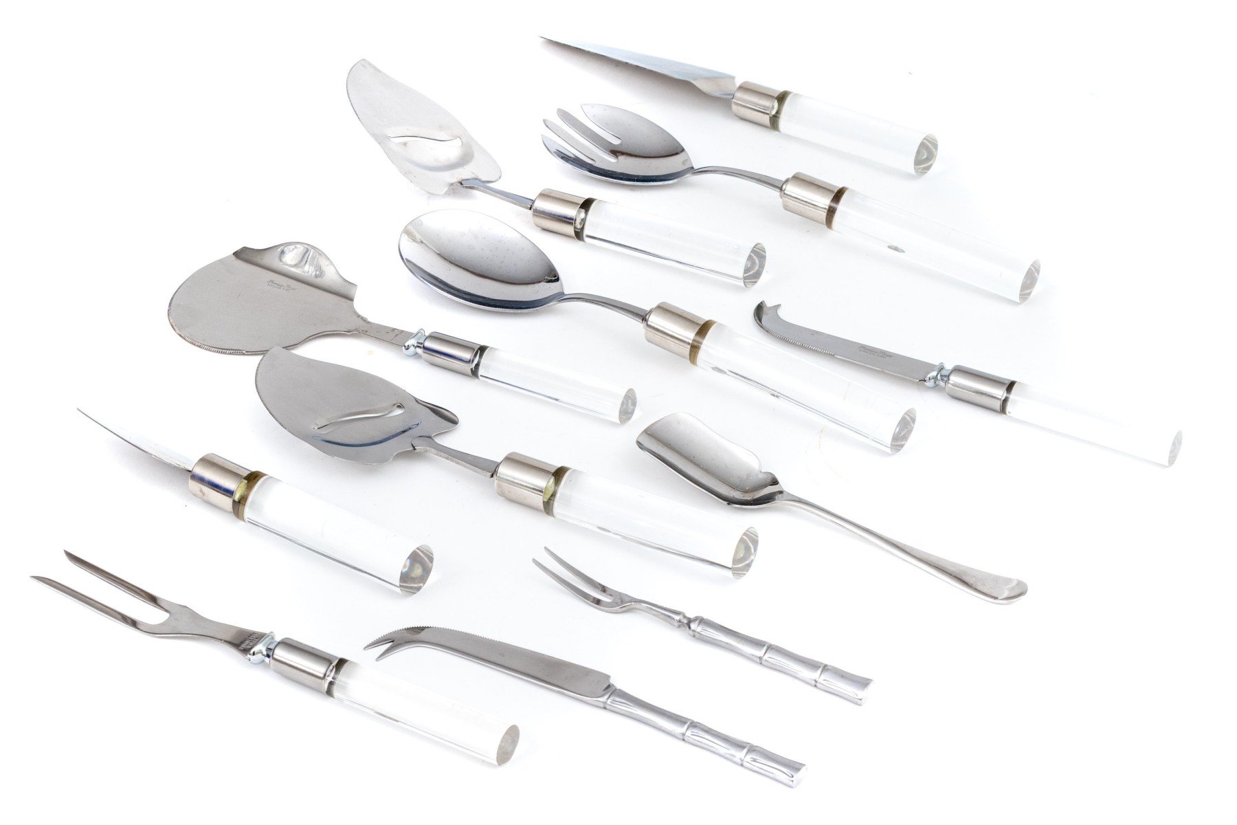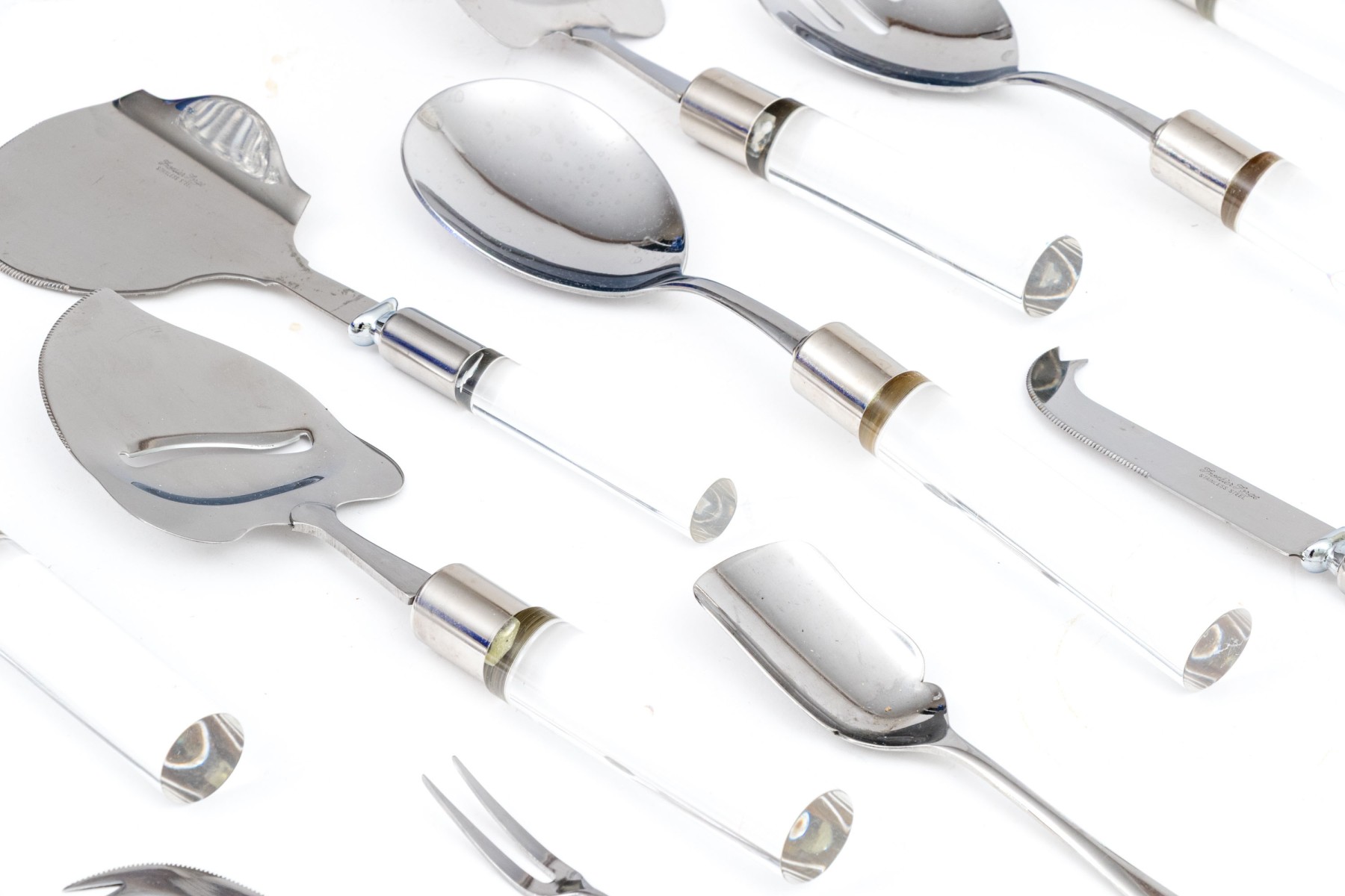 A wonderful collection of Frontier Forge utensils with stainless steel tops and clear acrylic handles, composed of a cheese slicer, cheese knives, medium server, large server, meat fork, two piece salad serving set, and more.