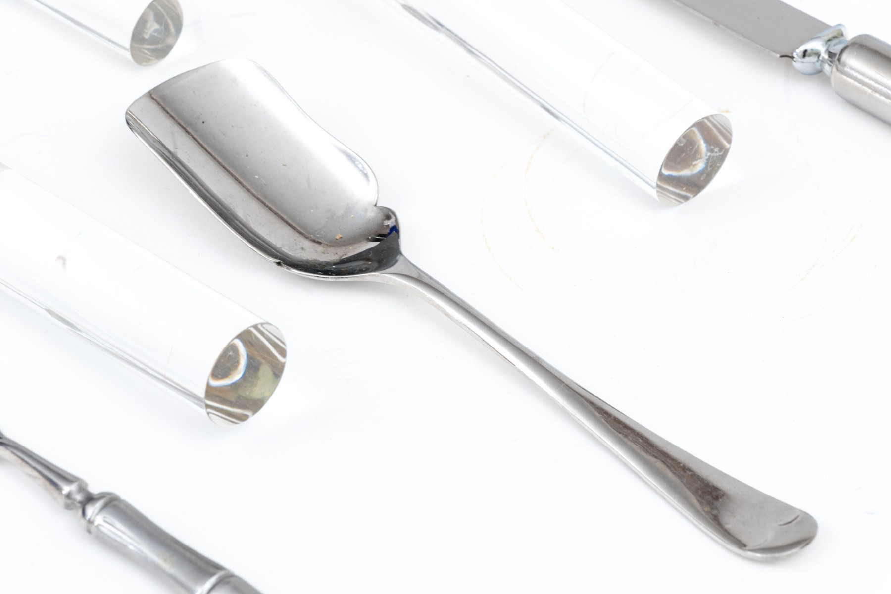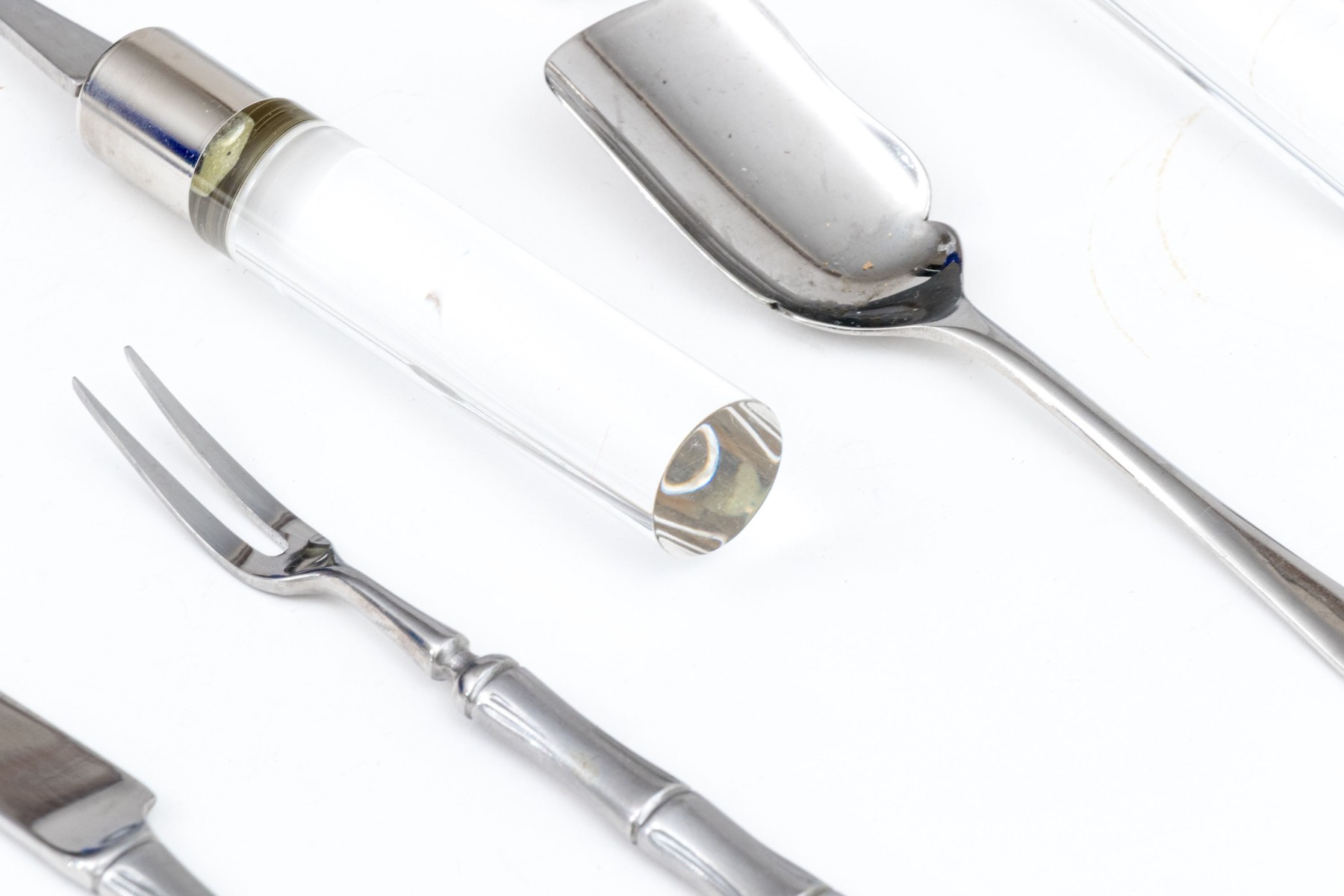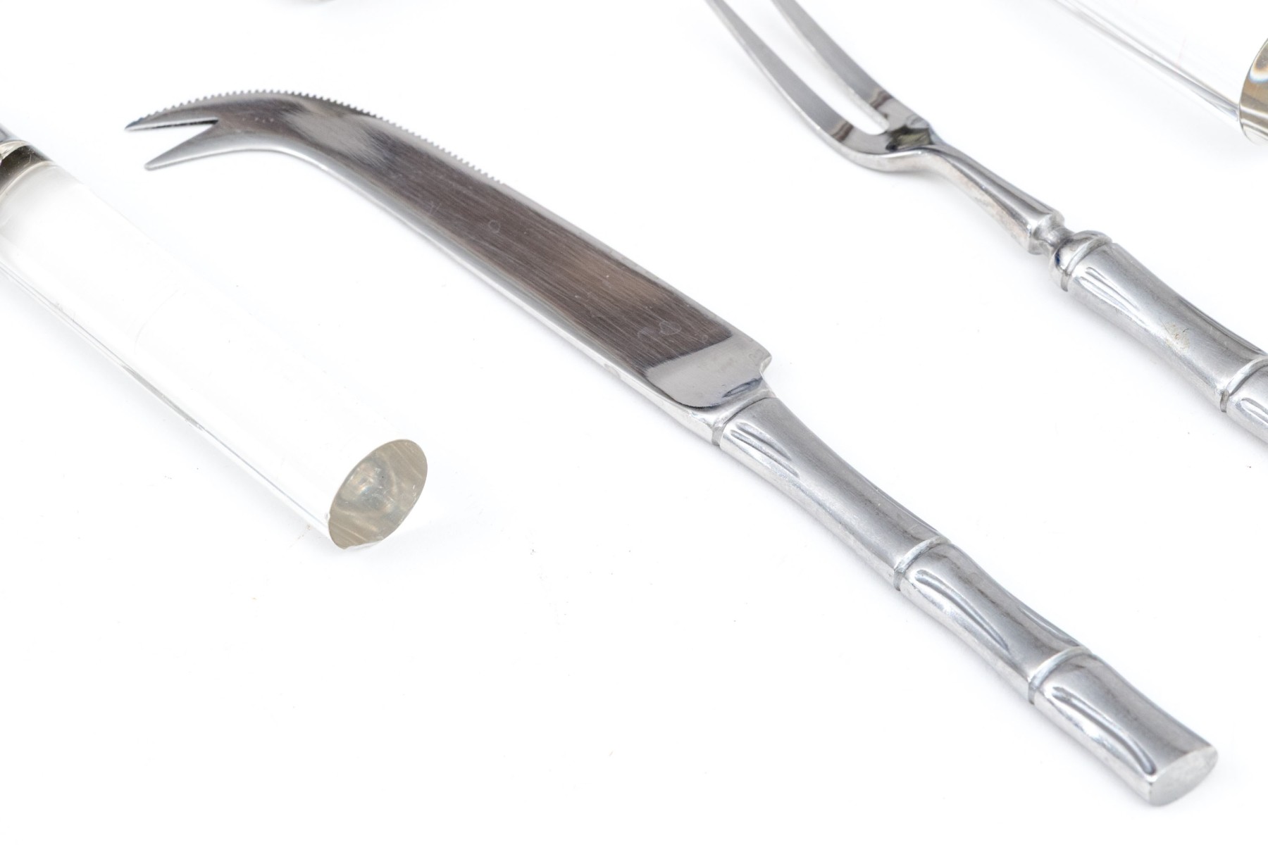 A wonderful collection of Frontier Forge utensils with stainless steel tops and clear acrylic handles, composed of a cheese slicer, cheese knives, medium server, large server, meat fork, two piece salad serving set, and more.