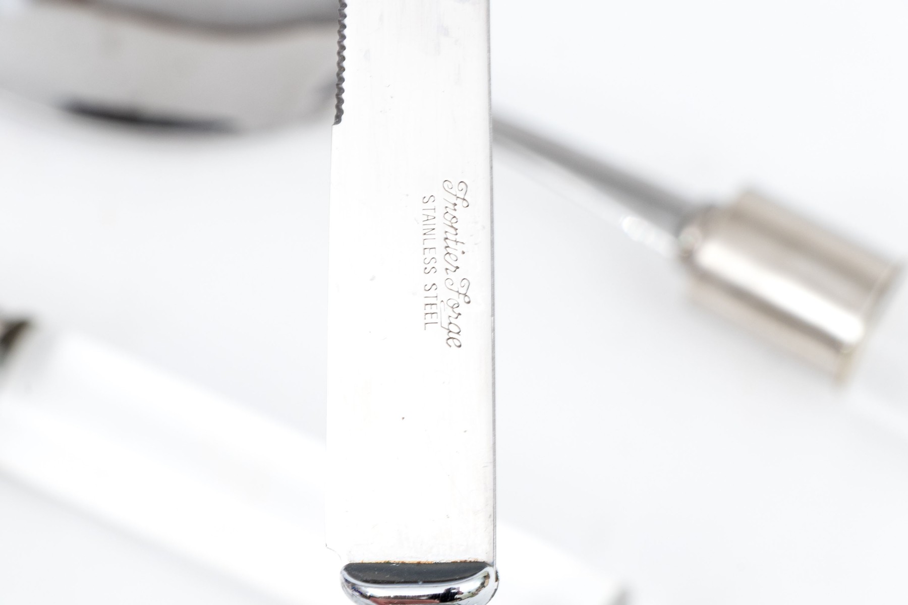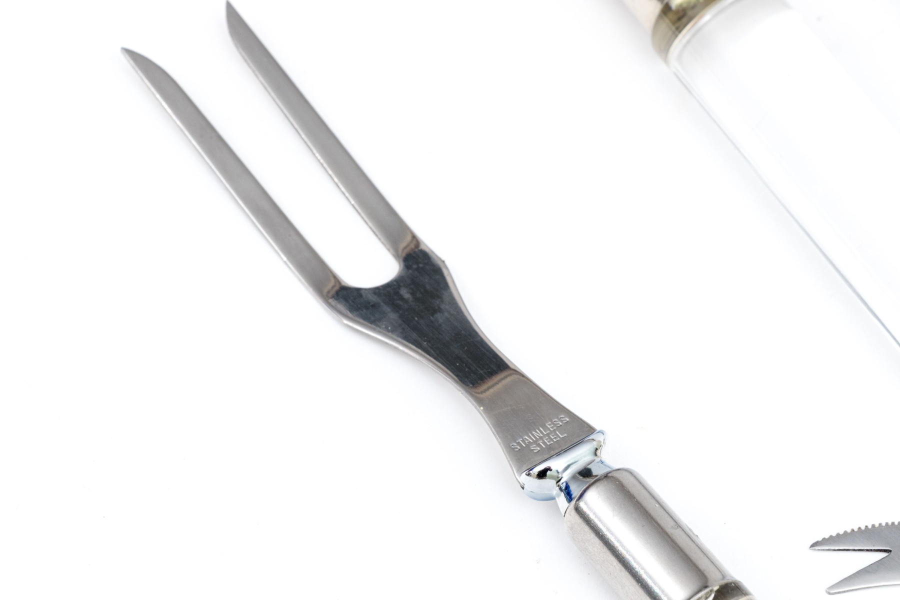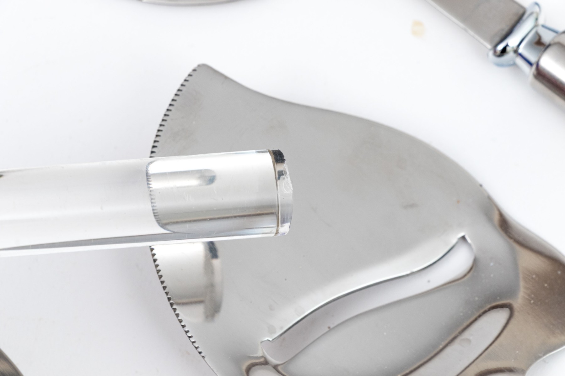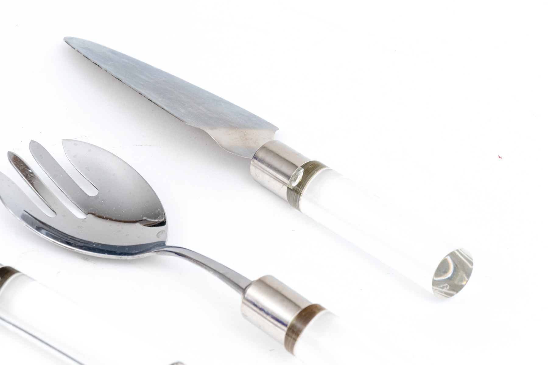 A wonderful collection of Frontier Forge utensils with stainless steel tops and clear acrylic handles, composed of a cheese slicer, cheese knives, medium server, large server, meat fork, two piece salad serving set, and more.