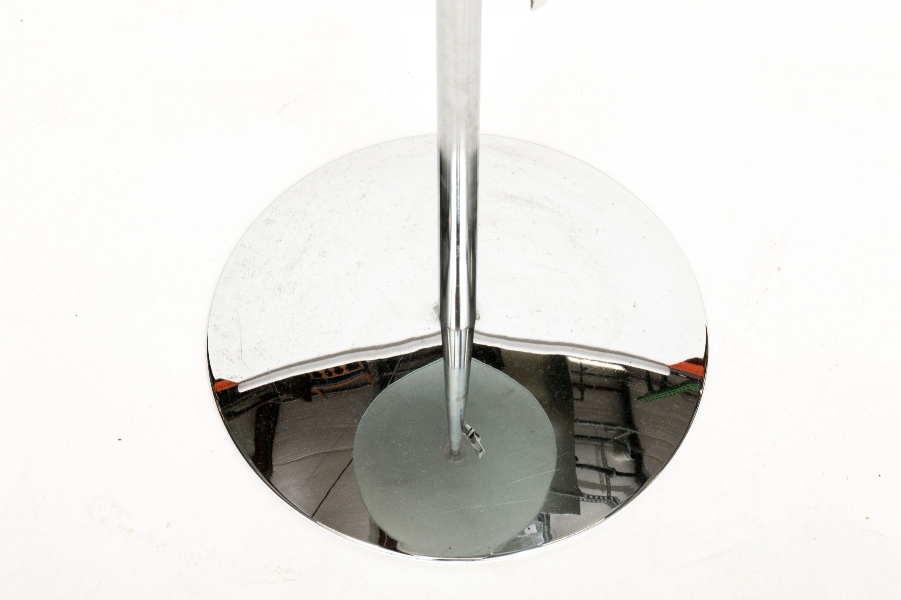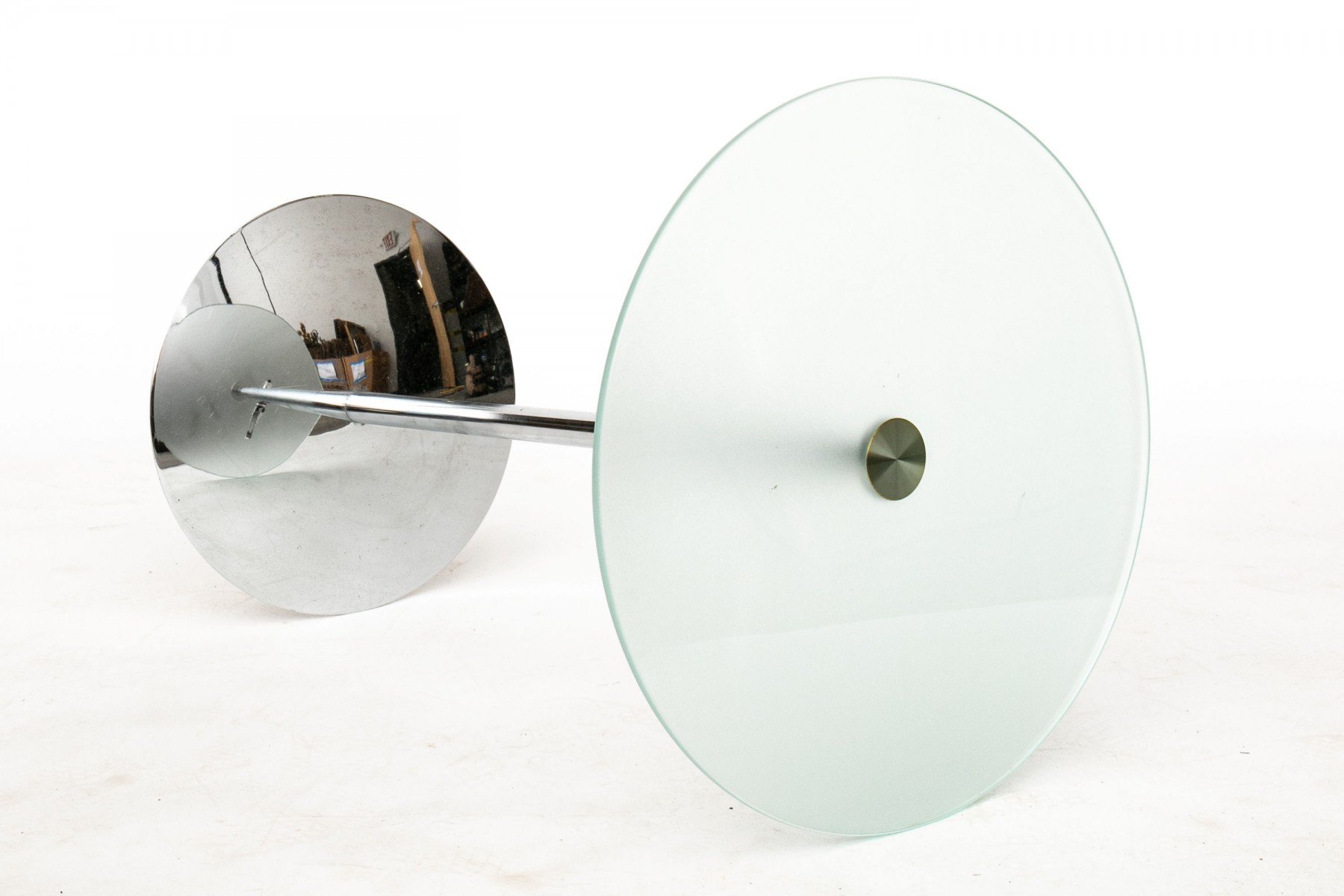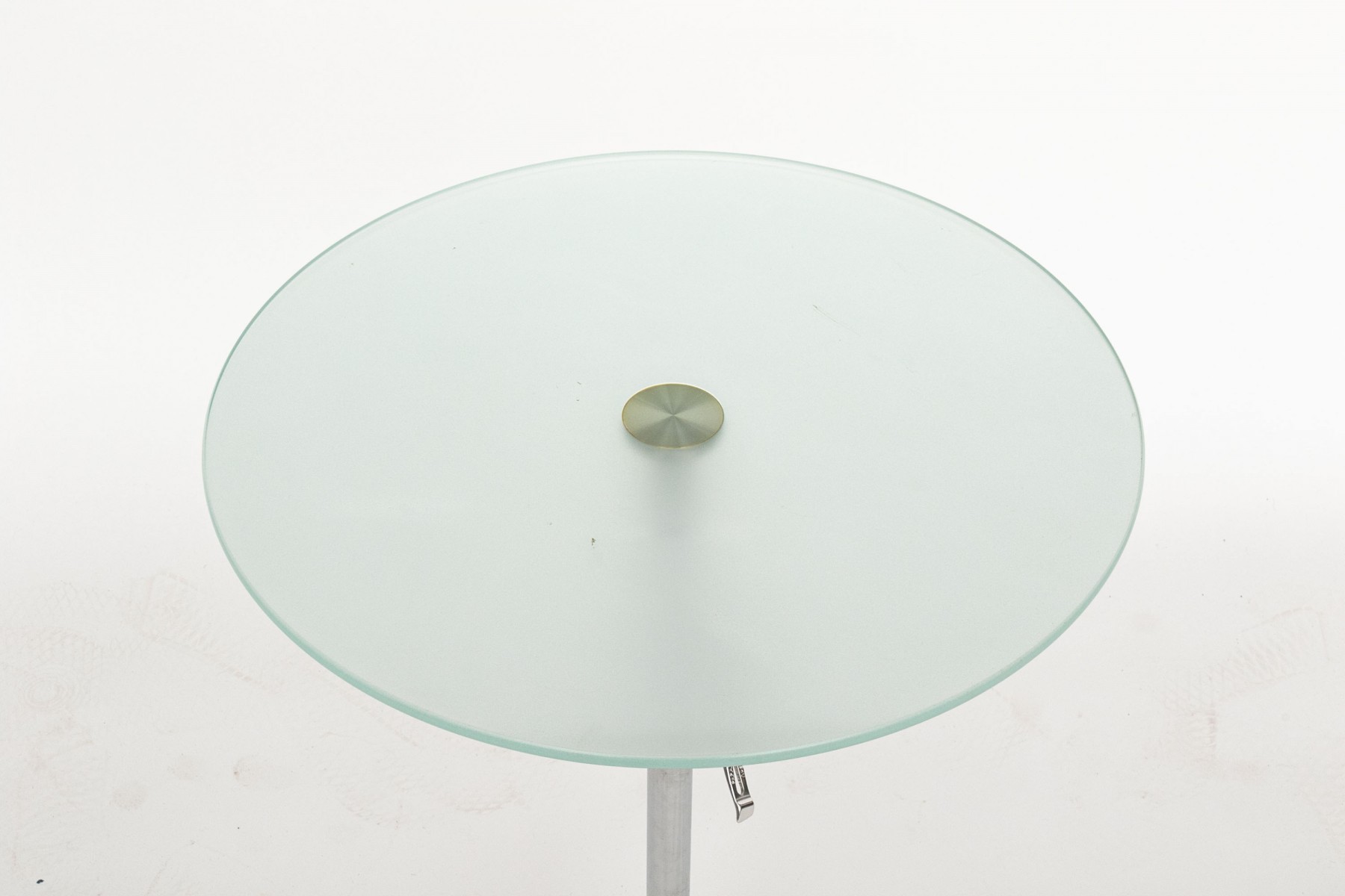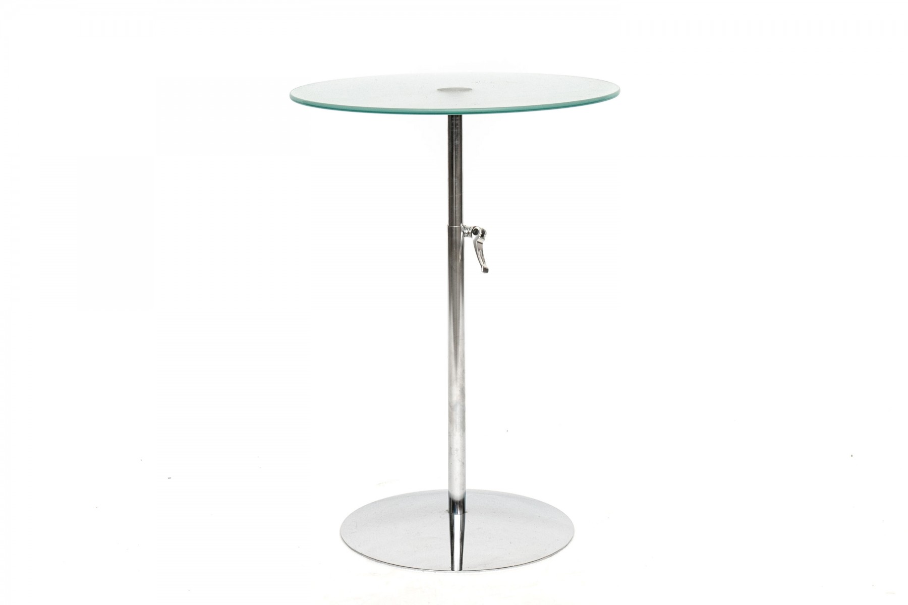 Accent table with circular frosted glass supported on a chrome-tone standard mounted on a circular base. A centralized latch is seen possibly for expanding the height, or possibly just decorative.