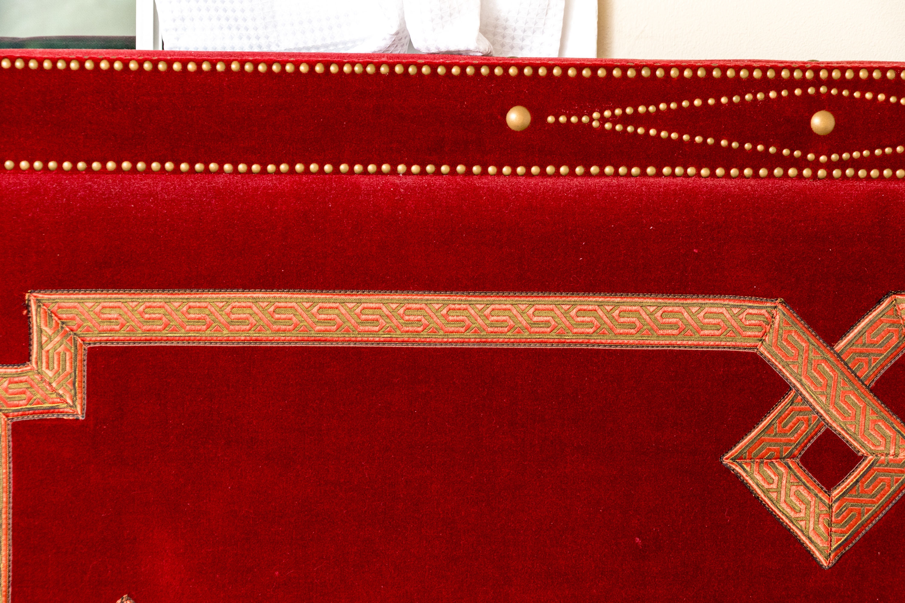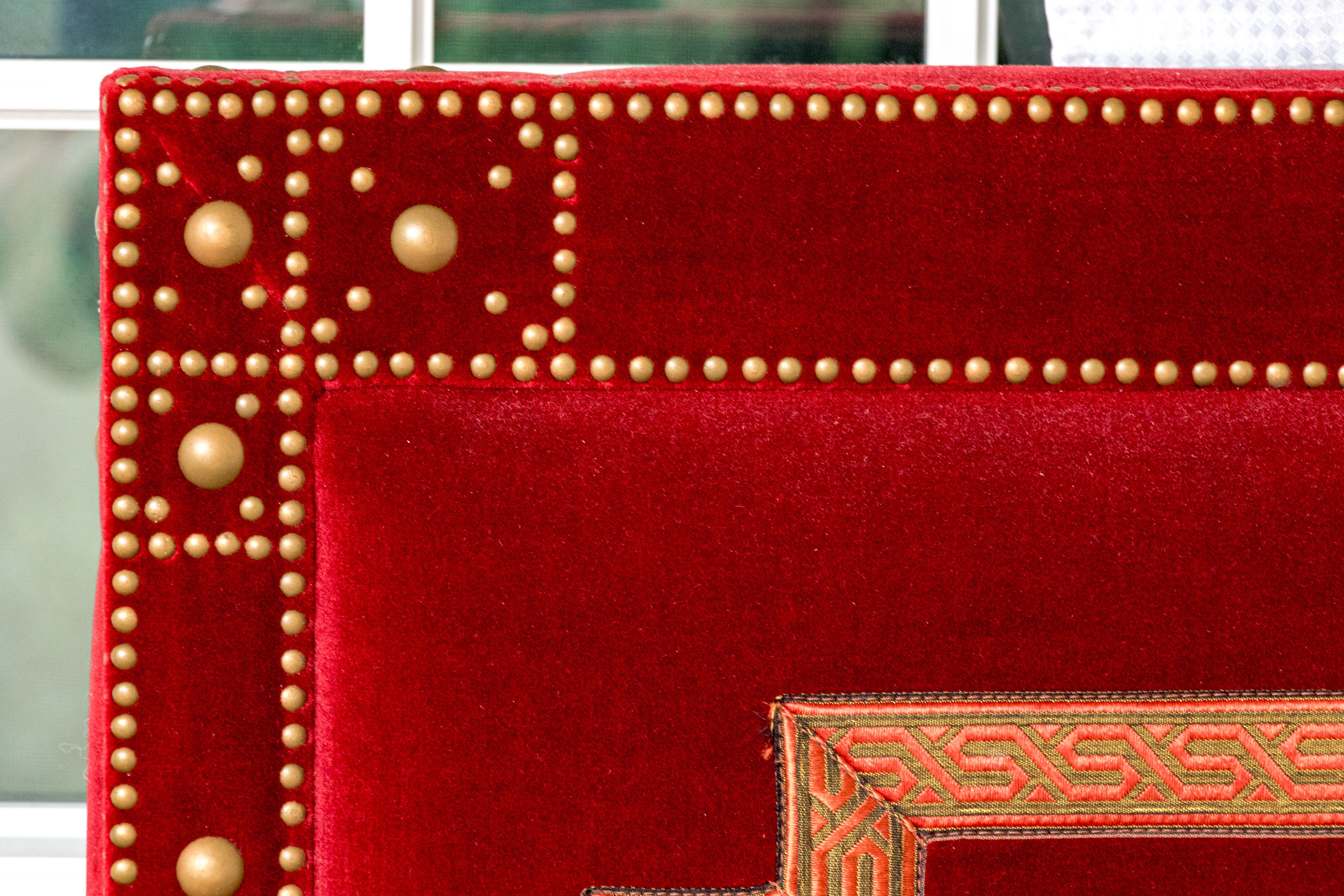 Red upholstery with decorative banding with stylized diamond motifs with tack nailhead trim around. Each on carved and stained feet that add approx 1 1/2" to the length on each foot. Provenance: Purchased at the auction for Gramercy Hotel.