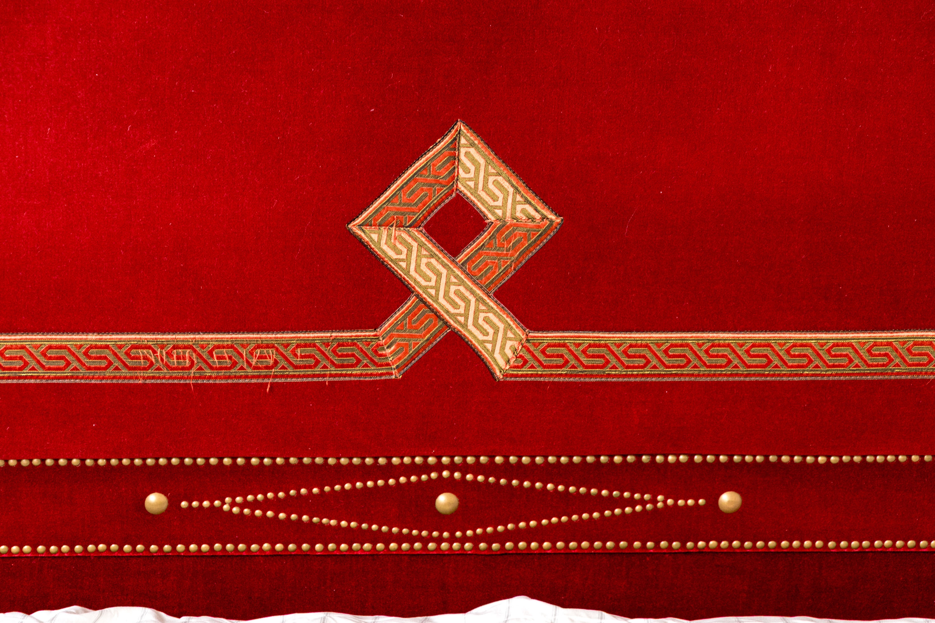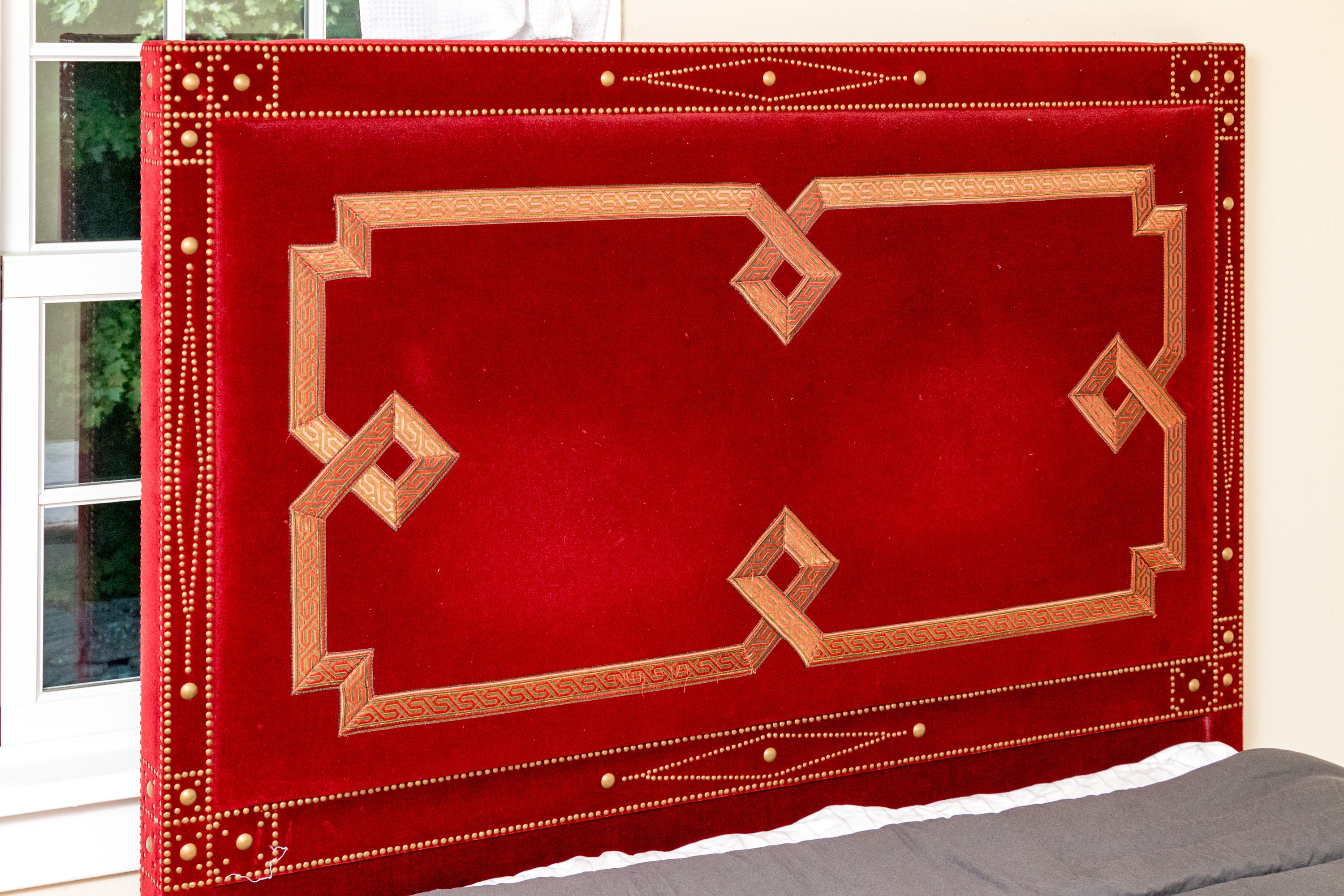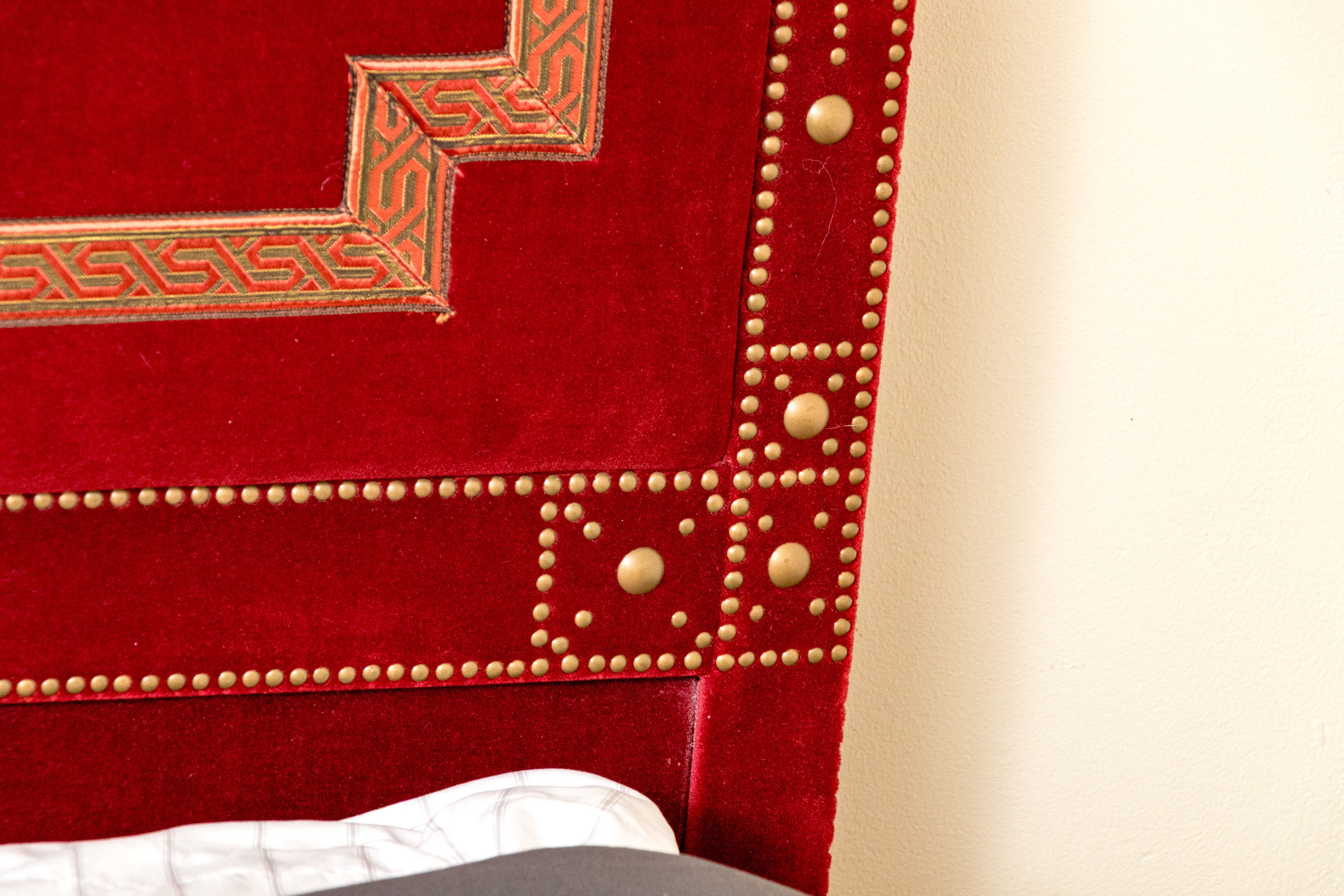 Red upholstery with decorative banding with stylized diamond motifs with tack nailhead trim around. Each on carved and stained feet that add approx 1 1/2" to the length on each foot. Provenance: Purchased at the auction for Gramercy Hotel.