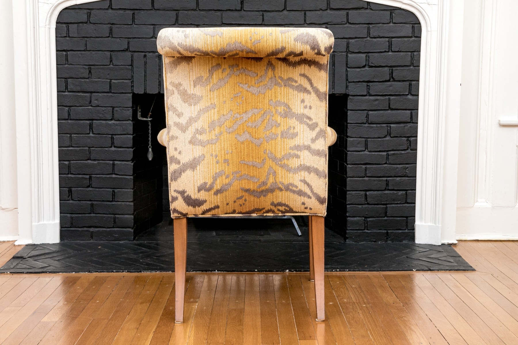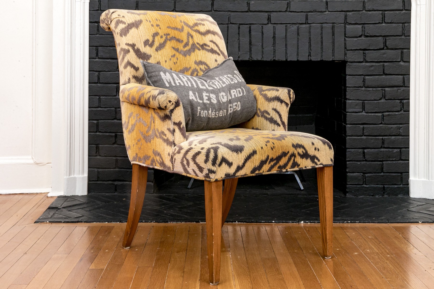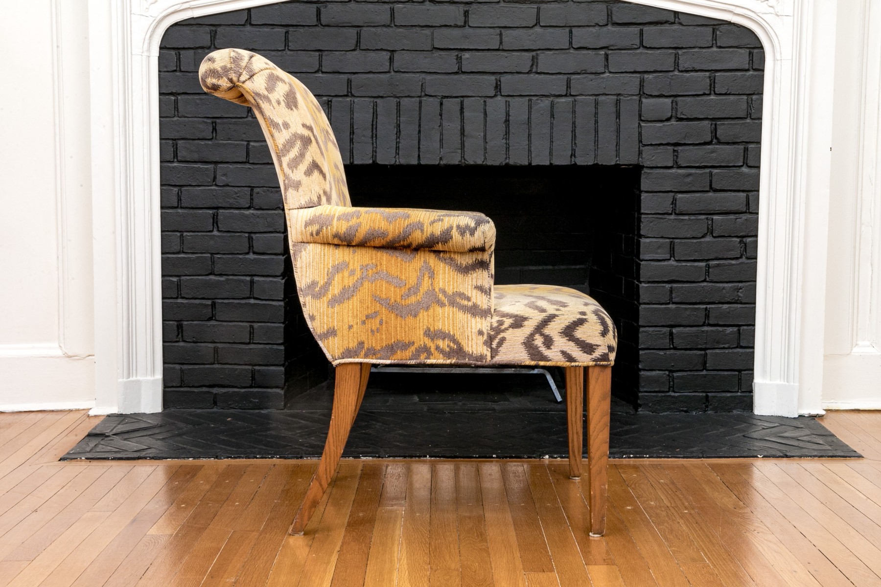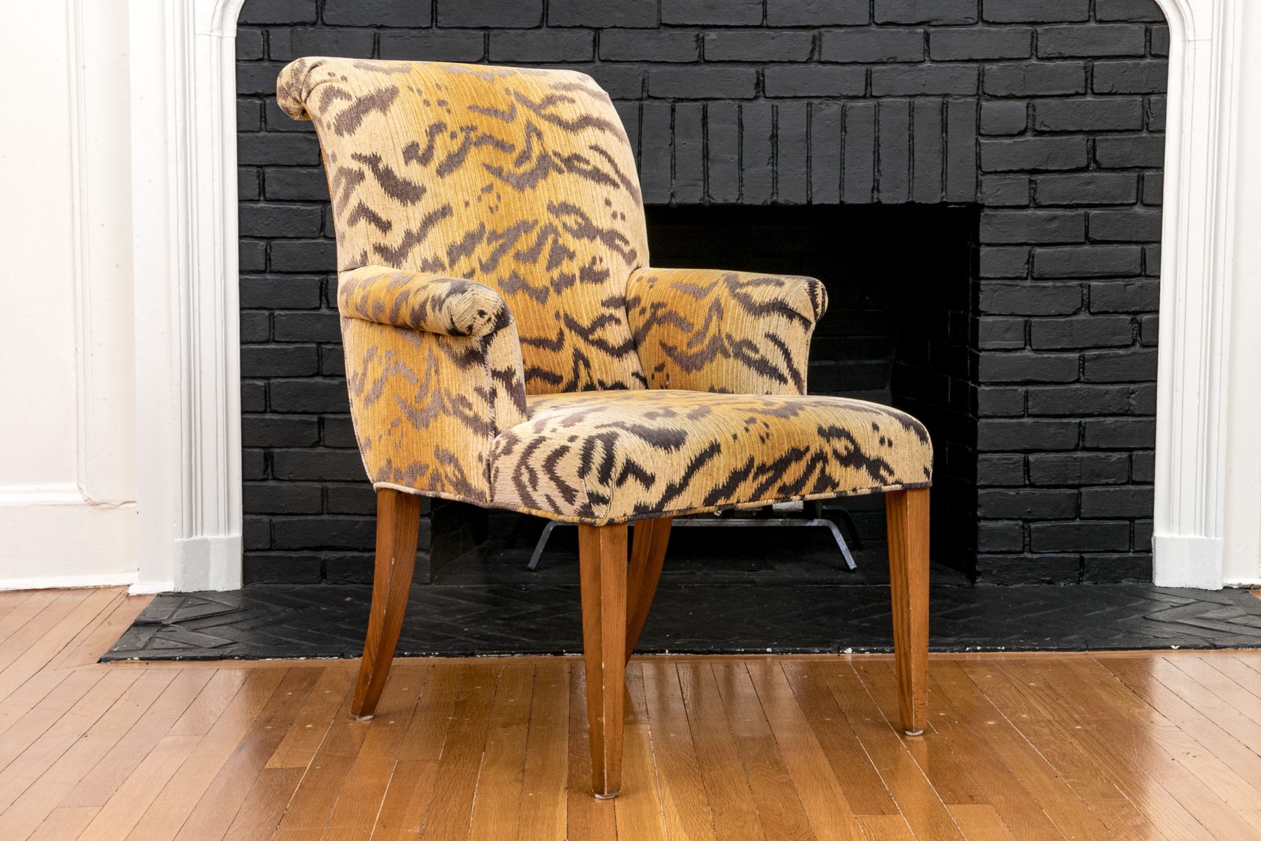 Add a playful touch to your living space with this fun animal print upholstered armchair. Featuring charming rolled arms and a curved back, on tapered legs. The eye-catching animal print fabric adds a whimsical flair to any room