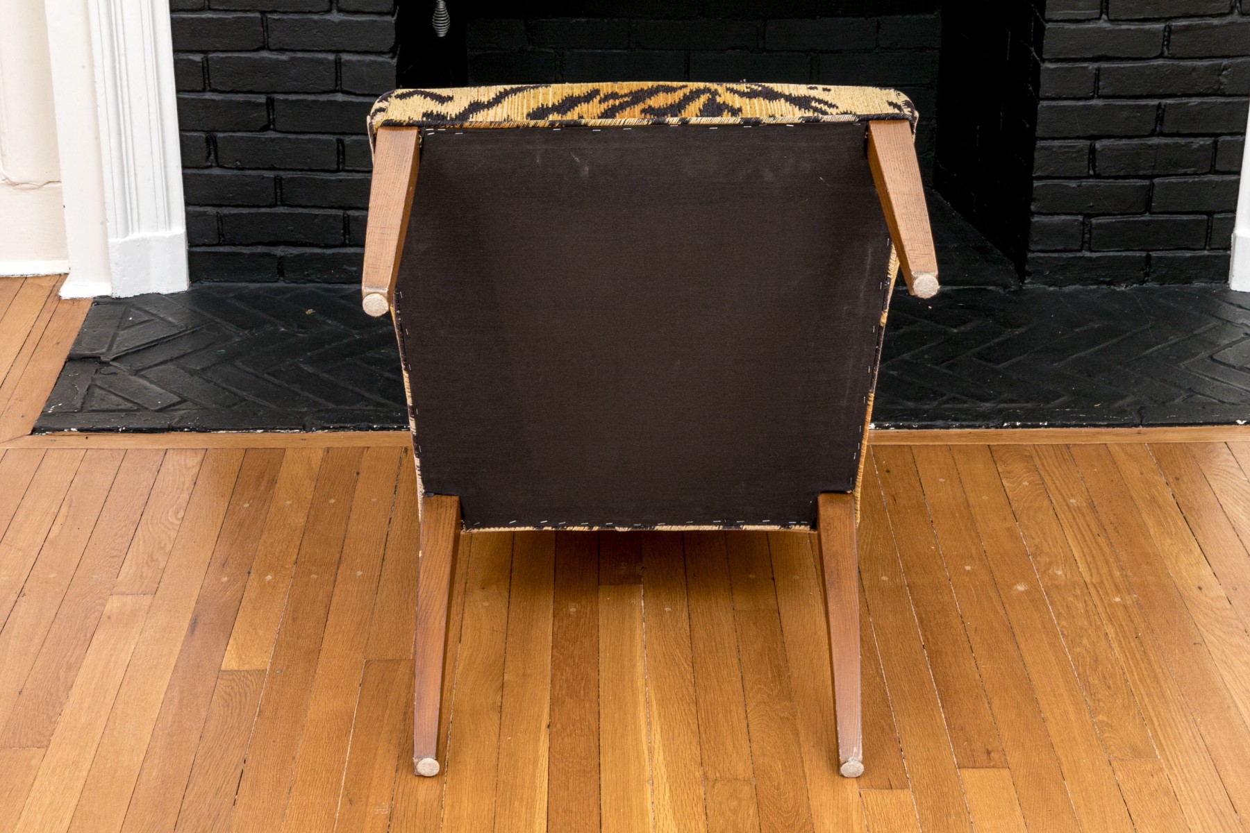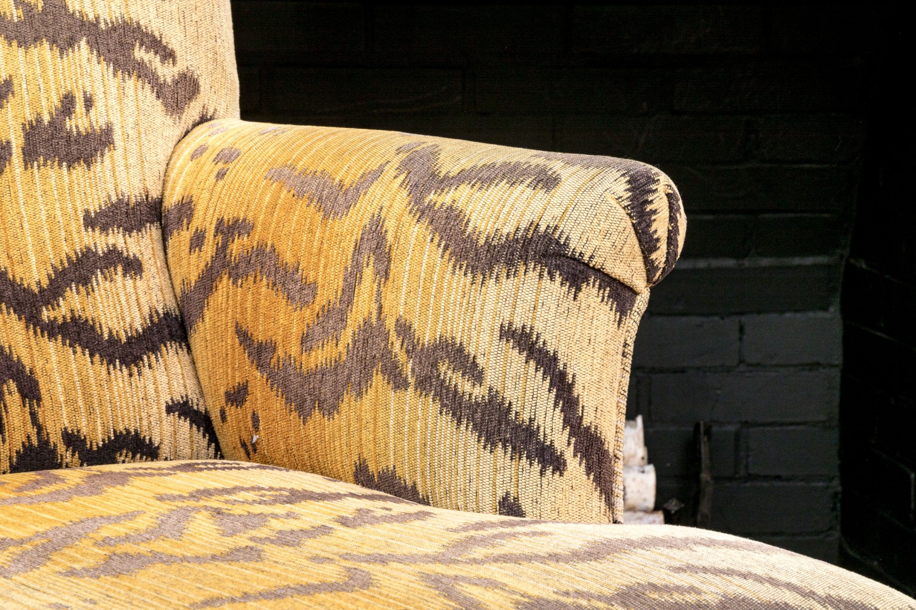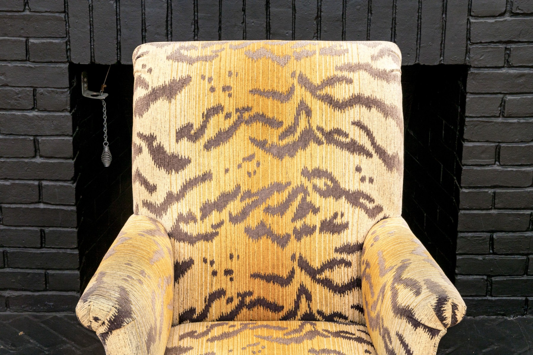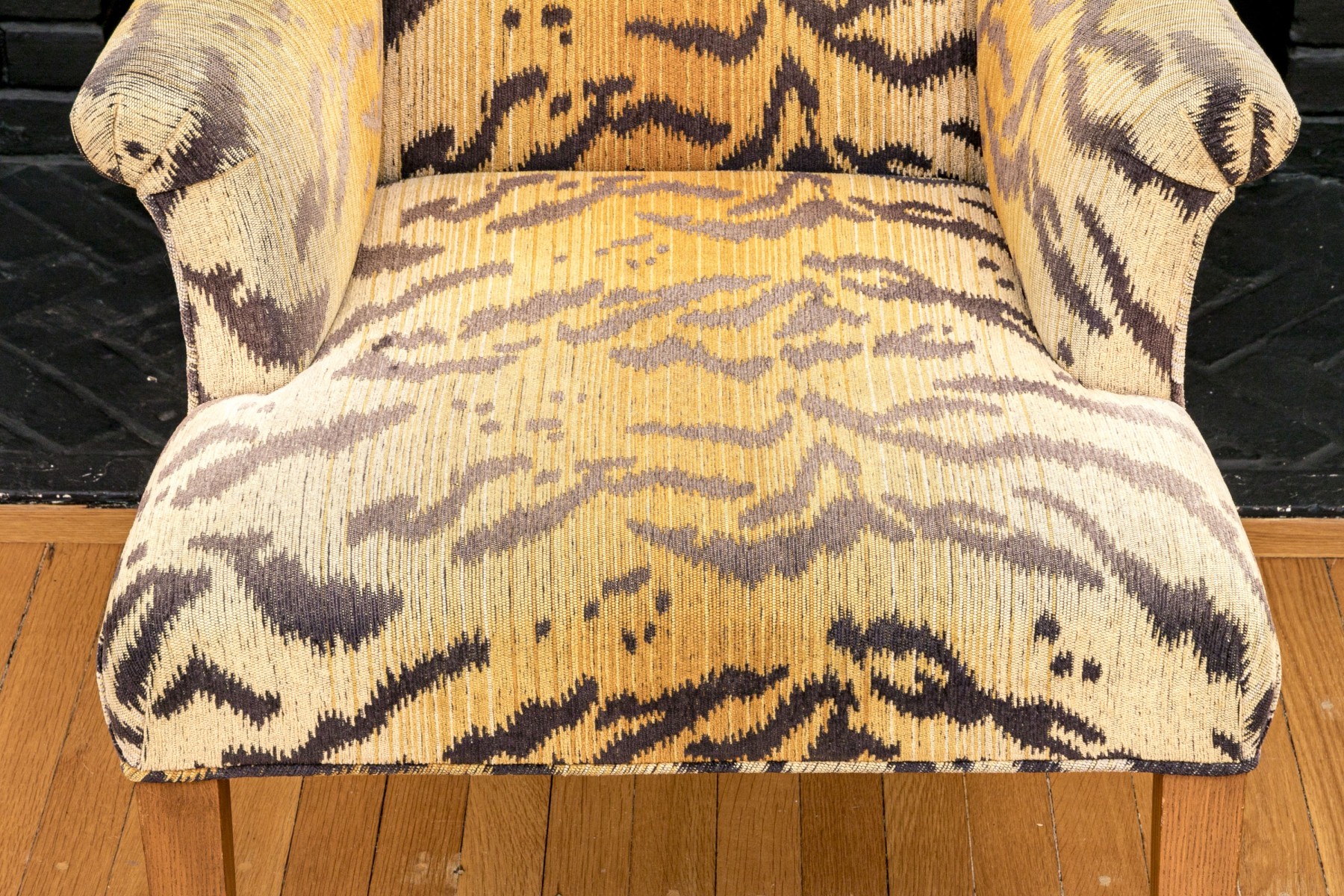 Add a playful touch to your living space with this fun animal print upholstered armchair. Featuring charming rolled arms and a curved back, on tapered legs. The eye-catching animal print fabric adds a whimsical flair to any room