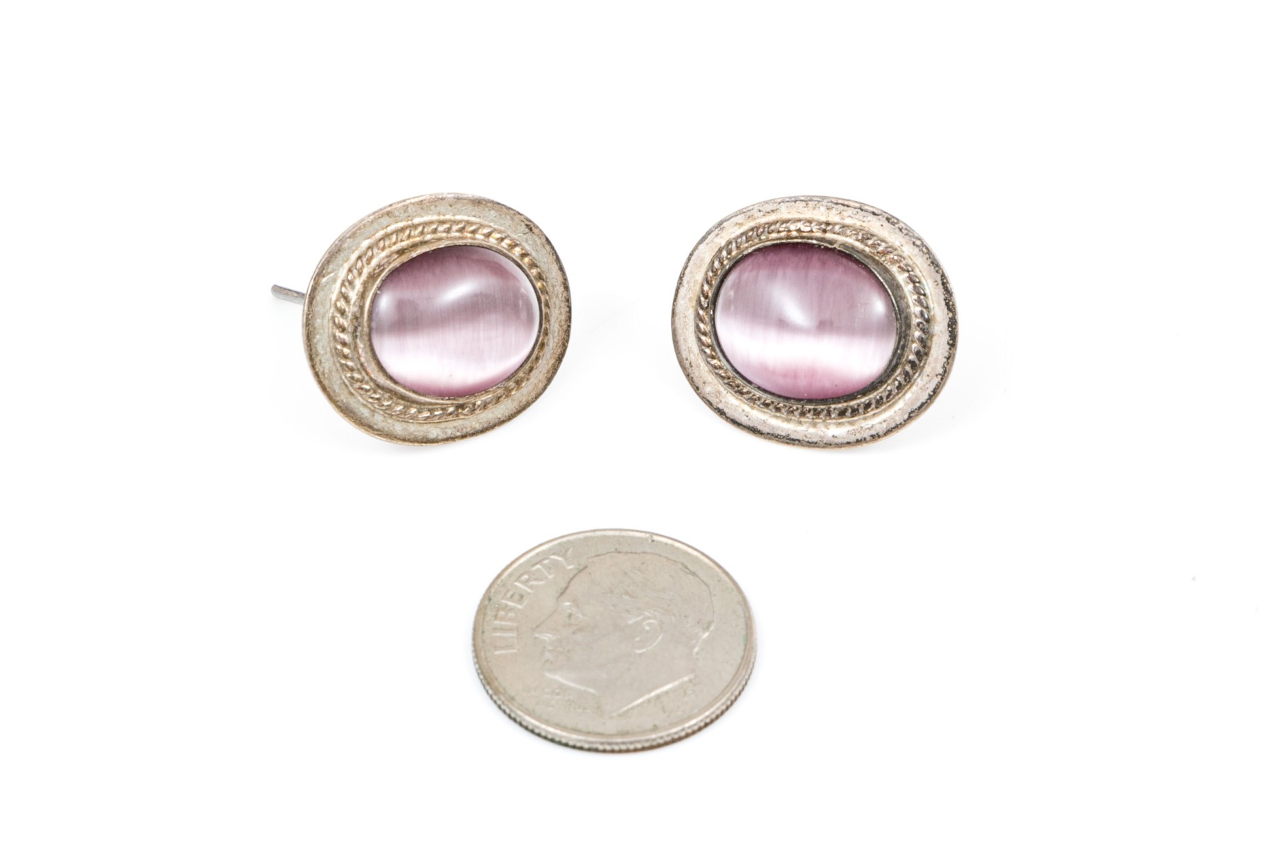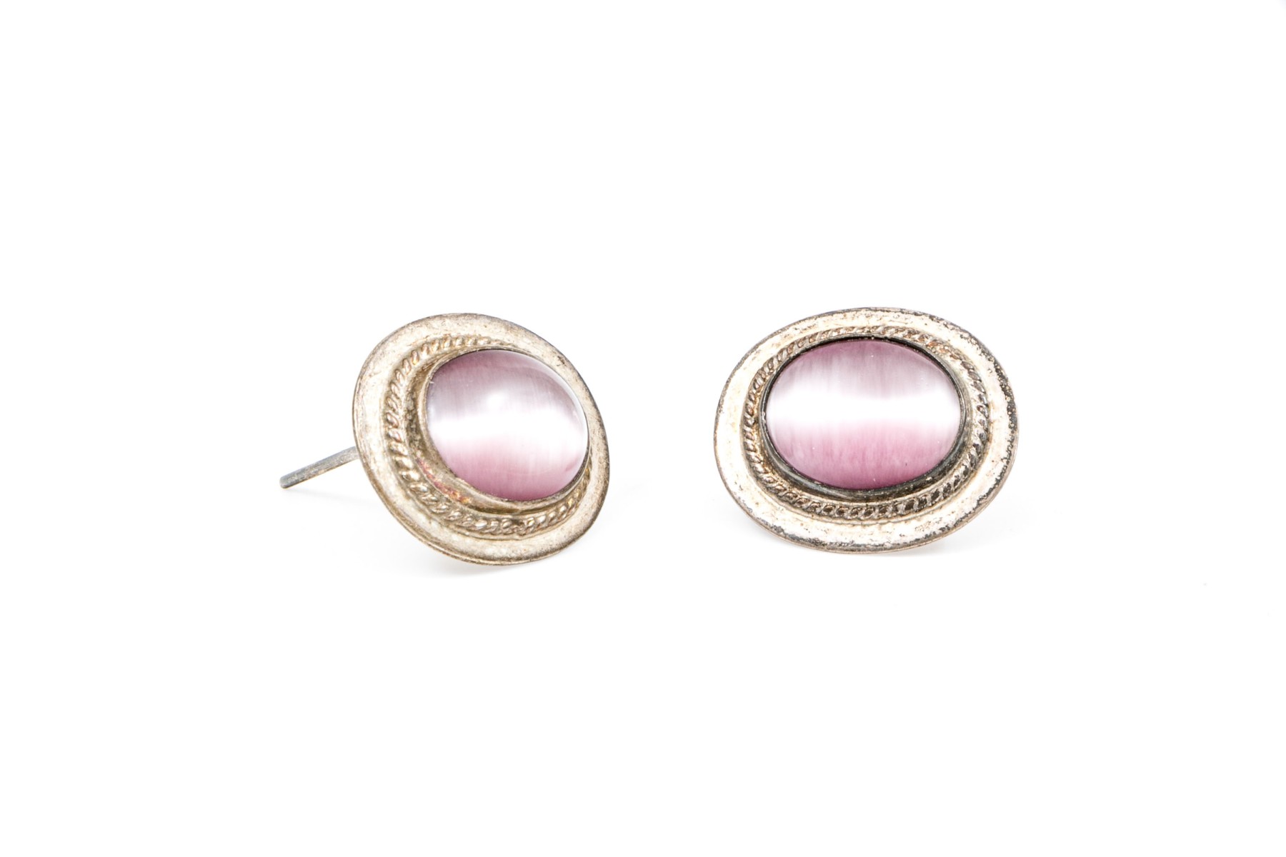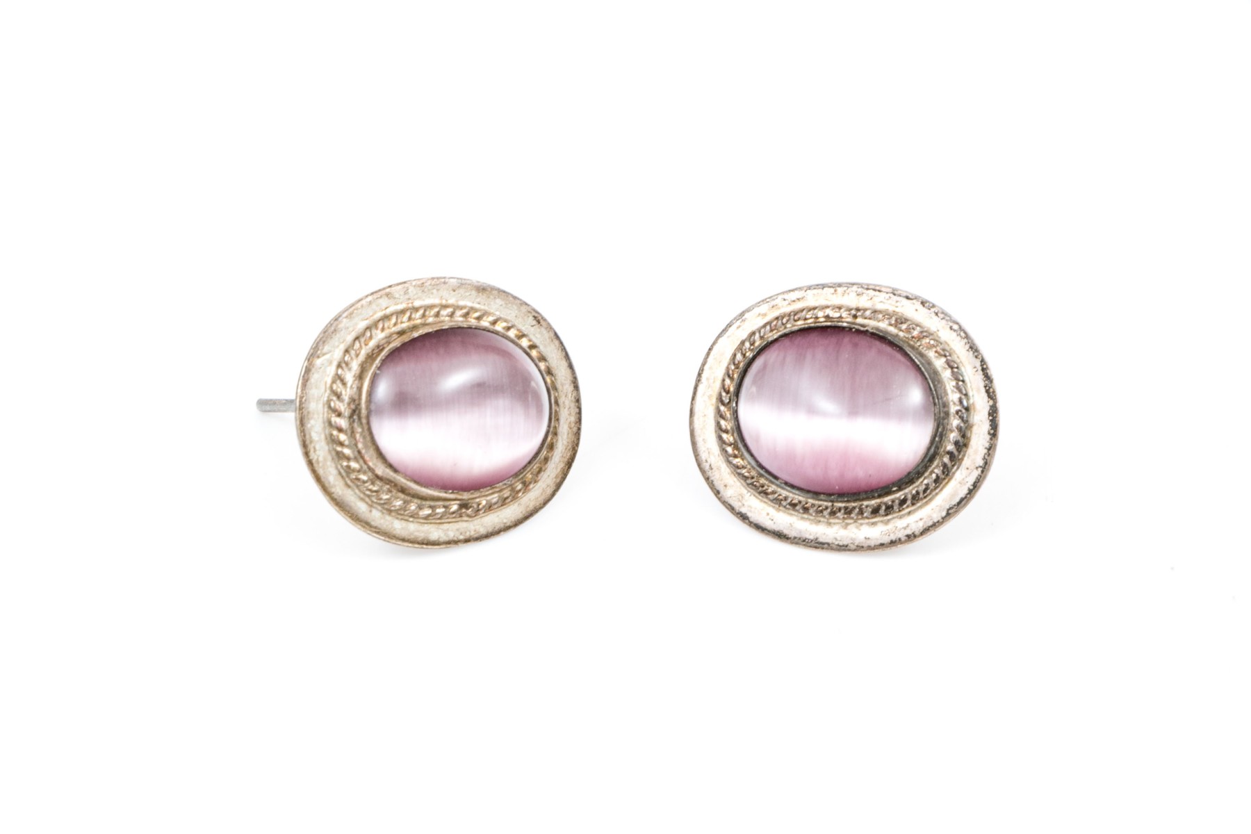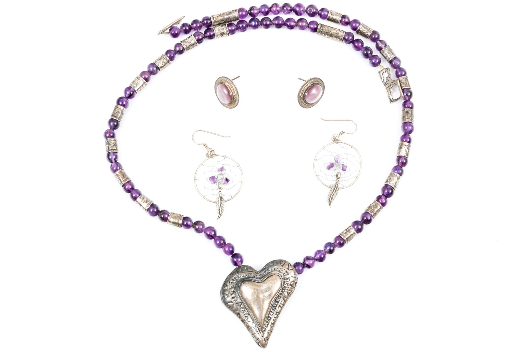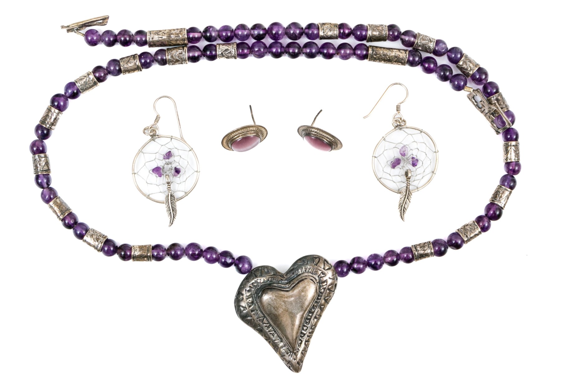 Fun collection of purple motif jewelry including an amethyst bead necklace, synthetic cats eye earrings, and silver plated dream catcher earrings