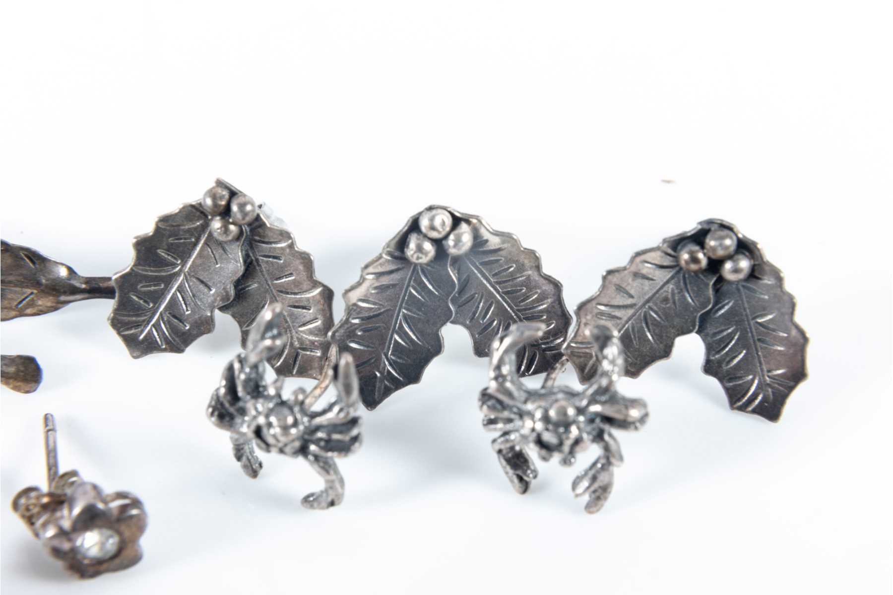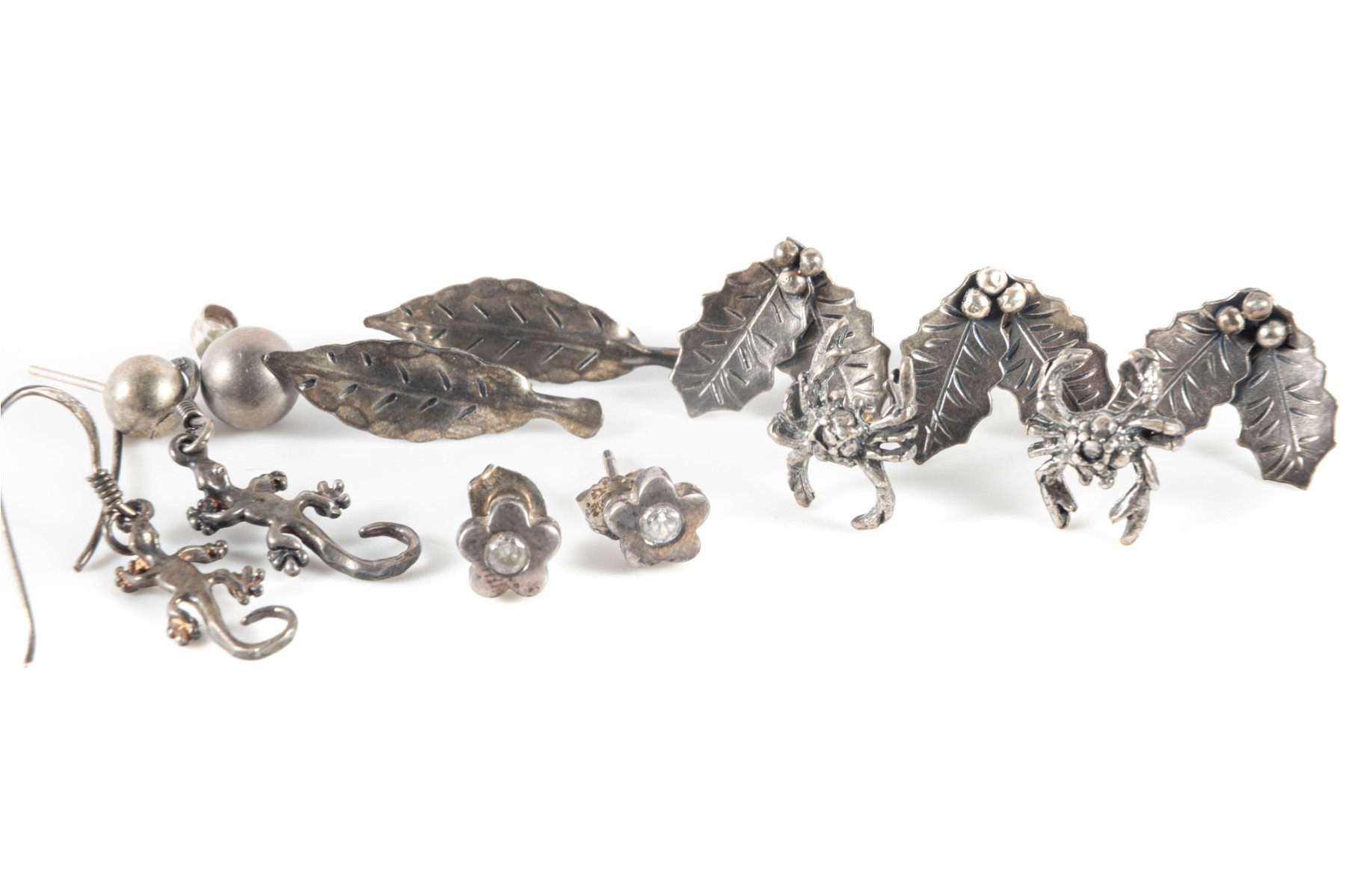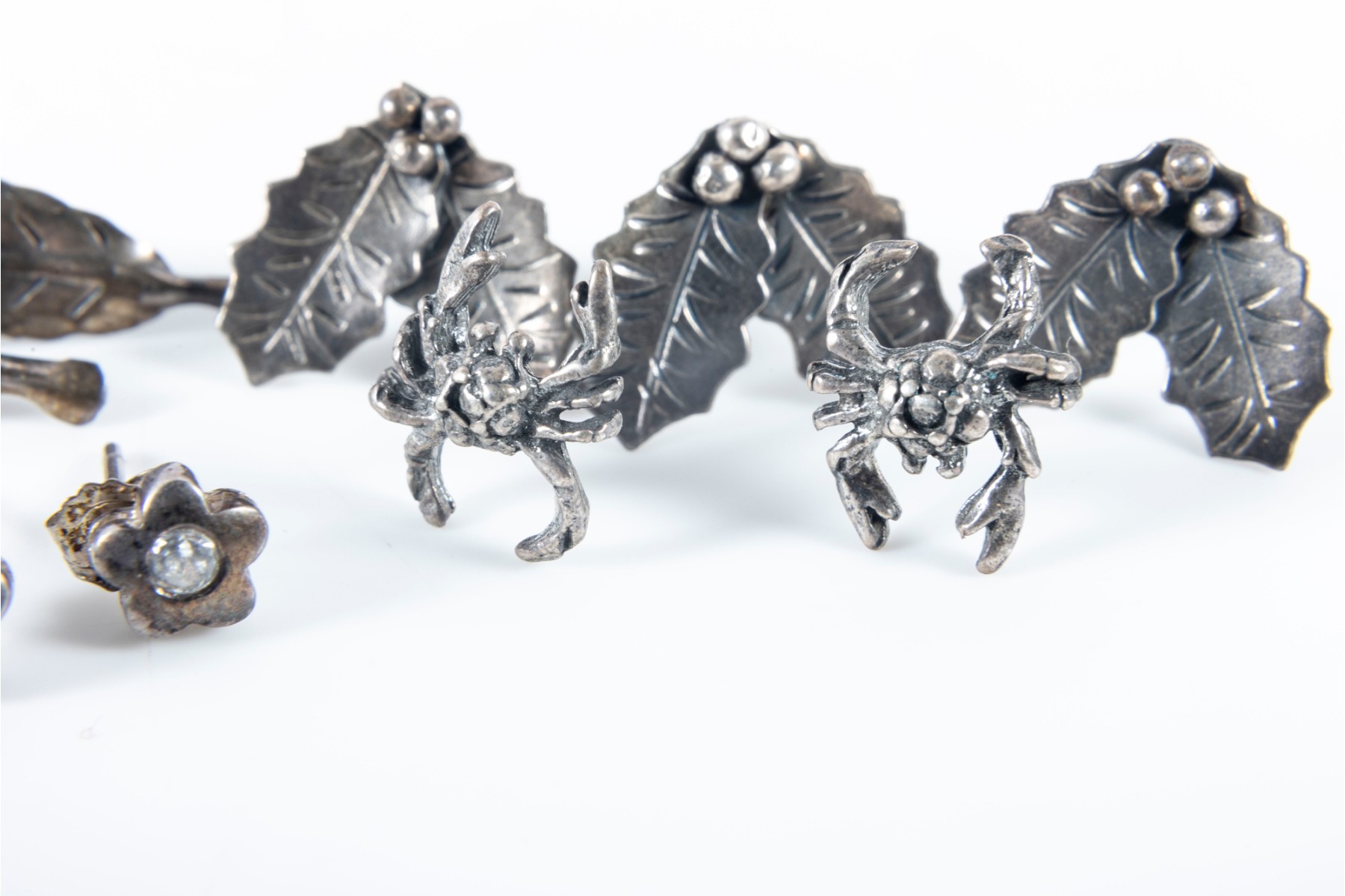 A collection of fun figural sterling silver earrings, including holly, leaves, flowers, lizards, and crabs. The flower studs are accented with round glass.