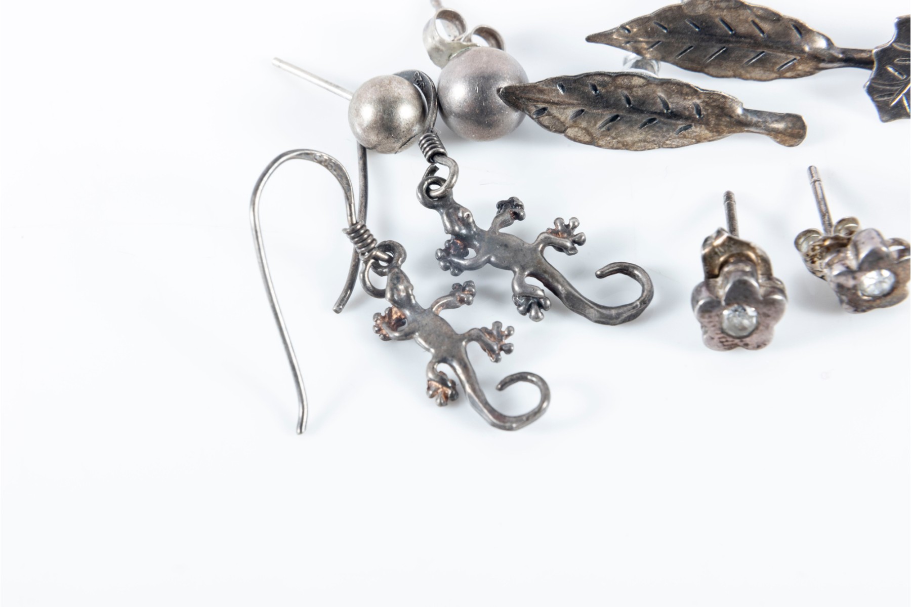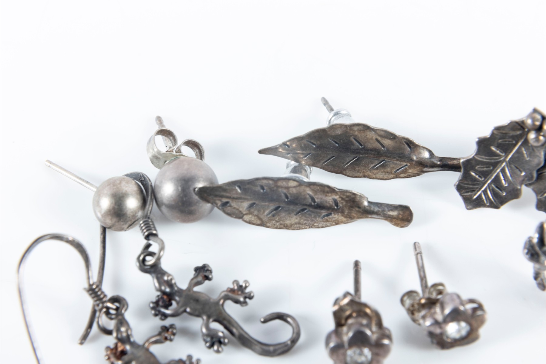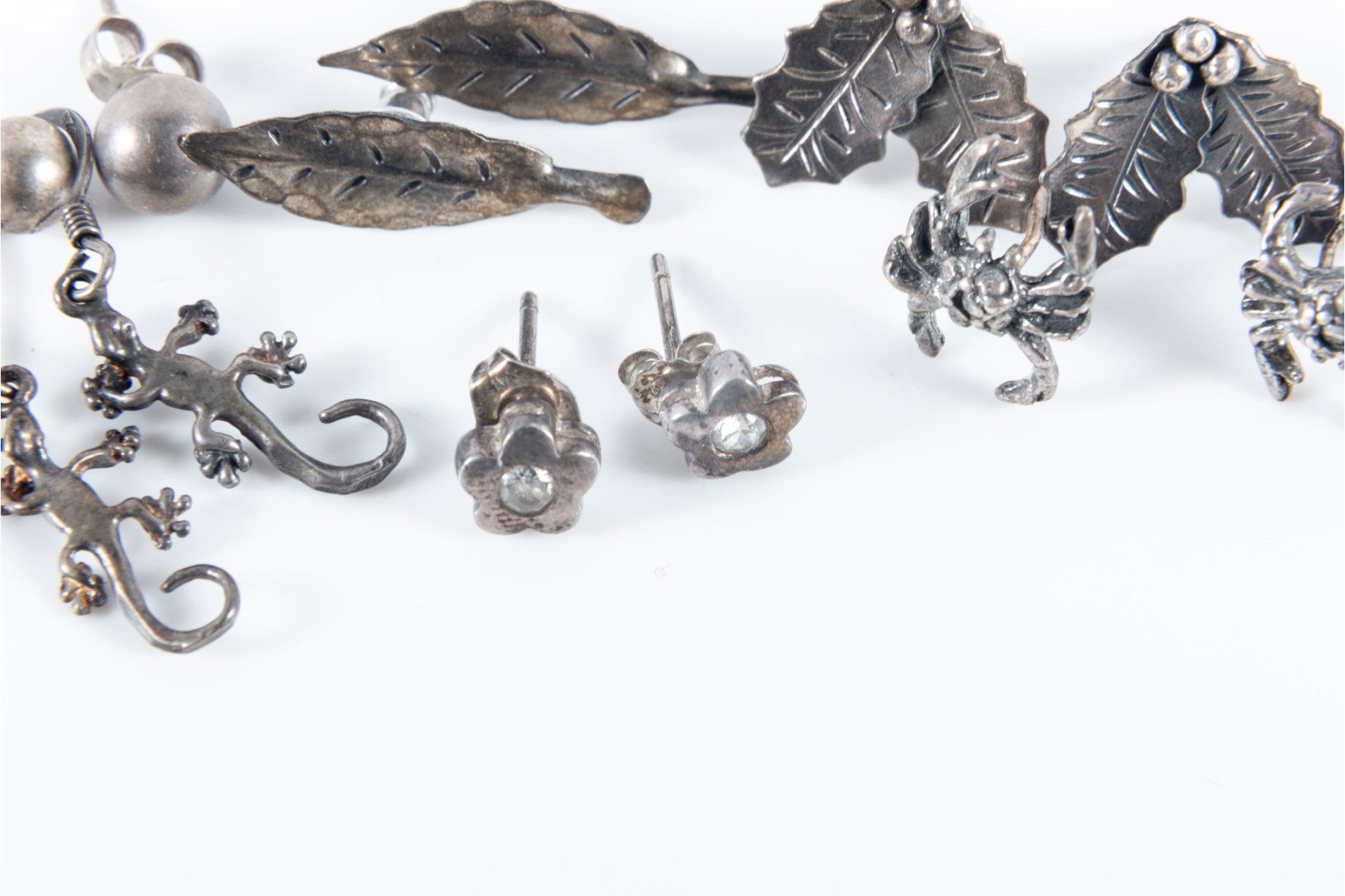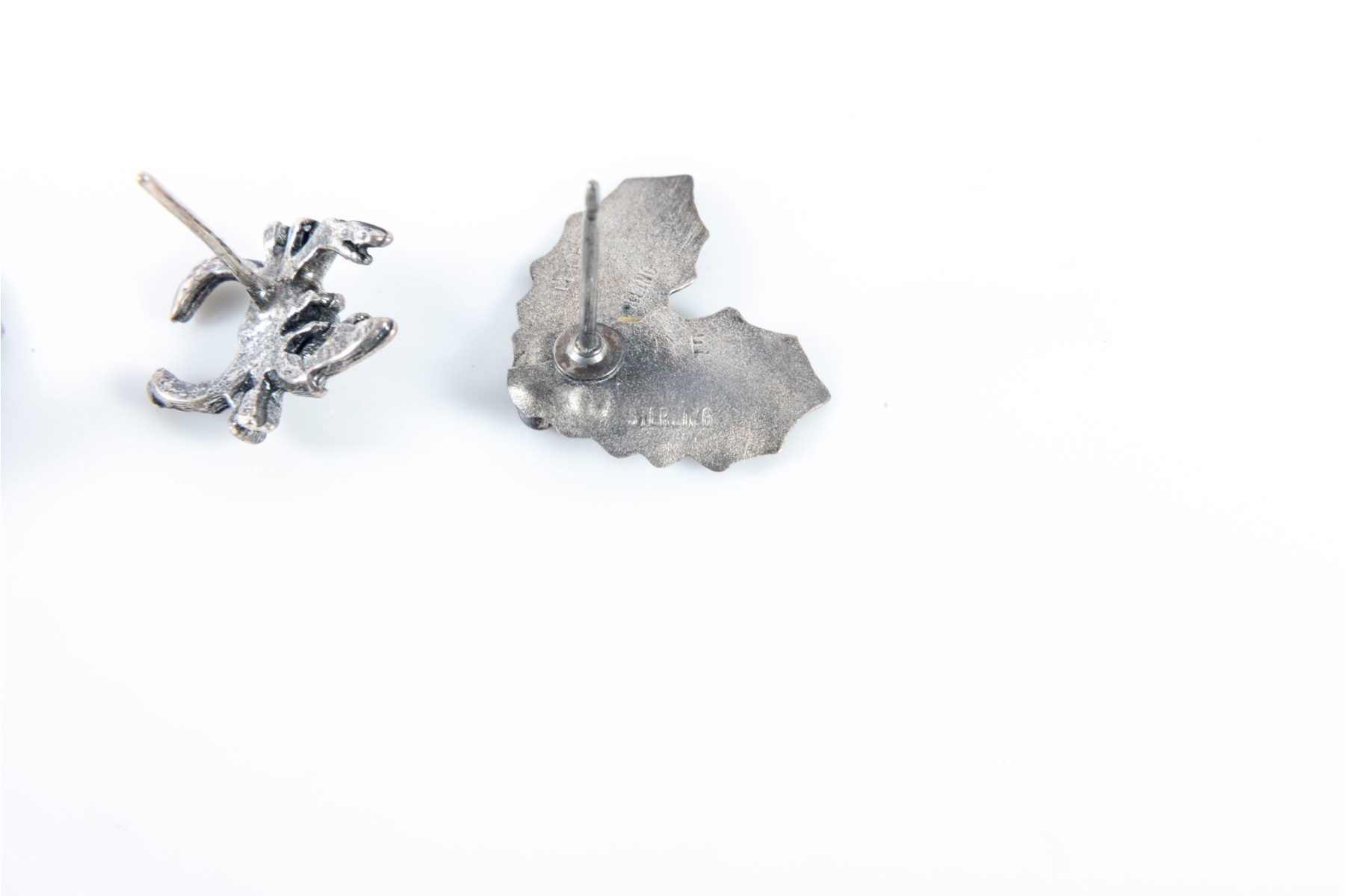 A collection of fun figural sterling silver earrings, including holly, leaves, flowers, lizards, and crabs. The flower studs are accented with round glass.