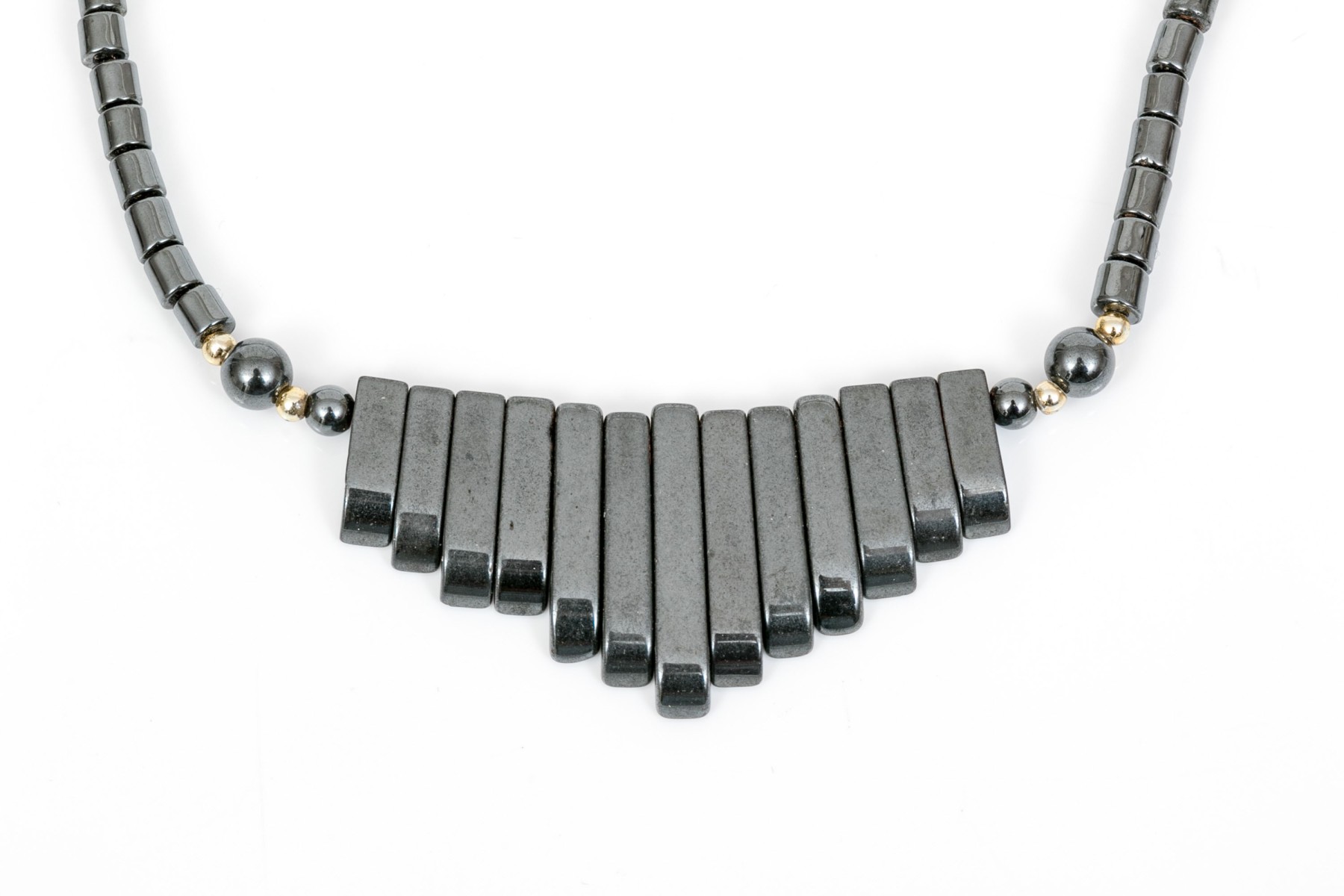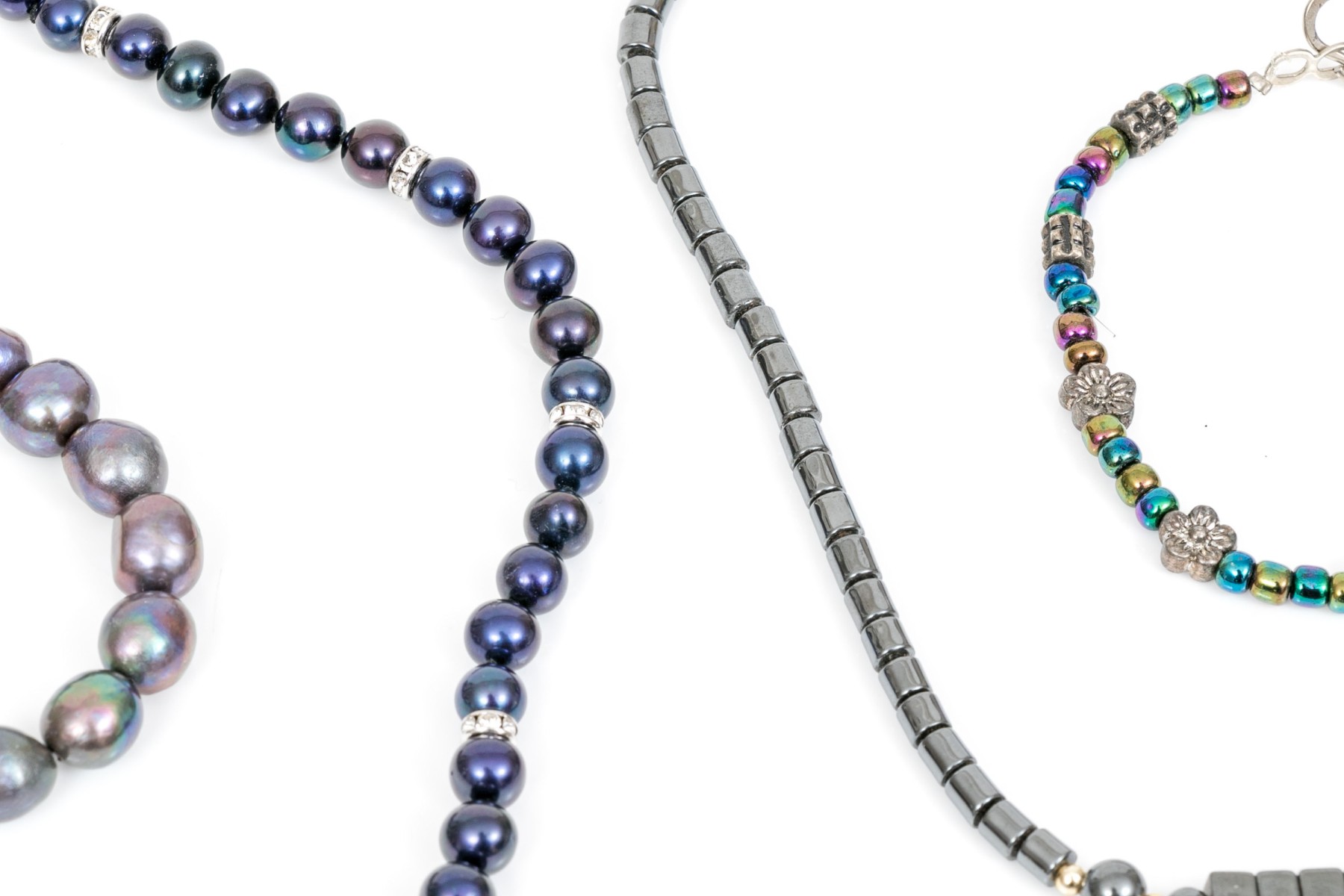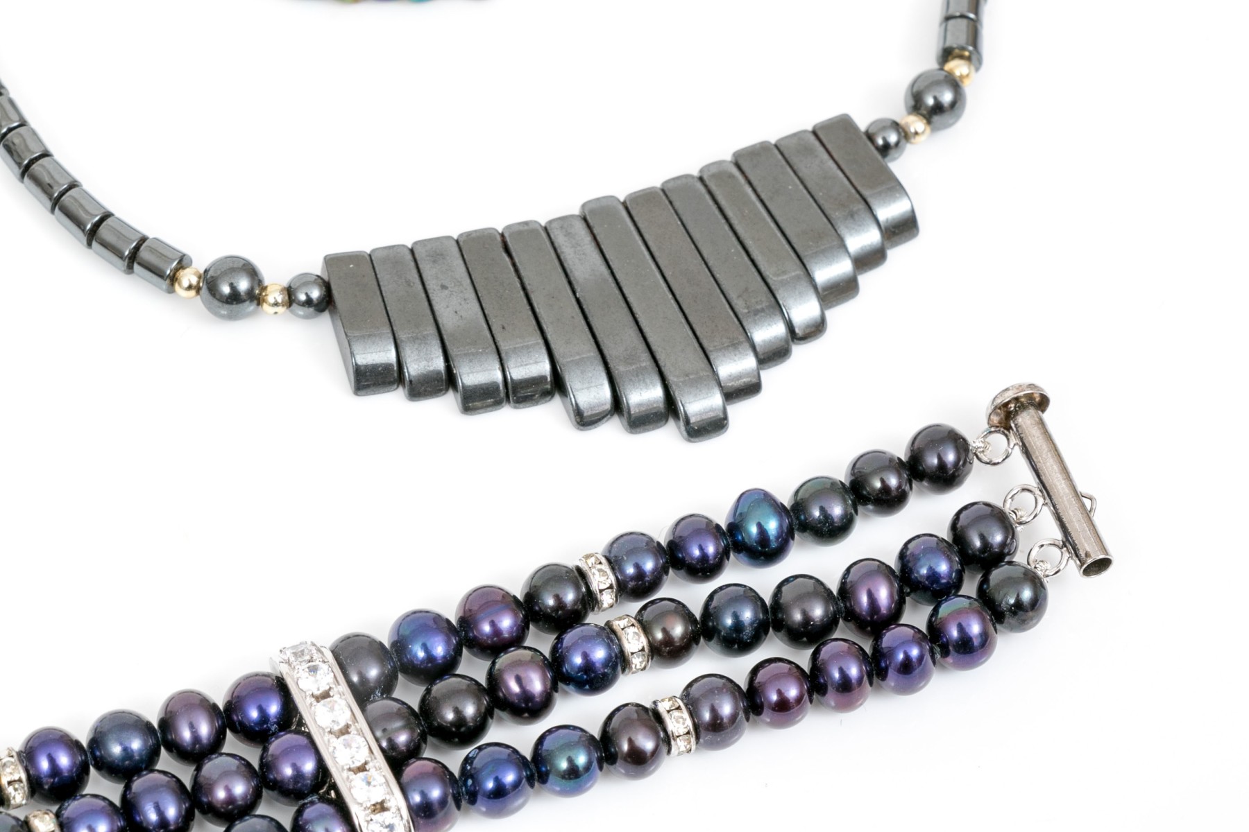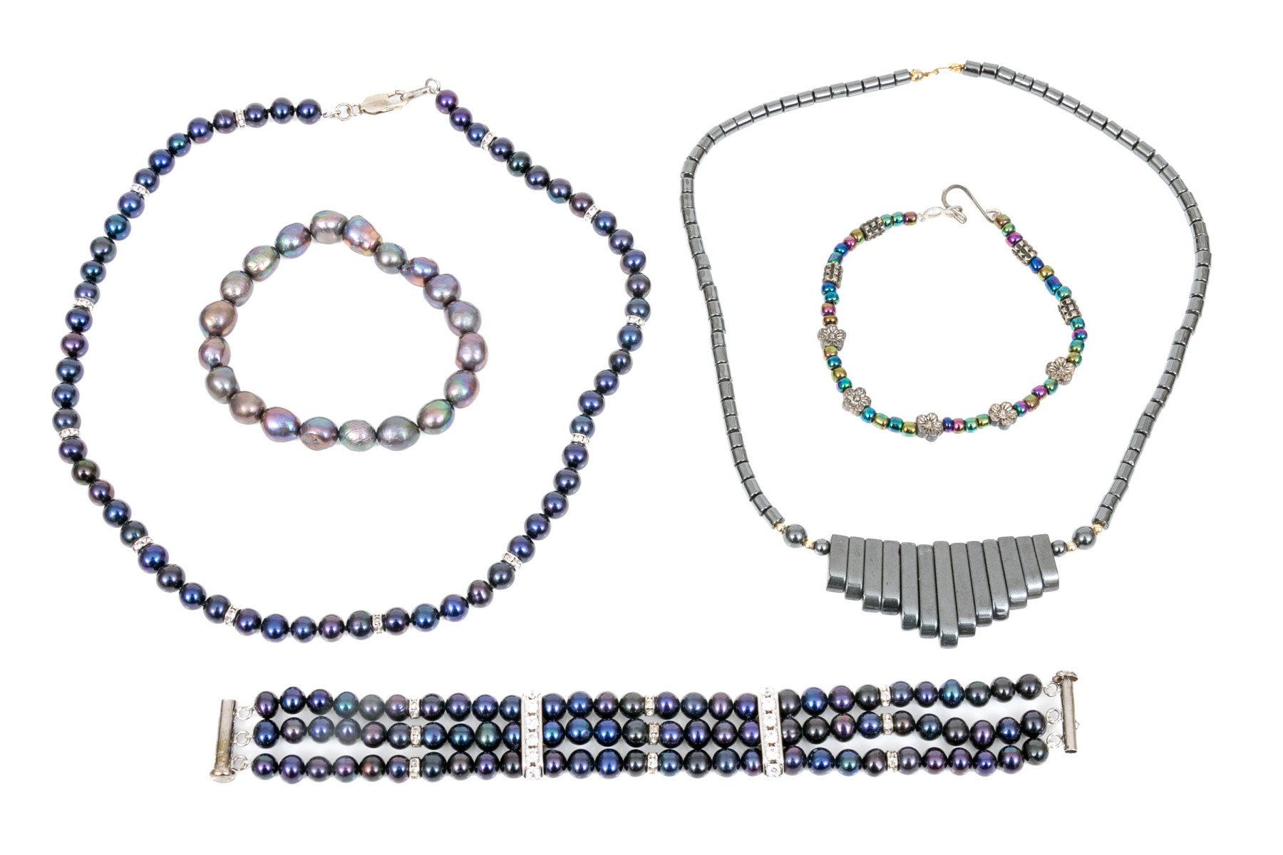 Fun lot of cultured black freshwater pearl necklace and bracelets, with a hematite necklace and black bead necklace