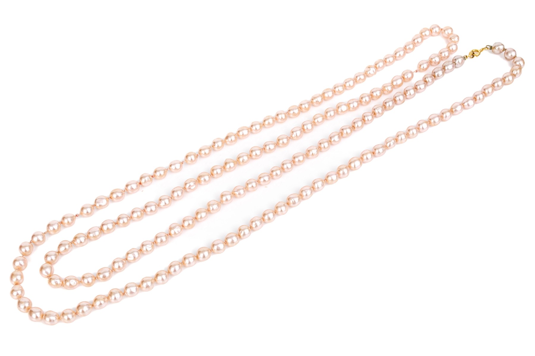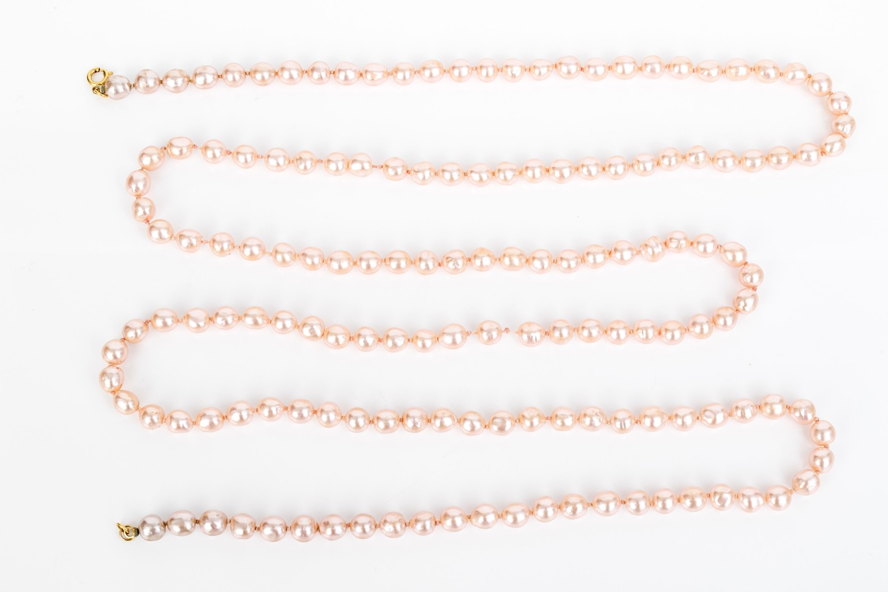 Fun rope length strand of pink cultured freshwater pearls, 55" long, finished with a spring ring style clasp
