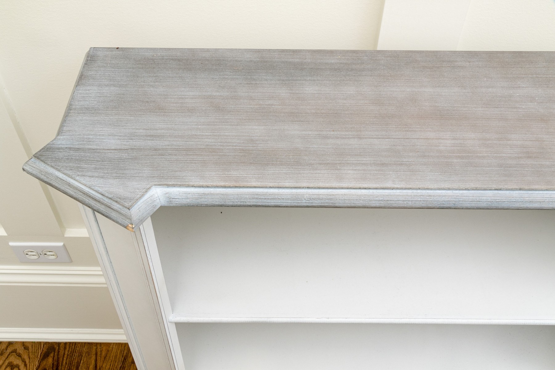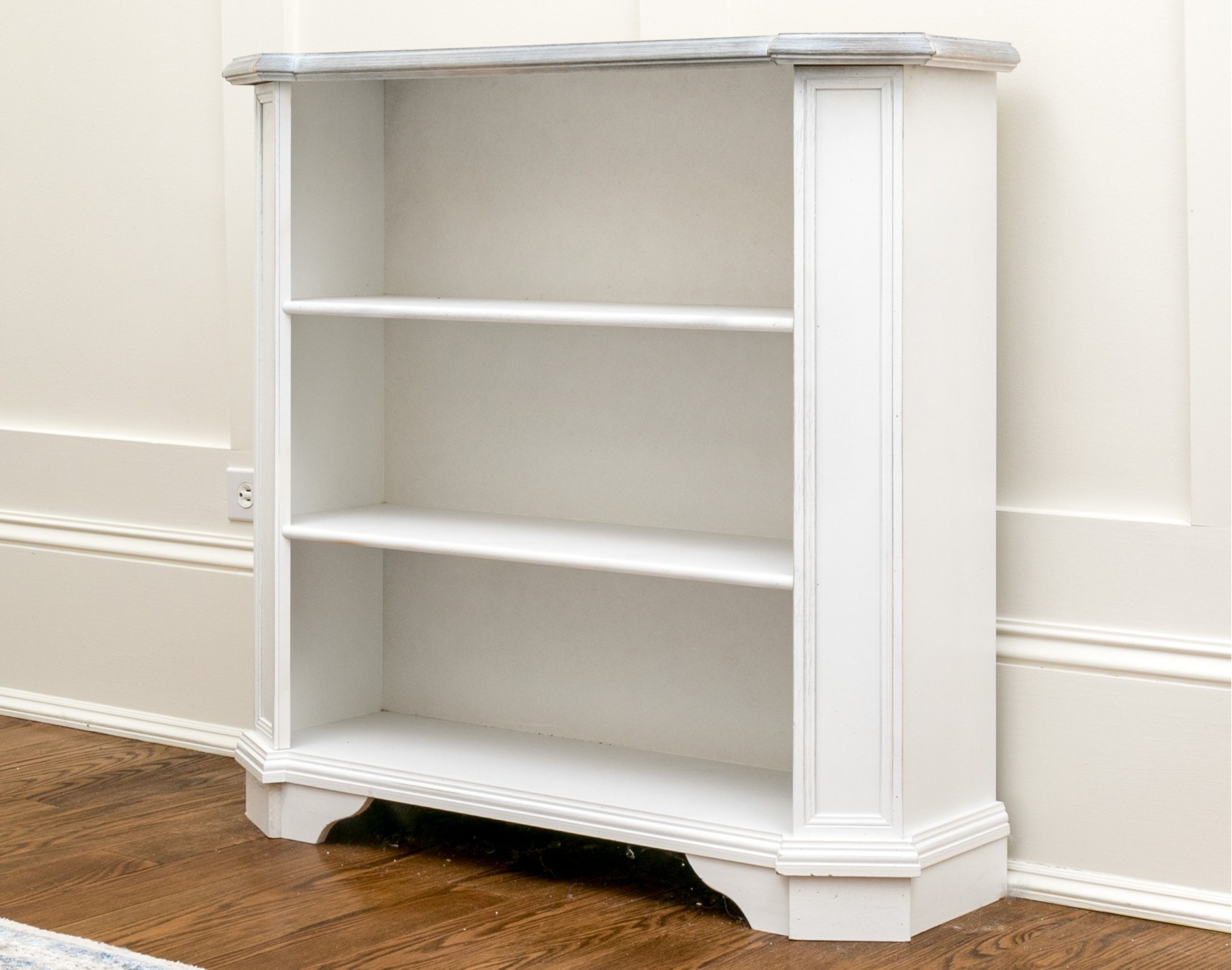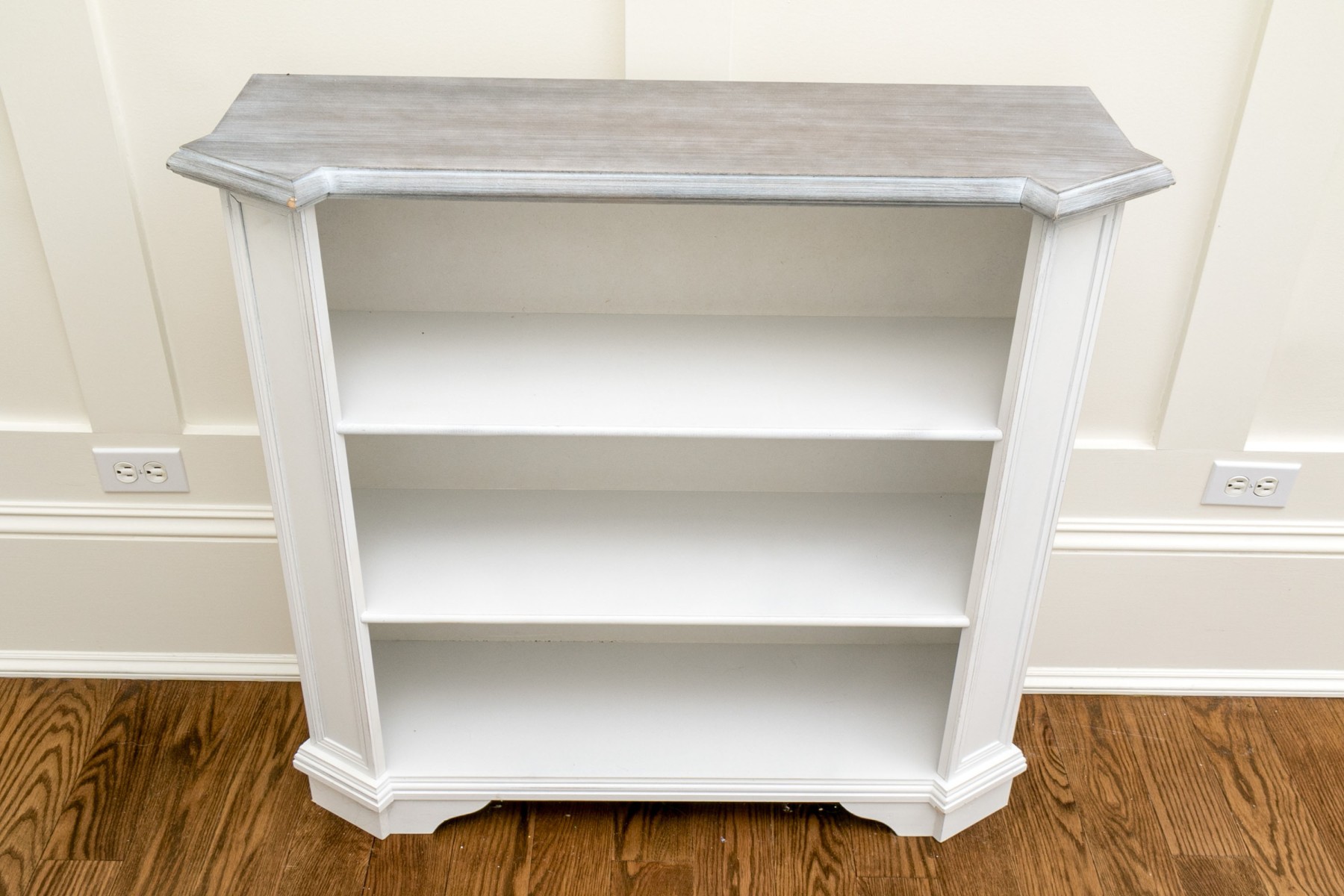 This quality bookshelf has three tiers, a grey painted and angled top, and column form sides.