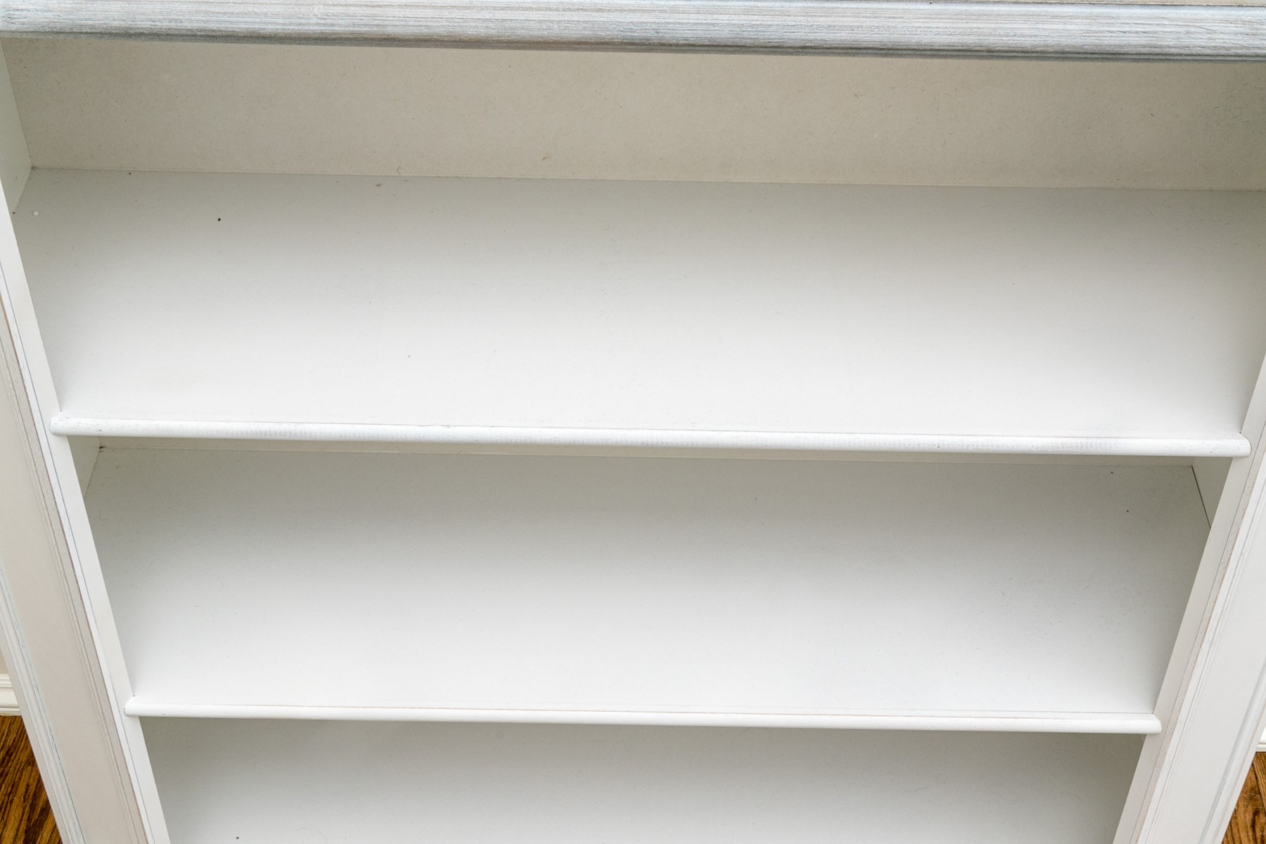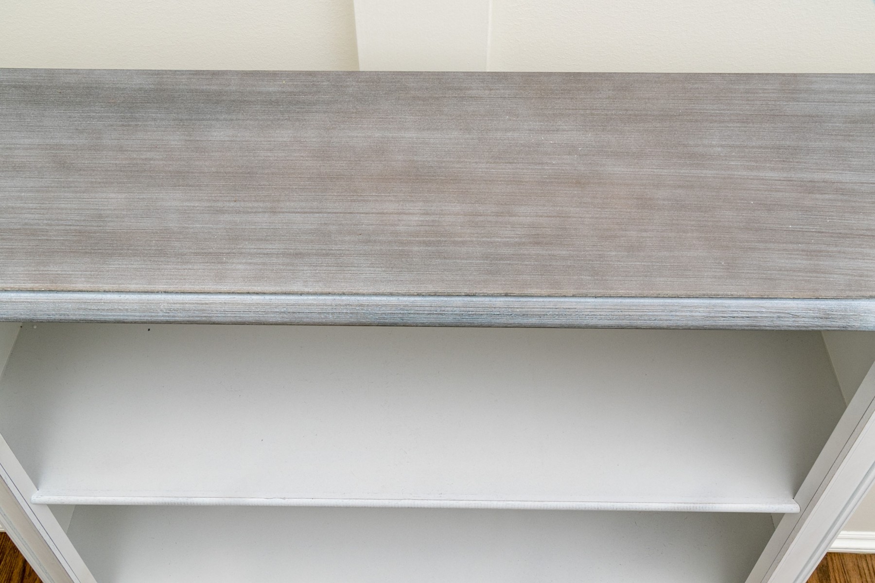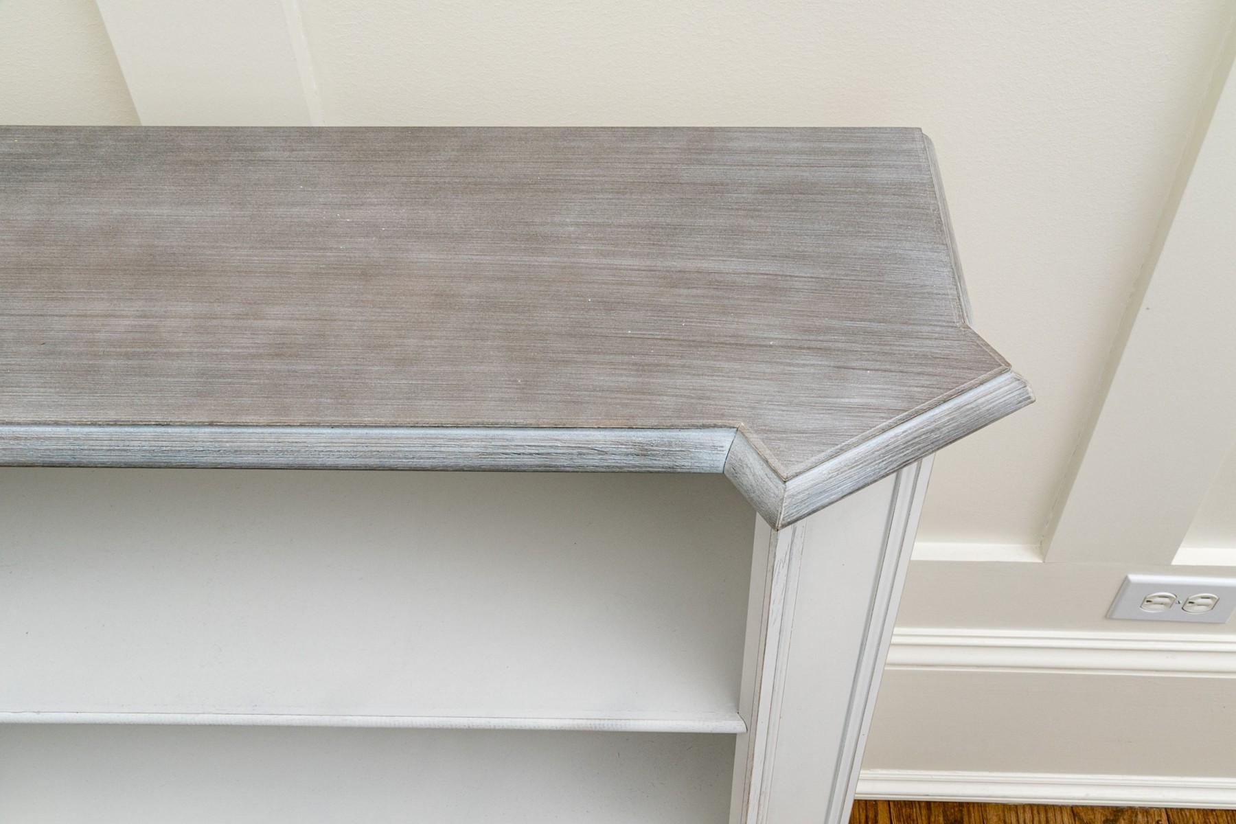 This quality bookshelf has three tiers, a grey painted and angled top, and column form sides.
