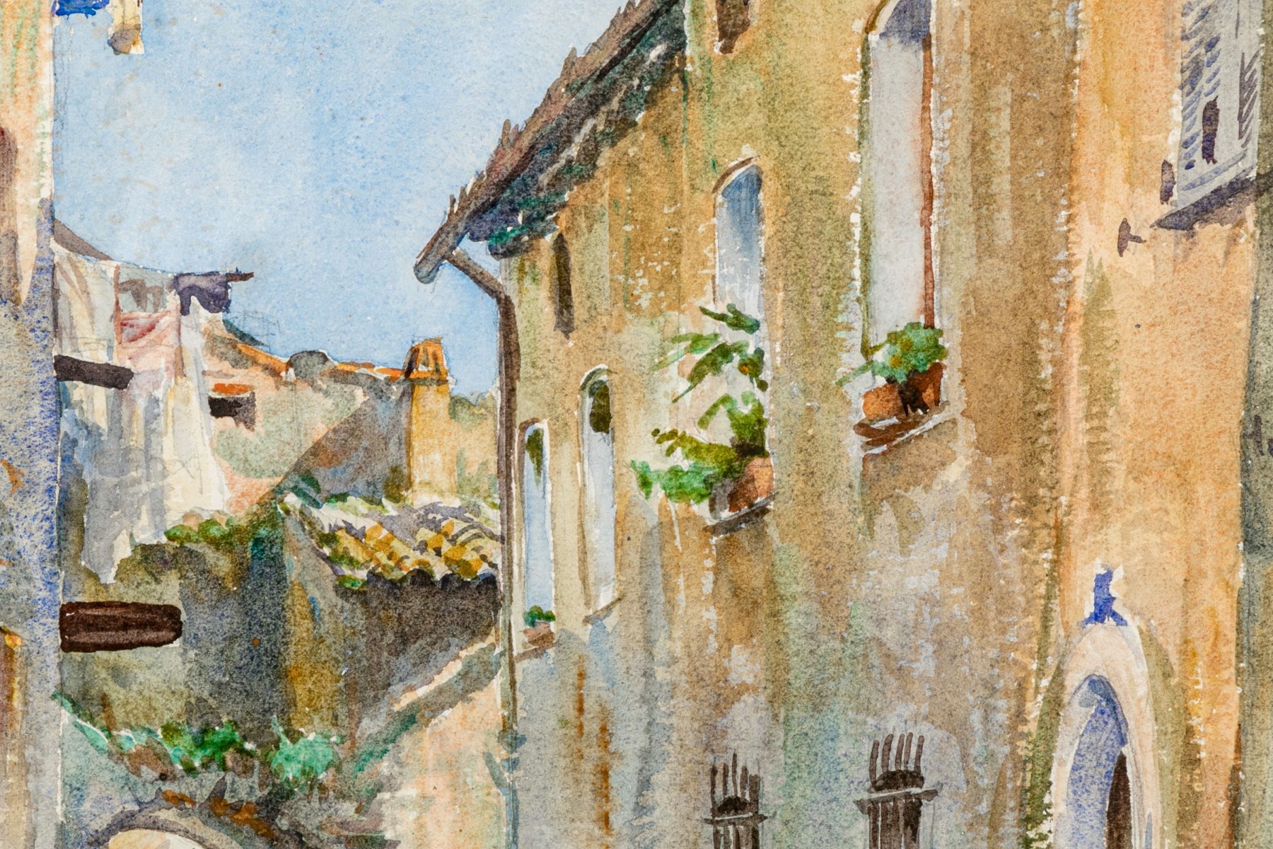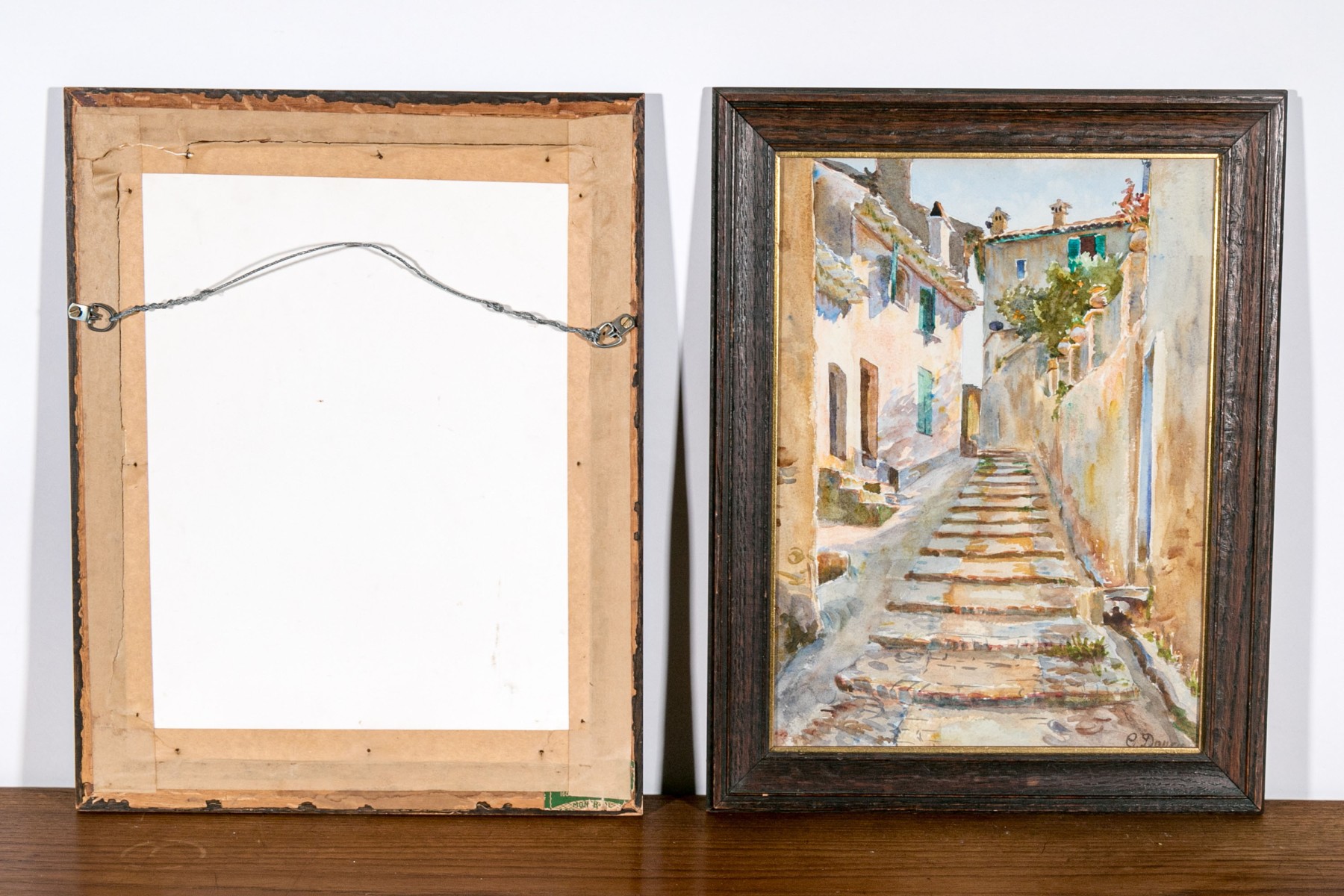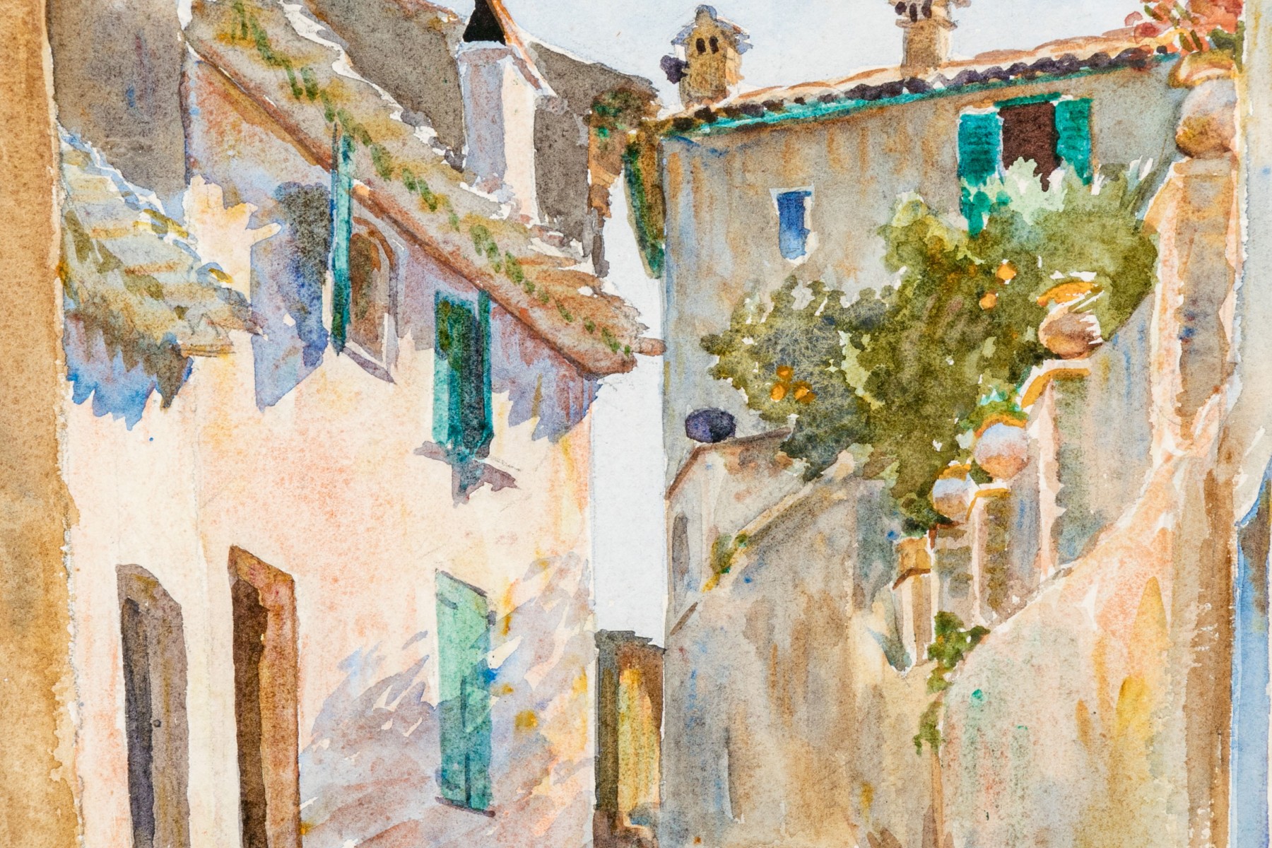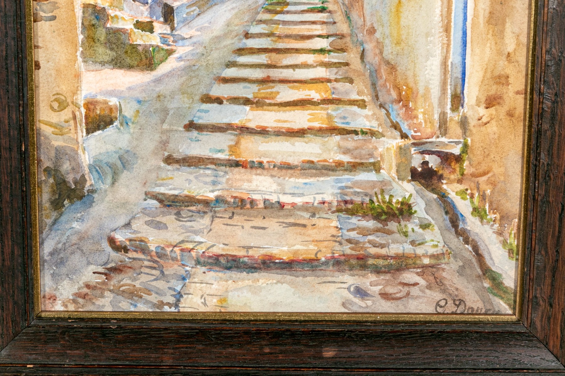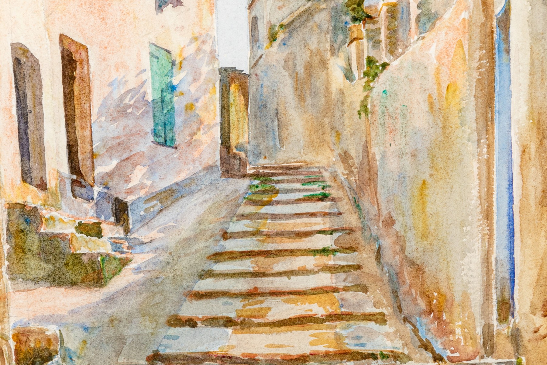 Signed lower left and lower right. Views of sun lit white washed houses, one along steps, the other near an archway. Both framed in wood with glass.