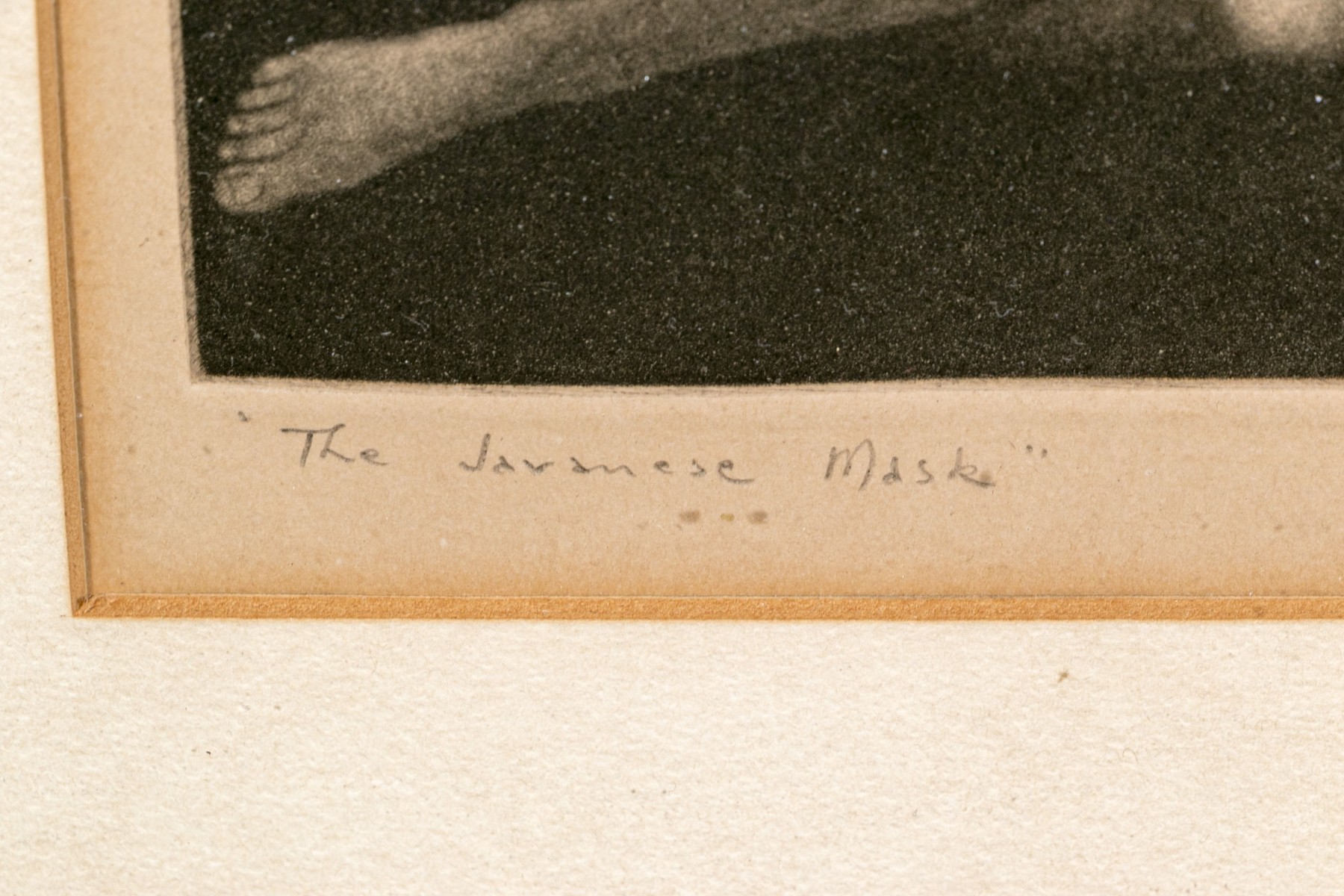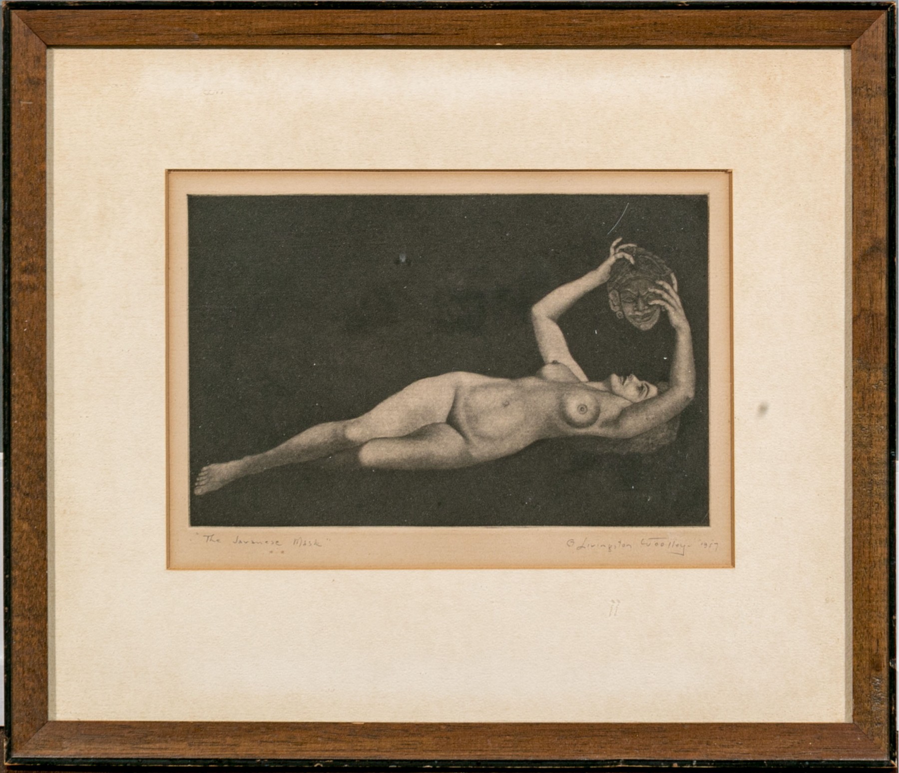 Pencil signed and dated 1957 lower right, titled "The Javanese Mask" lower left. A sensitive rendering of a reclining female nude holding up and contemplating a mask. Presented in a wood frame with glass.
