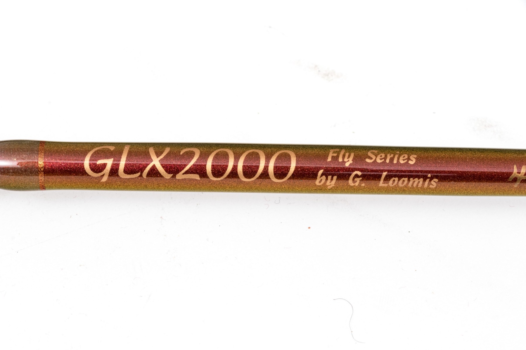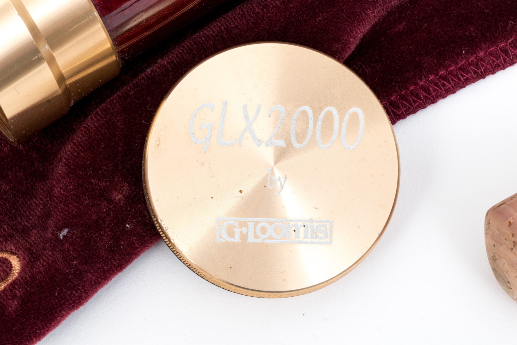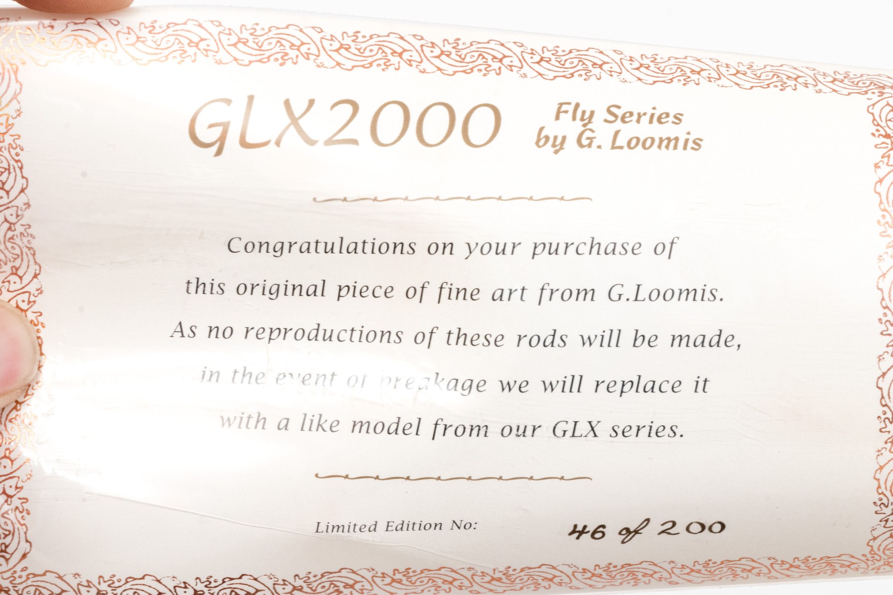 G. Loomis GLX2000 'Fly Series' fly rod. This rod is 46th of only 200 'Fly Series' produced in 2000, commemorating the turn of the century. The nine foot rod breaks into four pieces and comes with the original case and Certificate of Authenticity. Retail price approximately $1150.