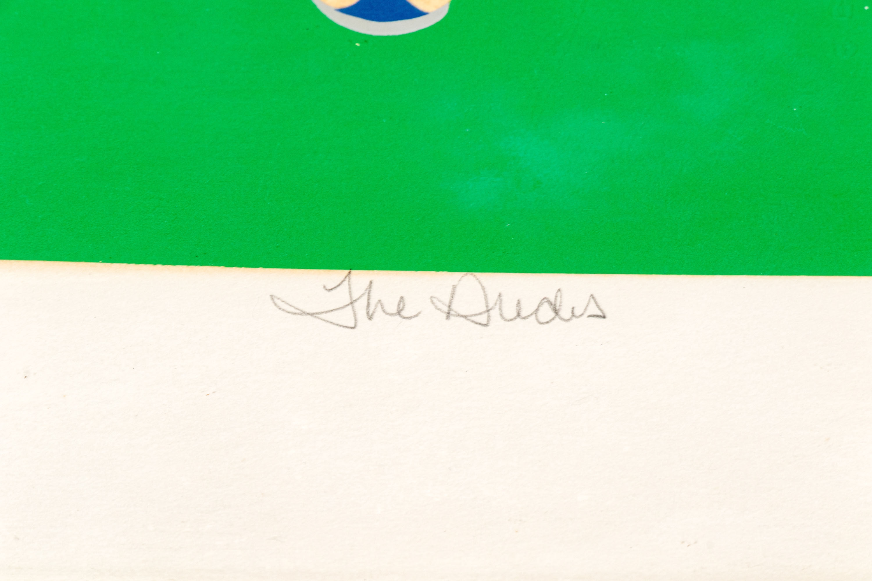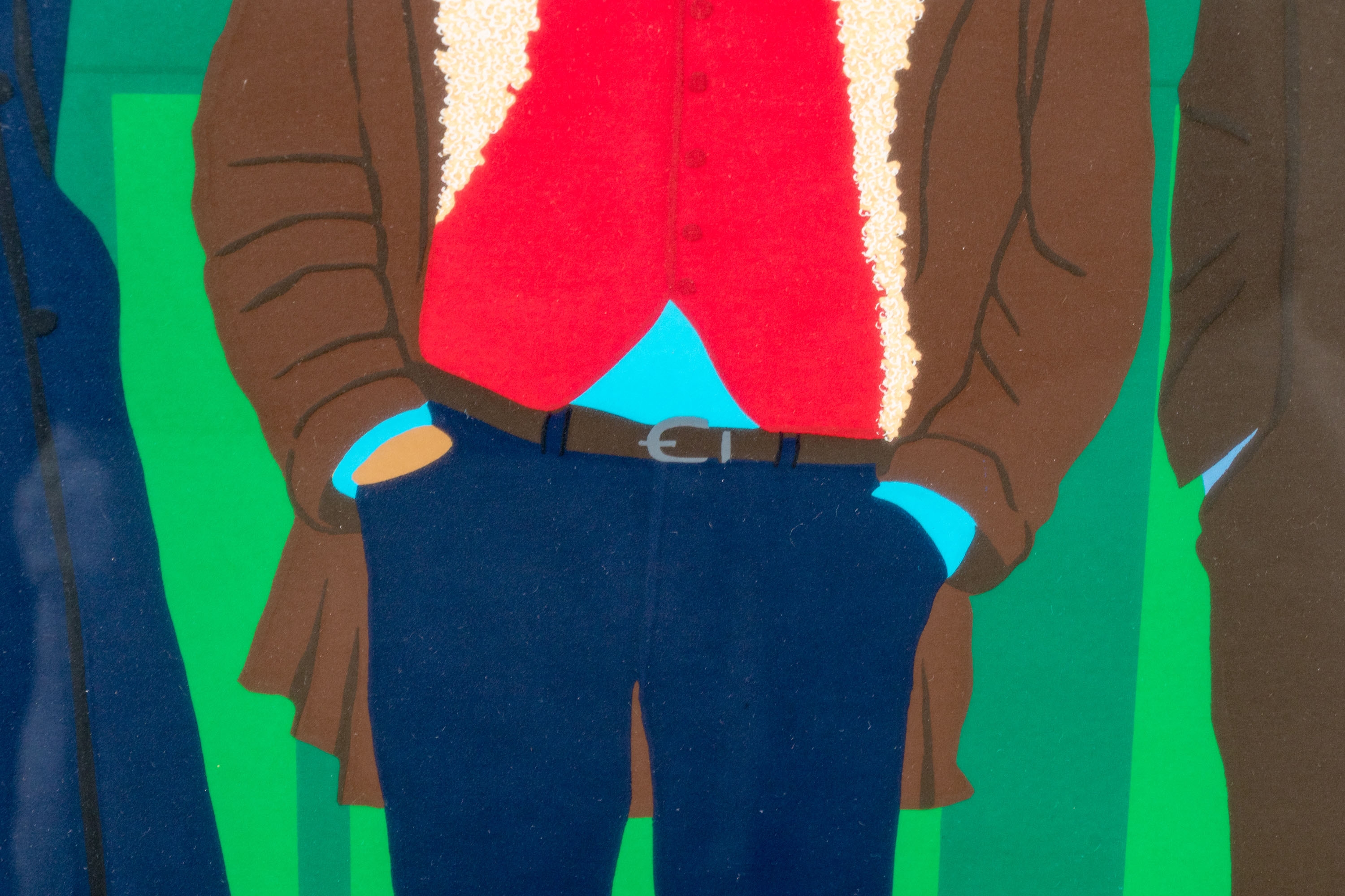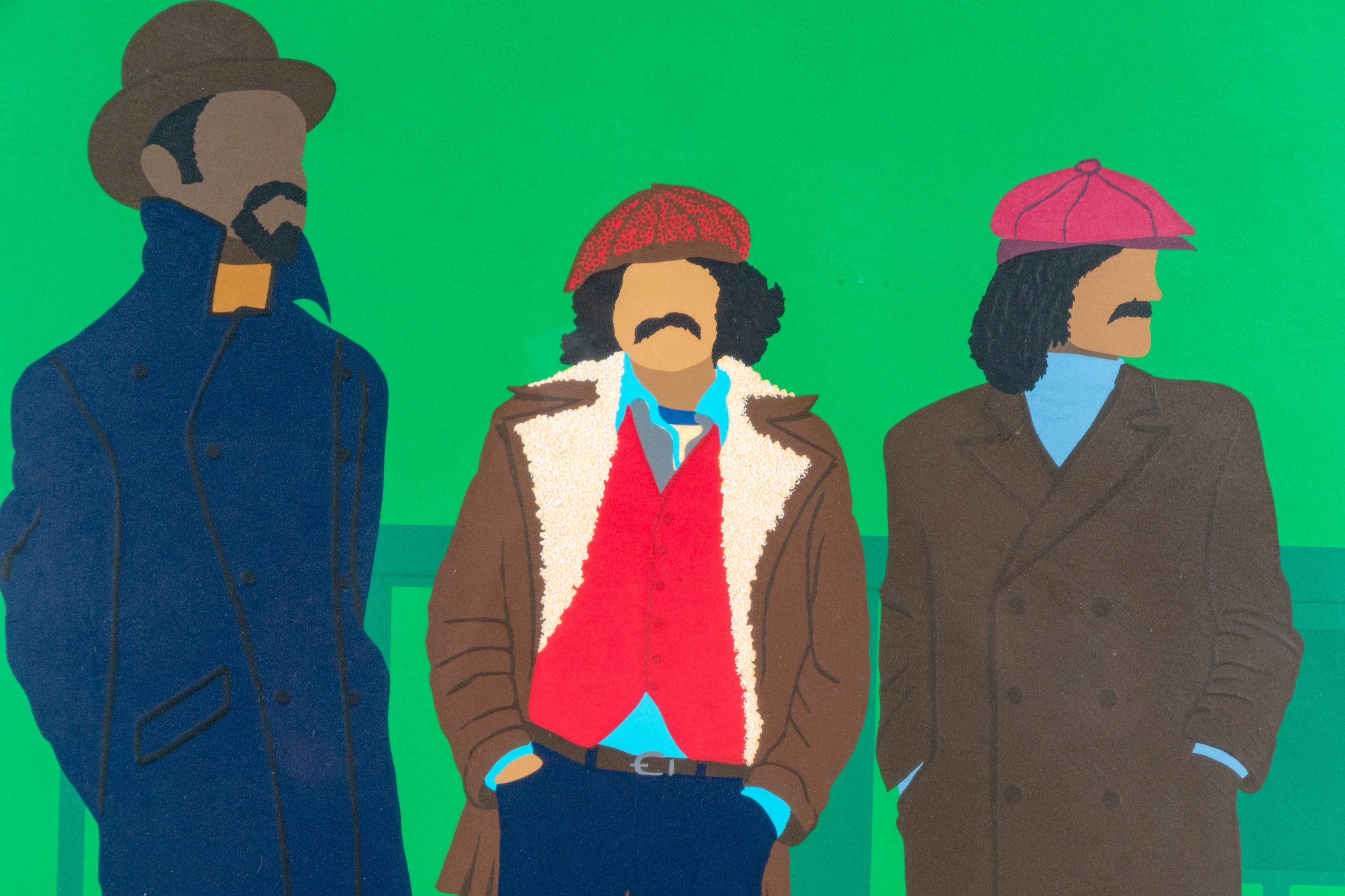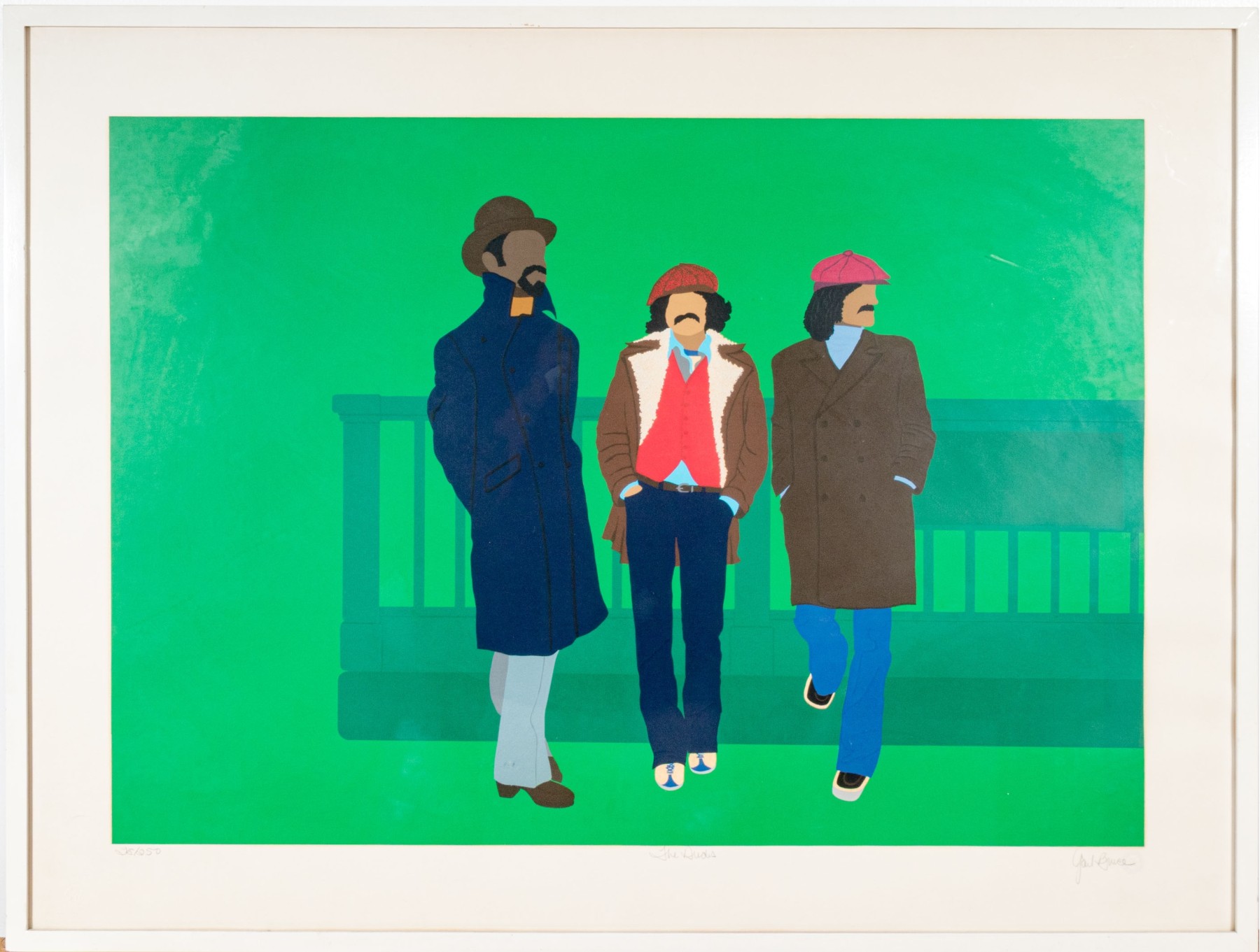 Three men in jackets against green background. Pencil signed, titled and numbered 25/250 out of plate lower trim. Presented custom framed in white.