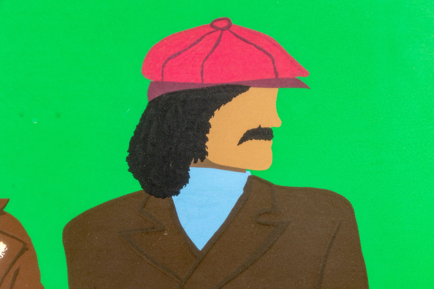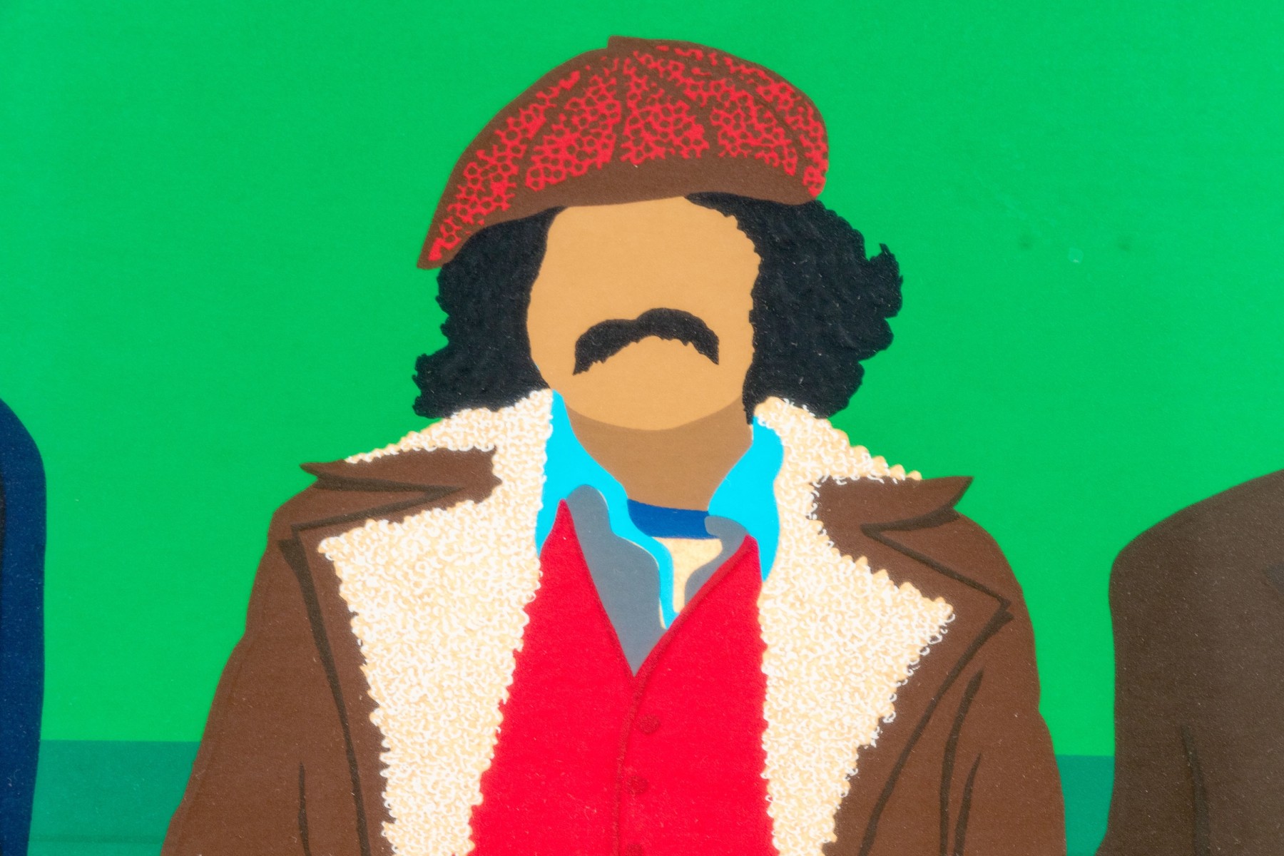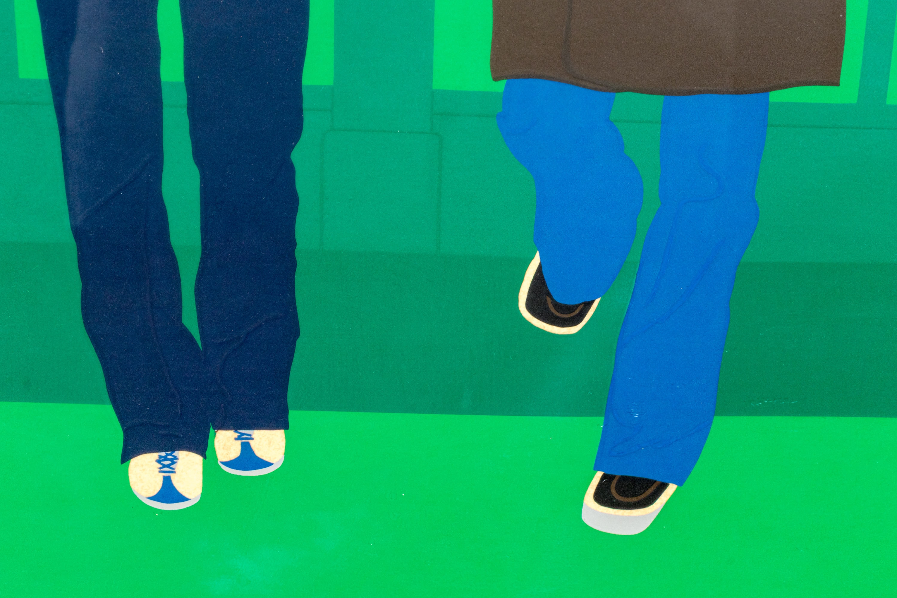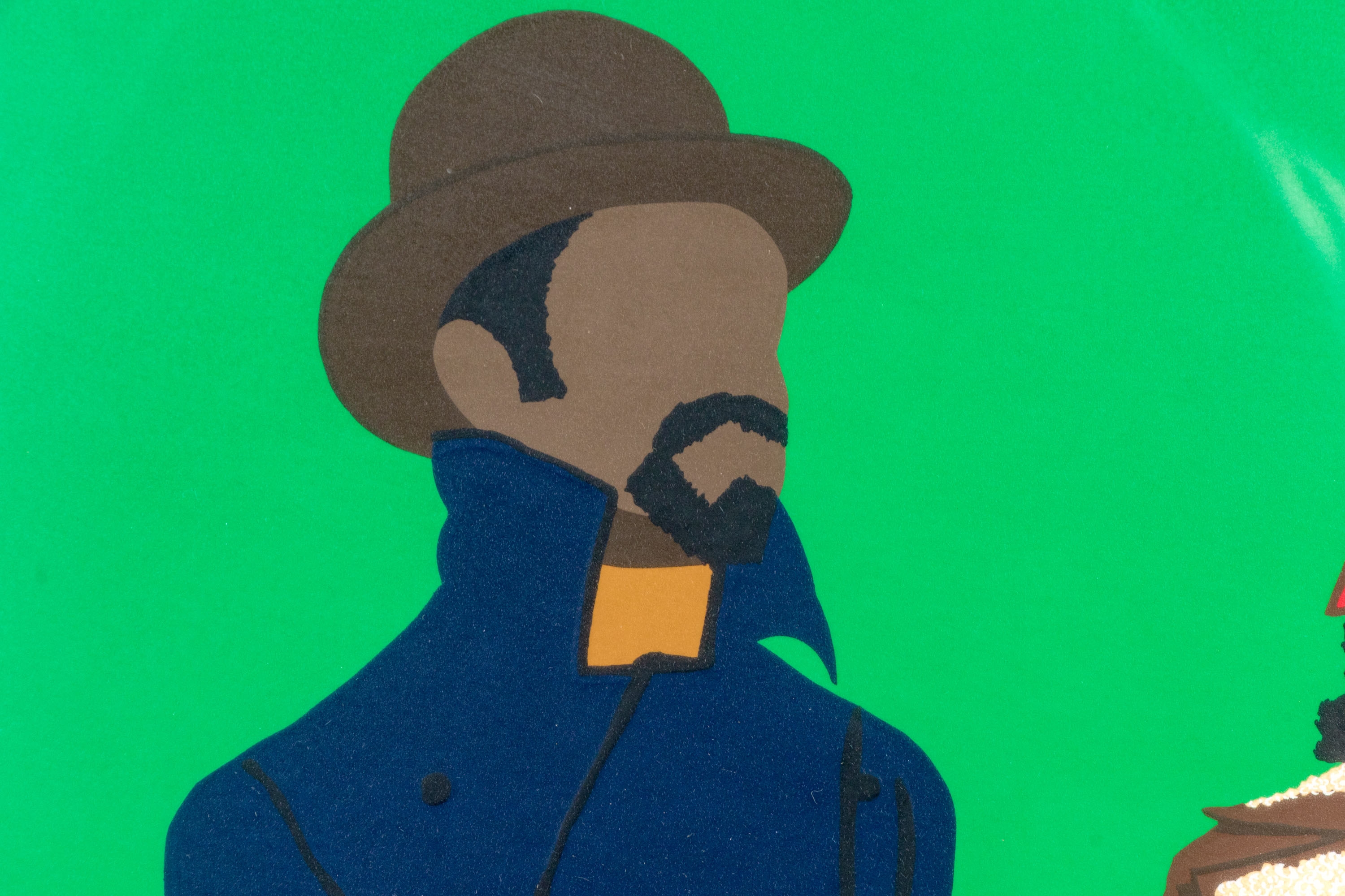 Three men in jackets against green background. Pencil signed, titled and numbered 25/250 out of plate lower trim. Presented custom framed in white.