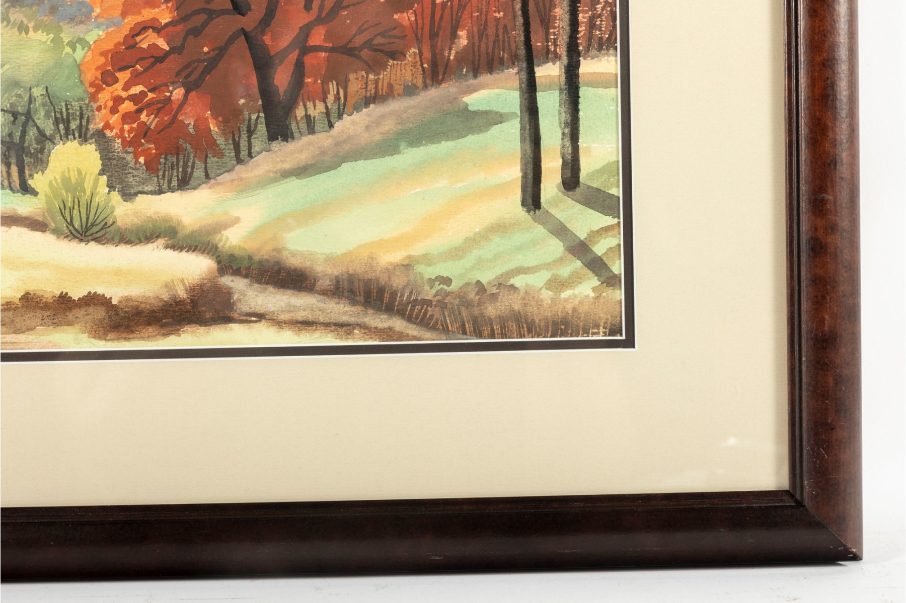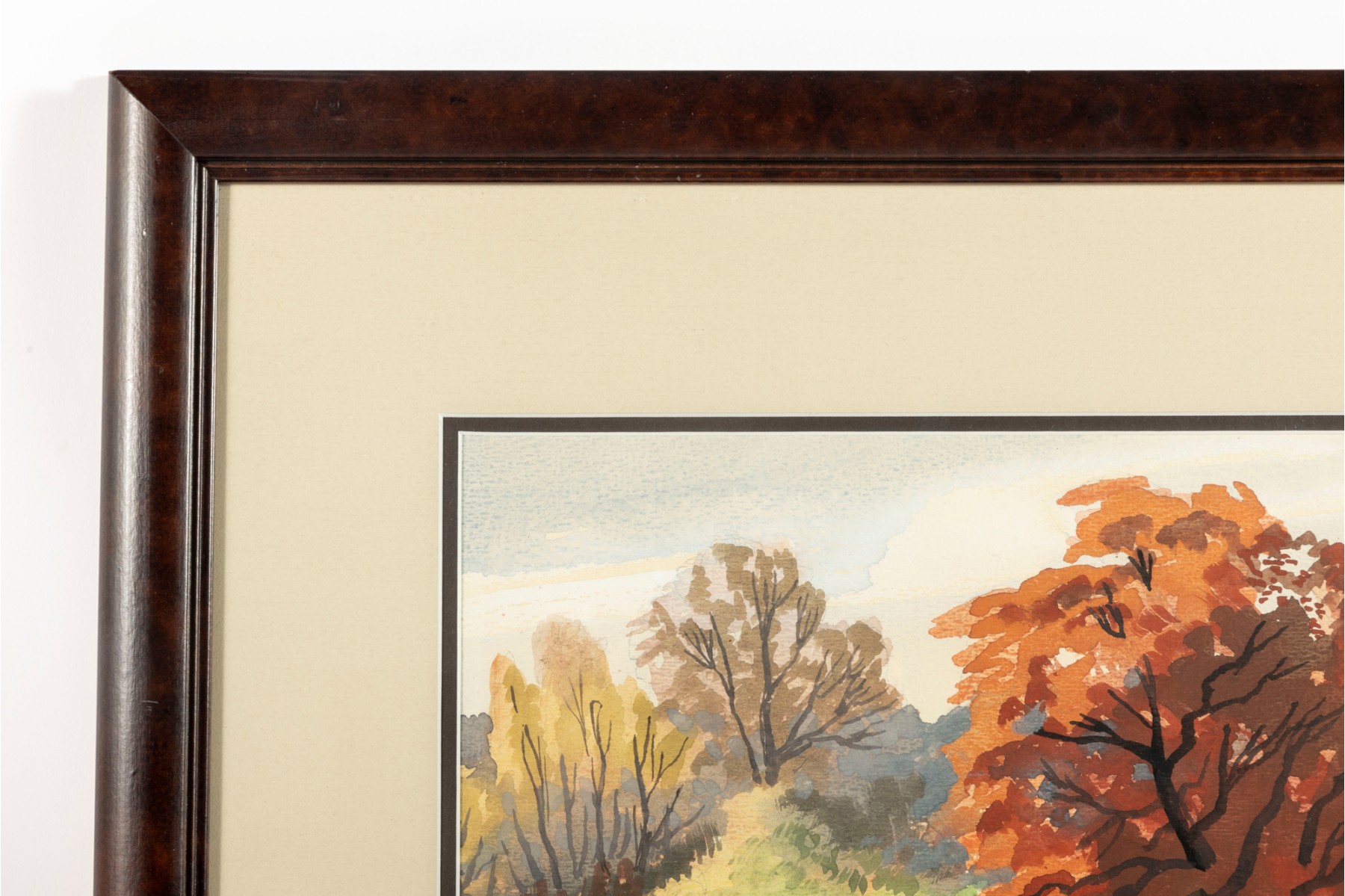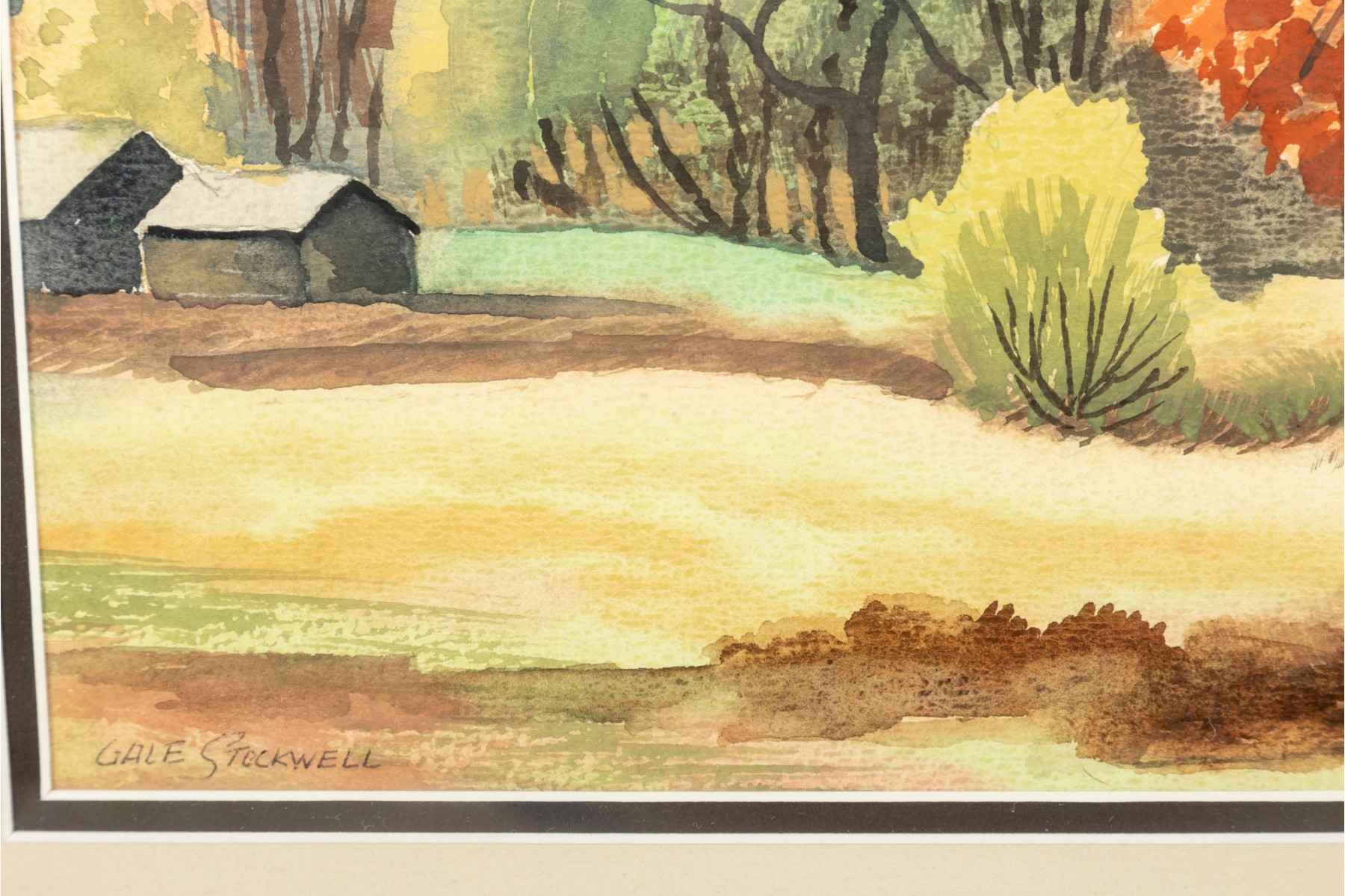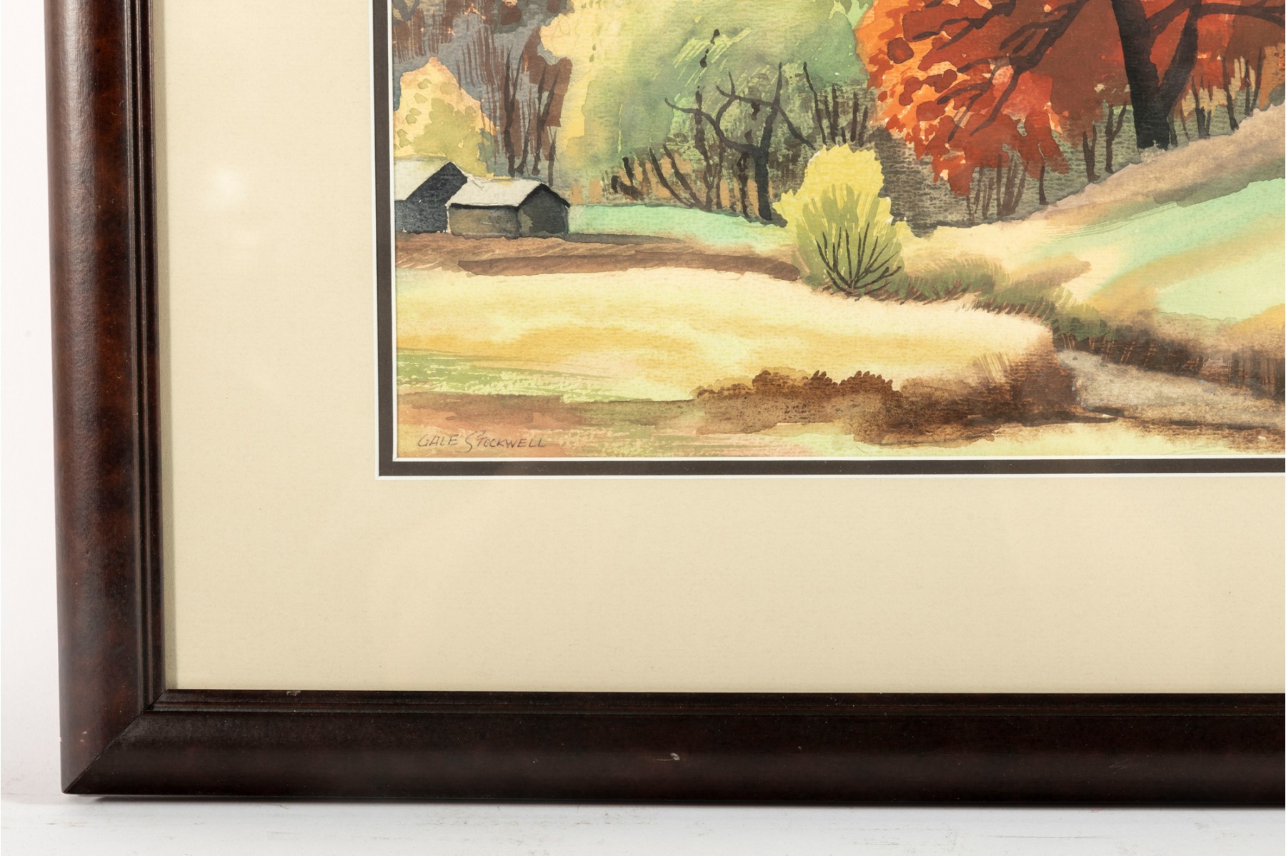 Gale Stockwell is a depression era American artist who sold most of his works to the government, unknowingly leading to one of his paintings being hung in the White House among other notable showcases. He dedicated his full time to artistry in 1954 after retiring, specializing in watercolor paintings of Missouri towns and landscapes. This particular example is presented in a wood frame, double matted and protected via a glass facing -- signed on the bottom left-hand corner.