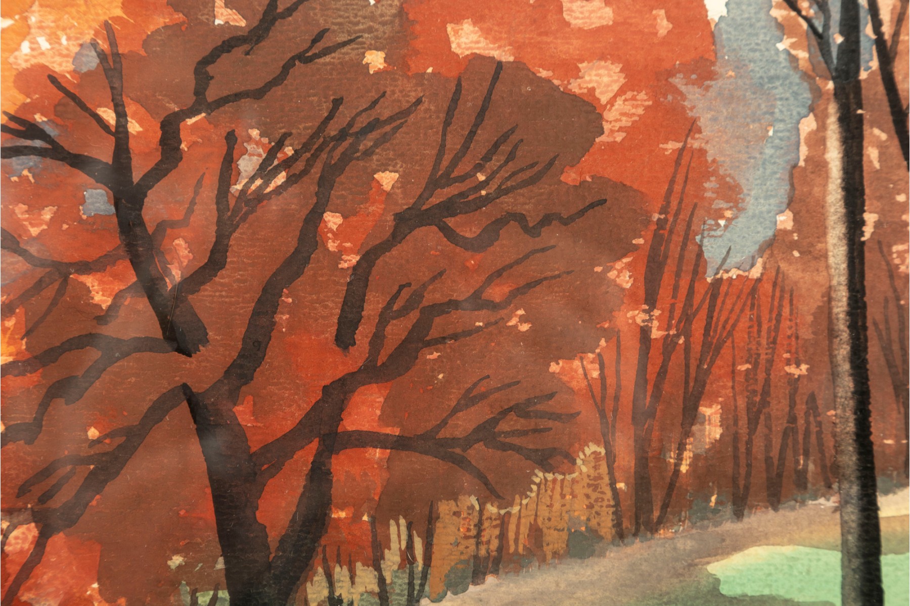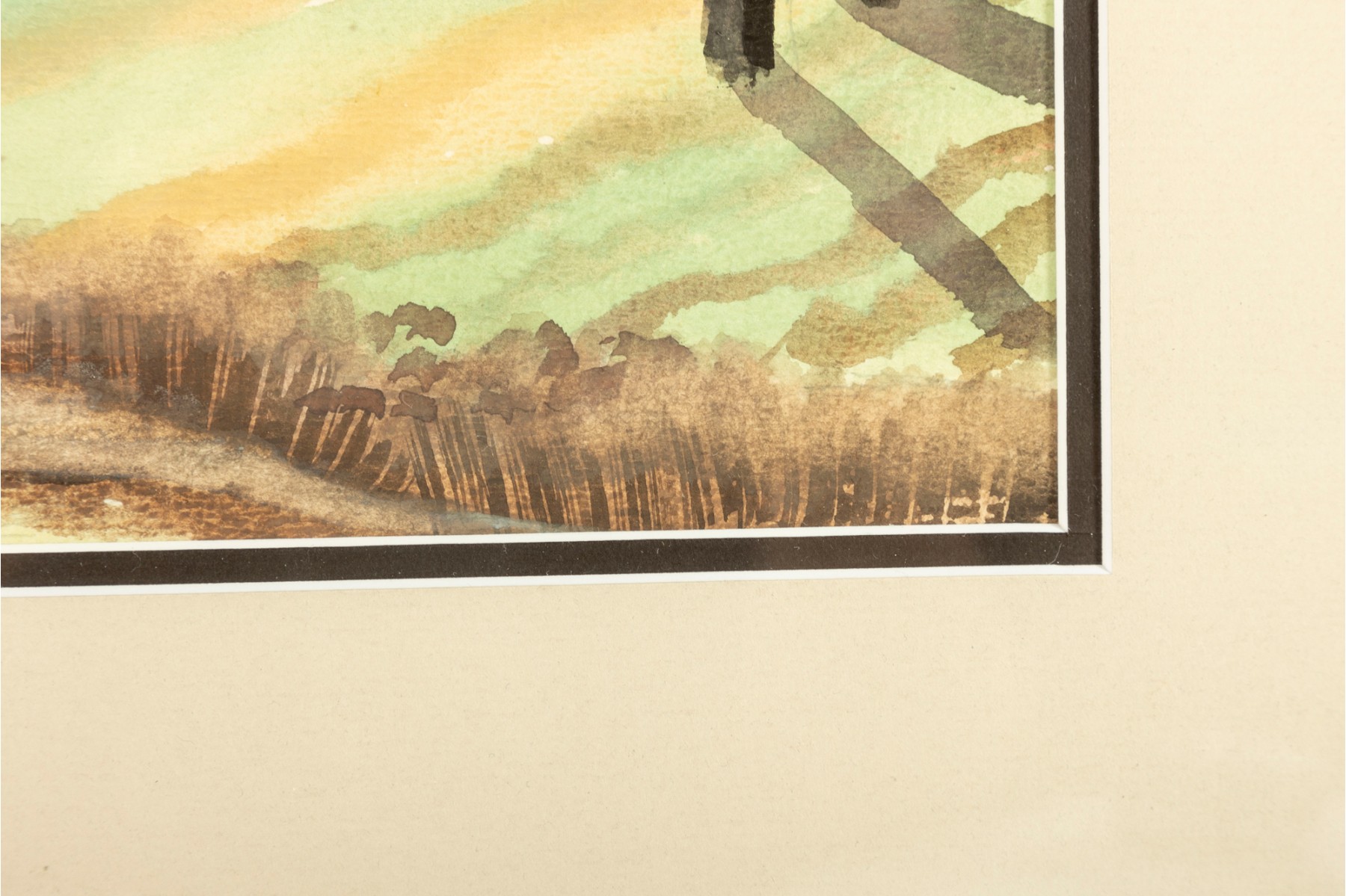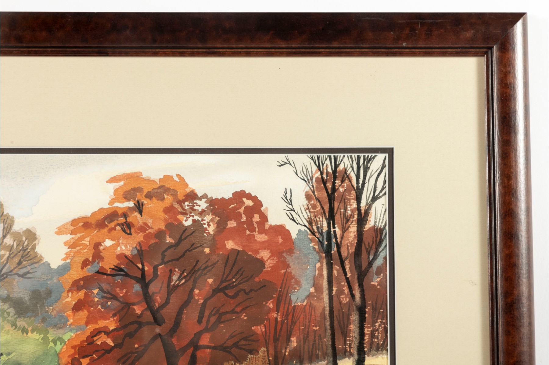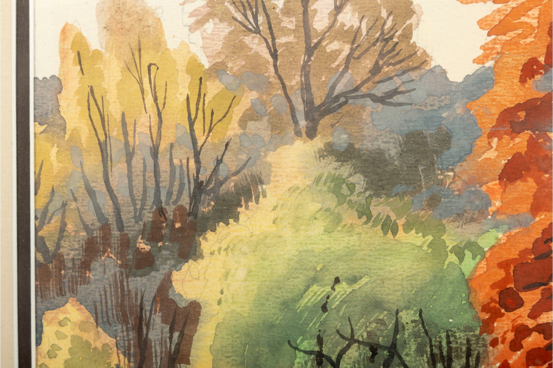 Gale Stockwell is a depression era American artist who sold most of his works to the government, unknowingly leading to one of his paintings being hung in the White House among other notable showcases. He dedicated his full time to artistry in 1954 after retiring, specializing in watercolor paintings of Missouri towns and landscapes. This particular example is presented in a wood frame, double matted and protected via a glass facing -- signed on the bottom left-hand corner.