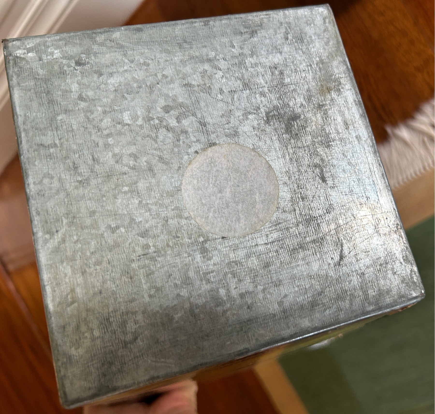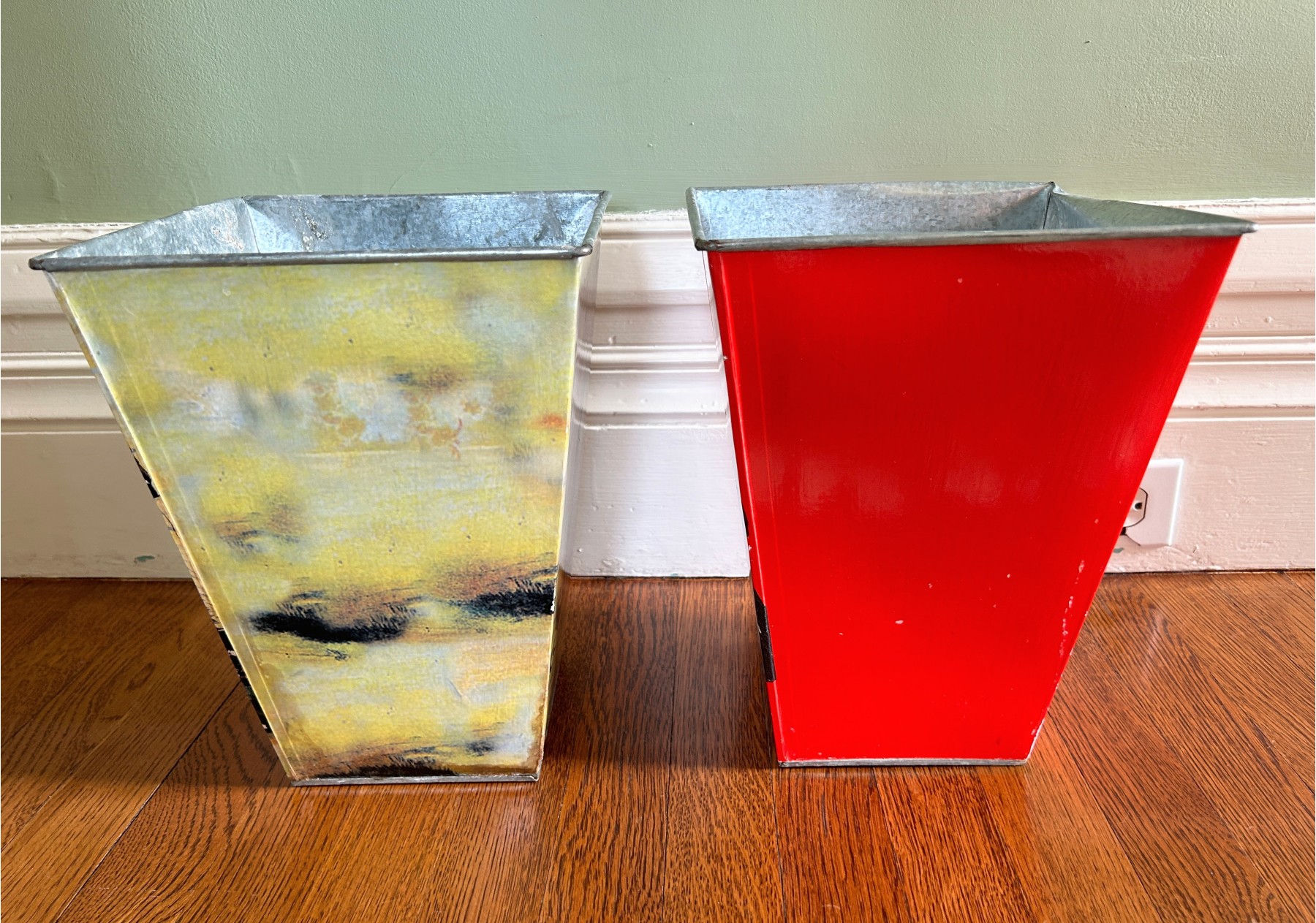 Made of metal with decoupage overlay.