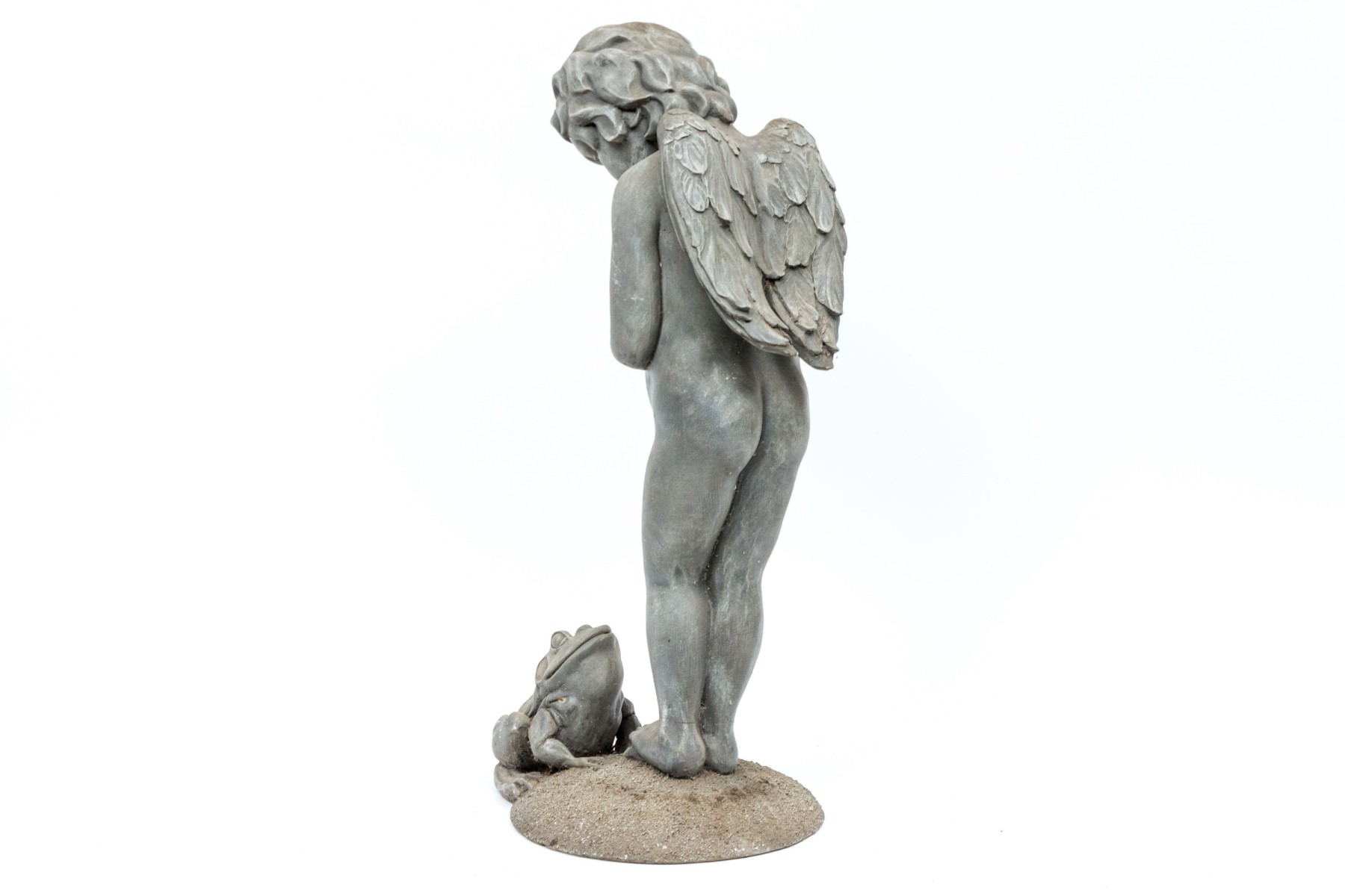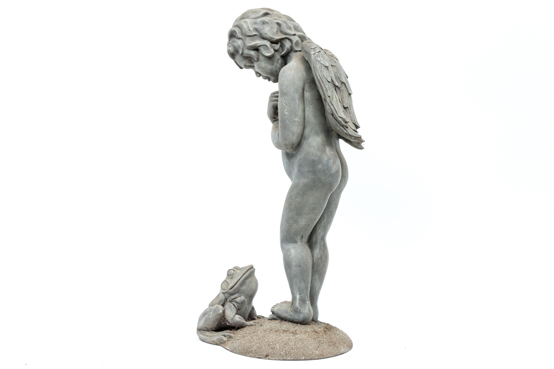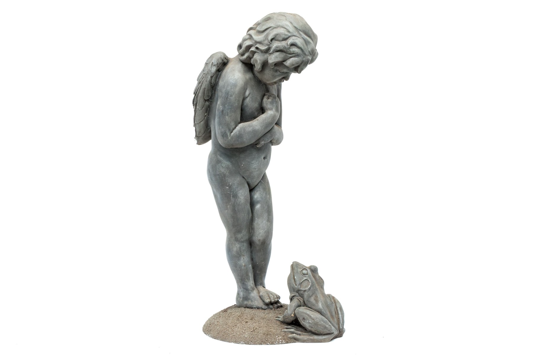 A charming garden sculpture in the form of a cherub with his arms crossed and wings pulled back and in standing on a base appearing to gaze downwards at a bullfrog that gazed up.