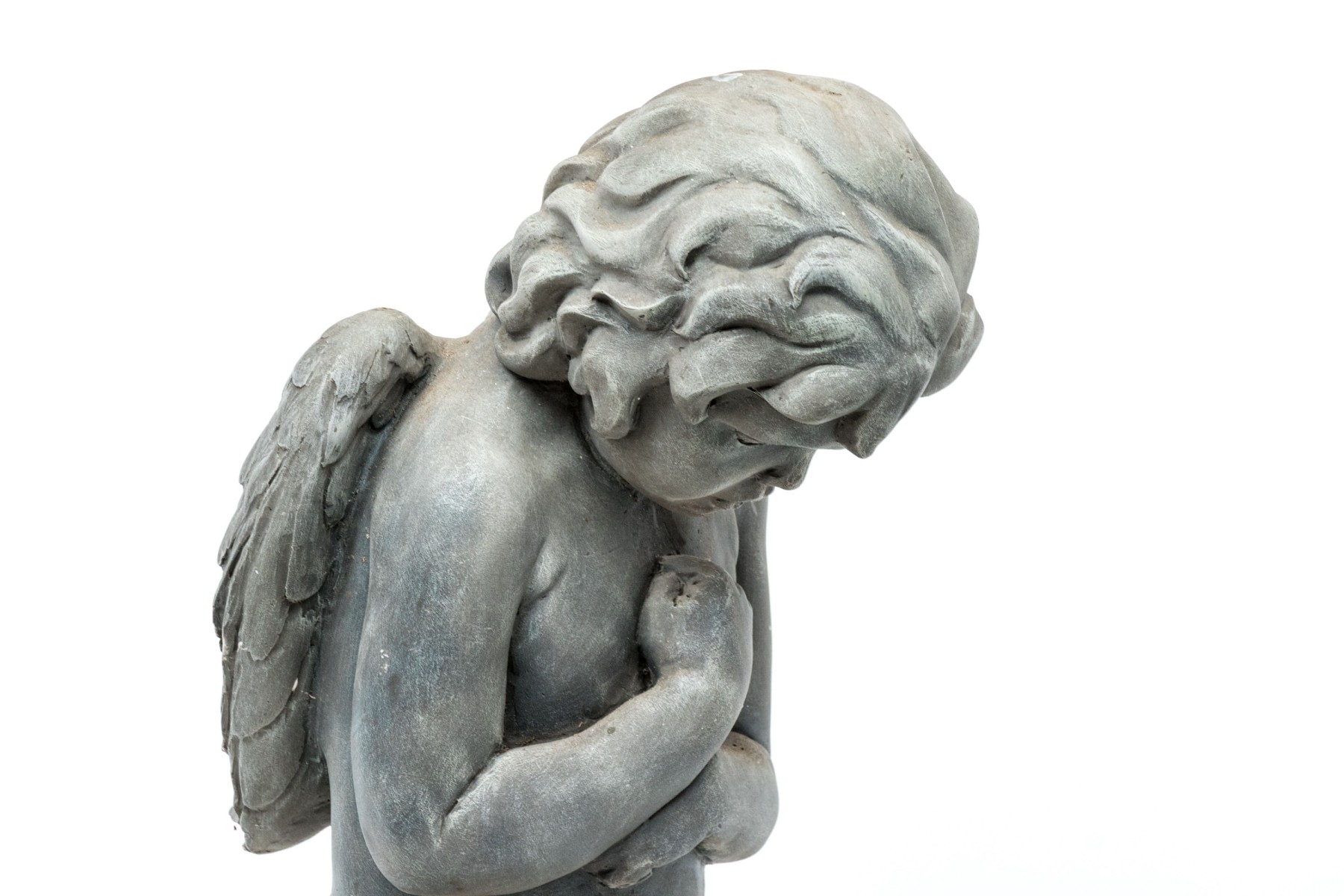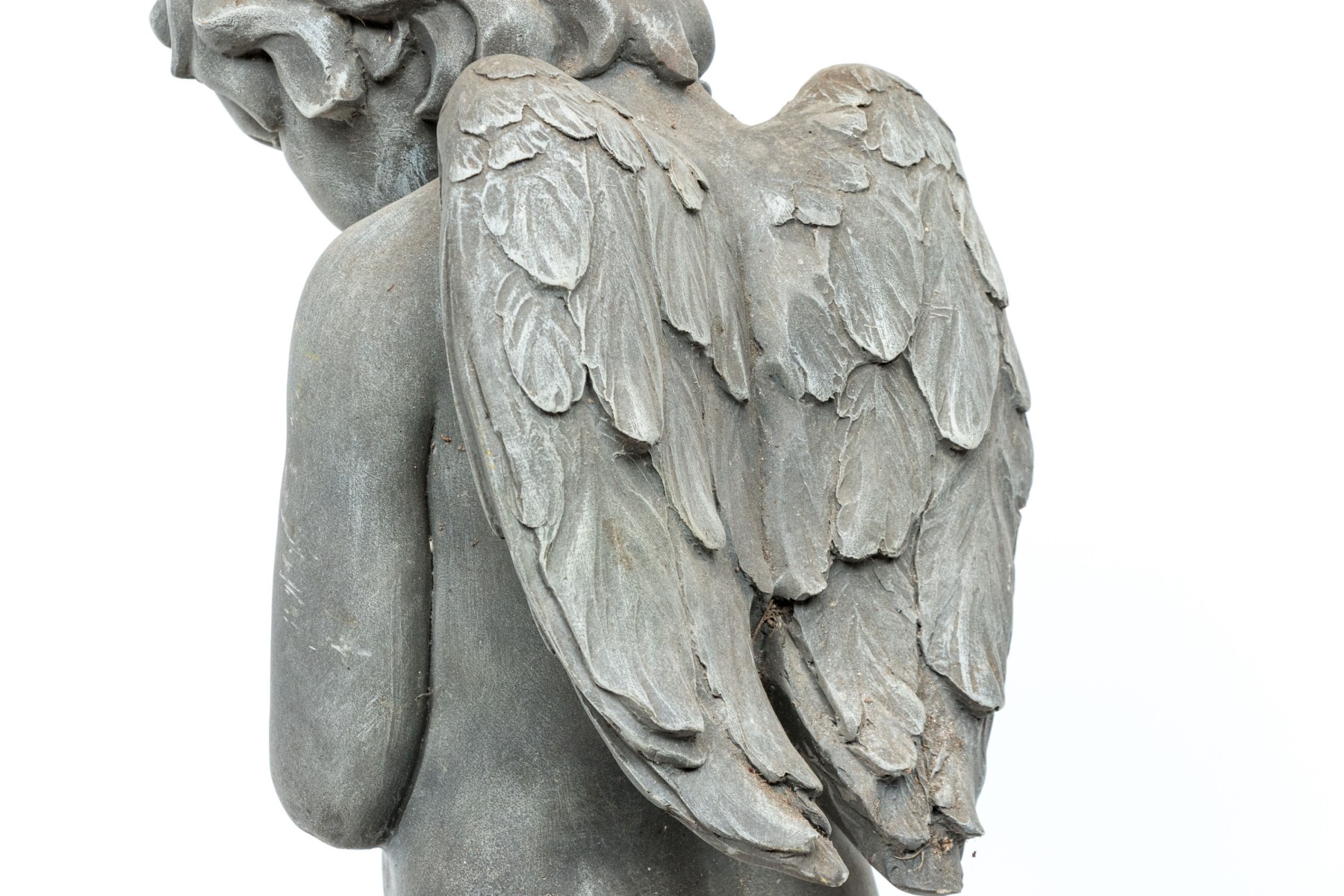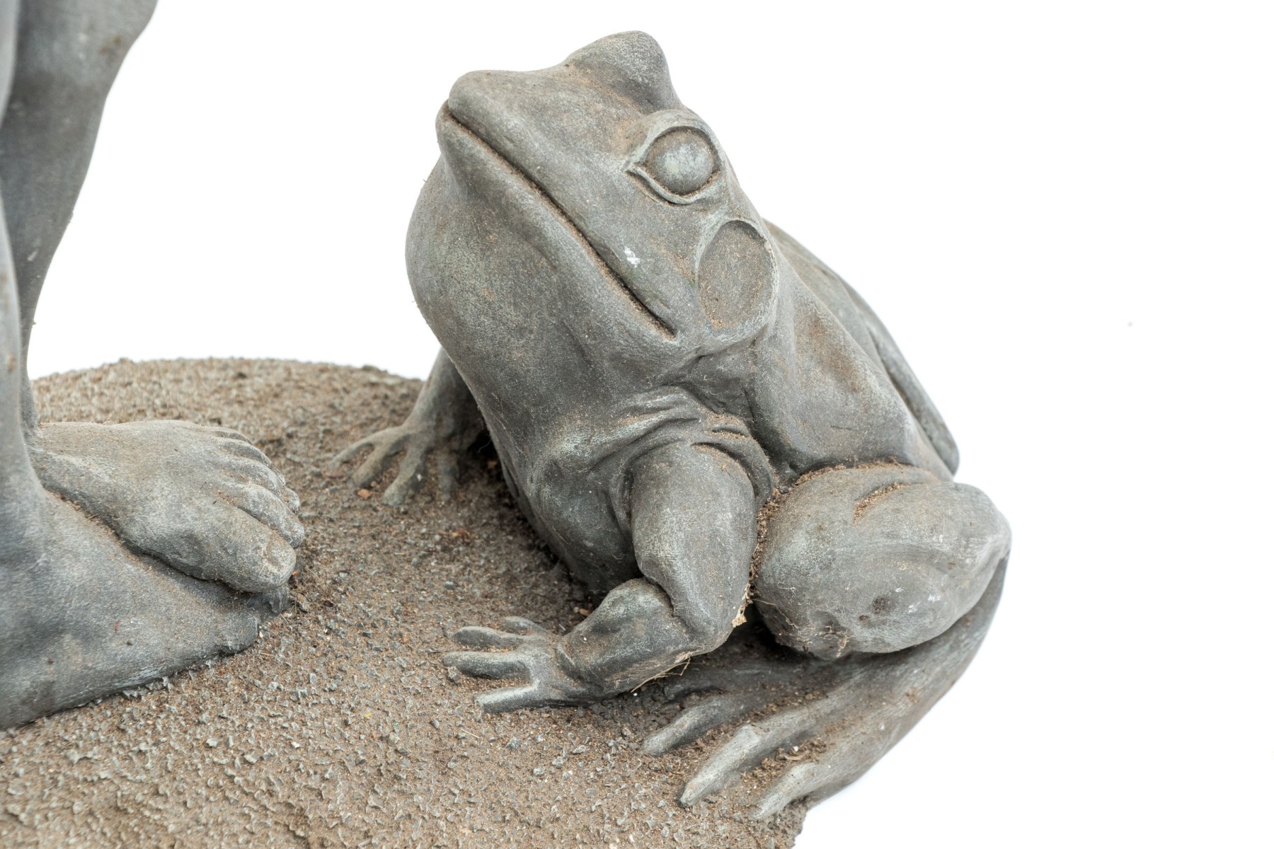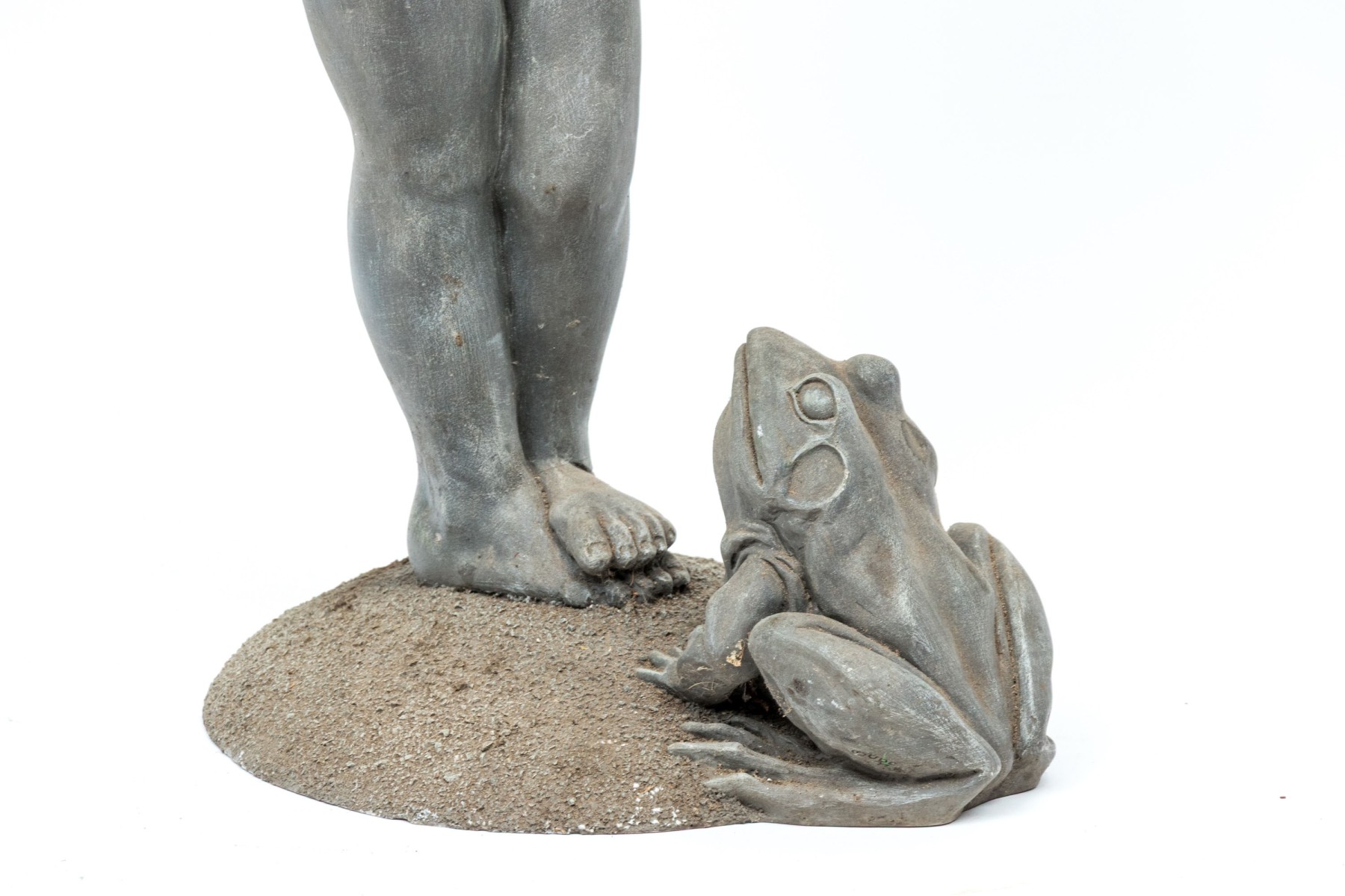 A charming garden sculpture in the form of a cherub with his arms crossed and wings pulled back and in standing on a base appearing to gaze downwards at a bullfrog that gazed up.