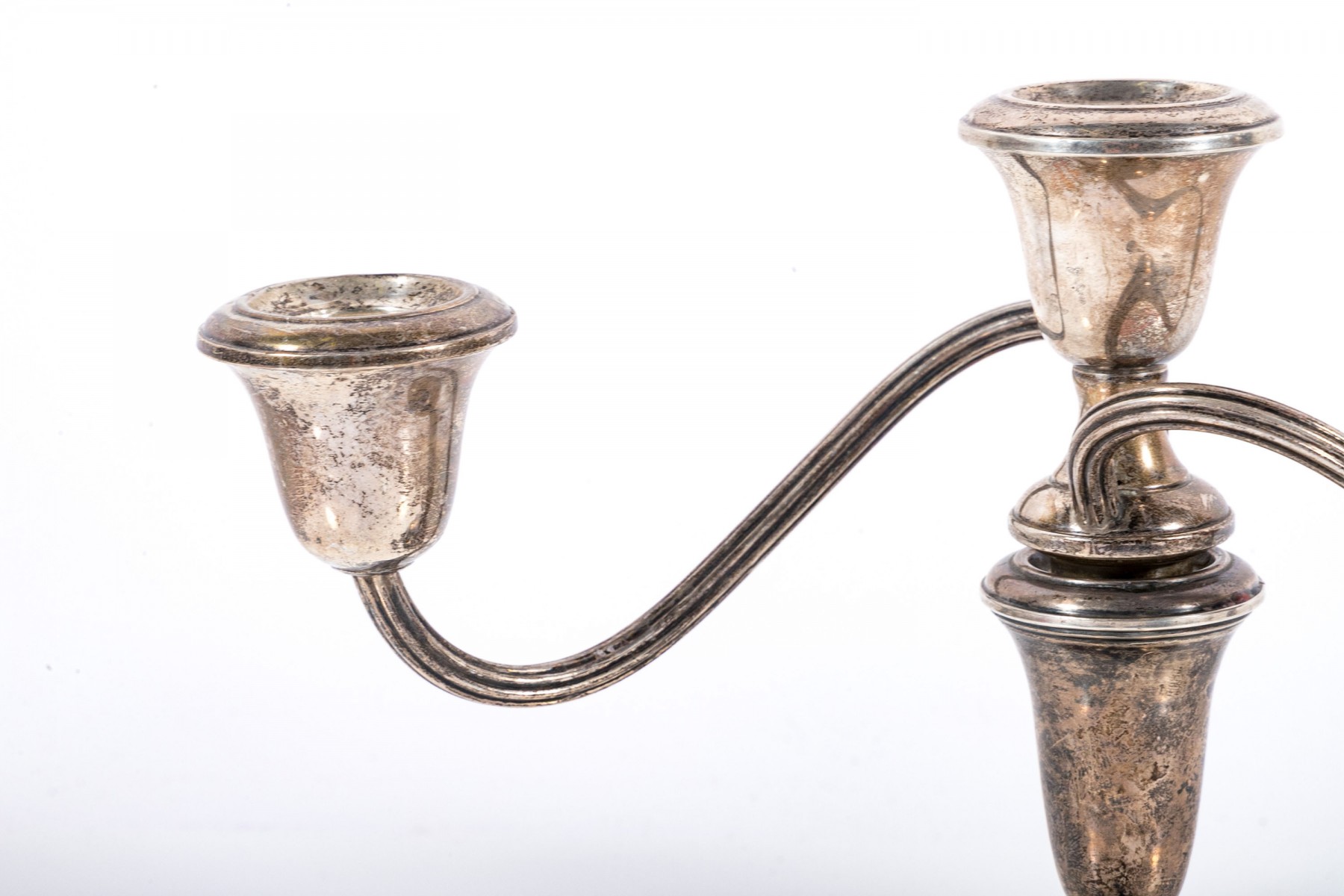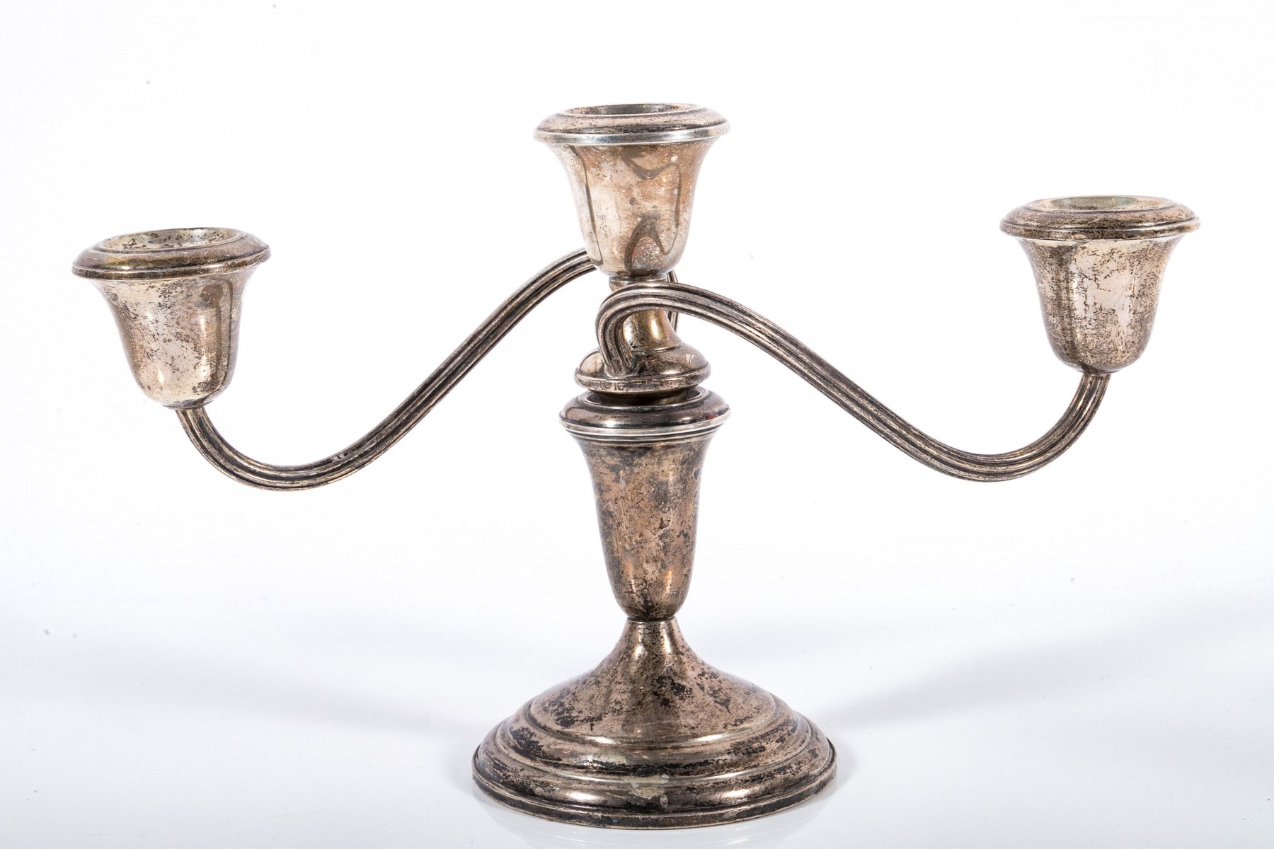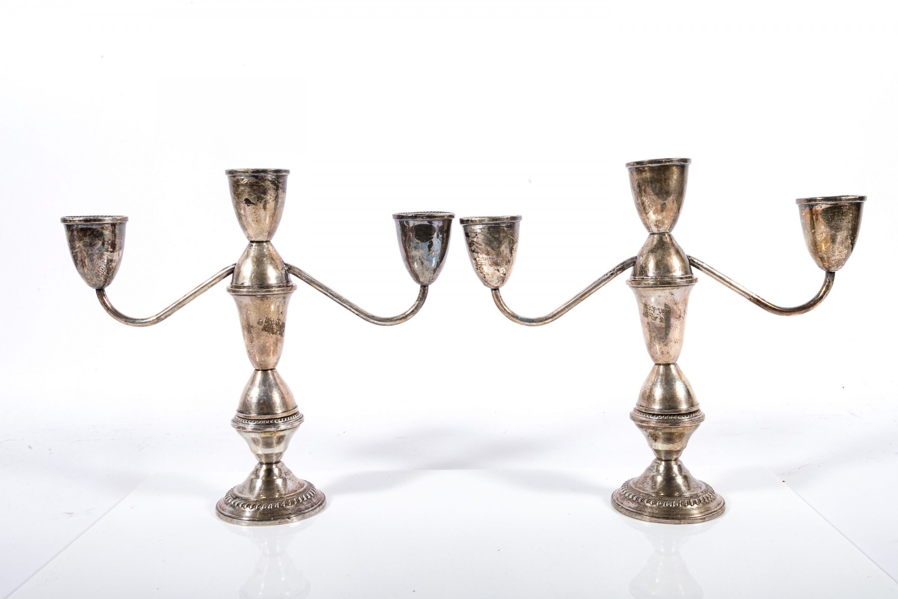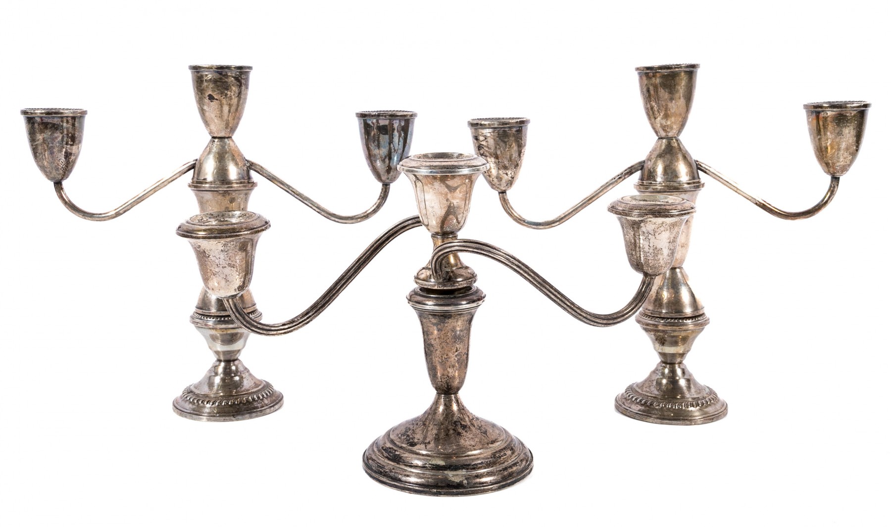 A wonderful garniture trio of weighted sterling silver candelabras. The pair displays simply curving arms and an hourglass figure over bases with elegantly flourished relief borders. The third sports dramatic twisting arms over a simple base with a concentrically tiered base.