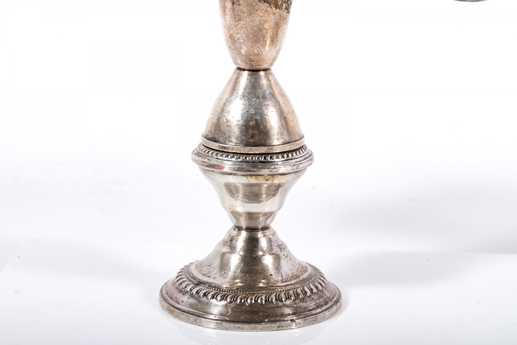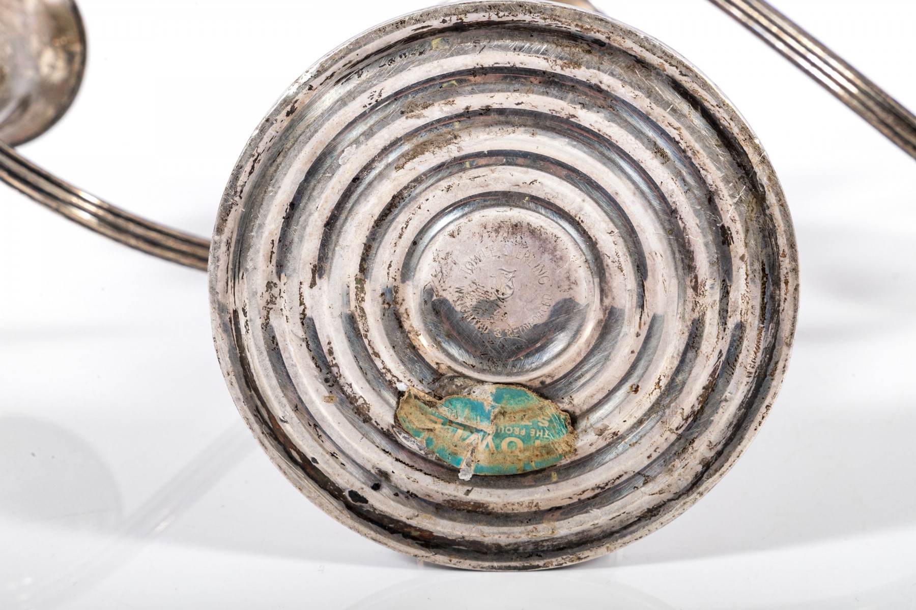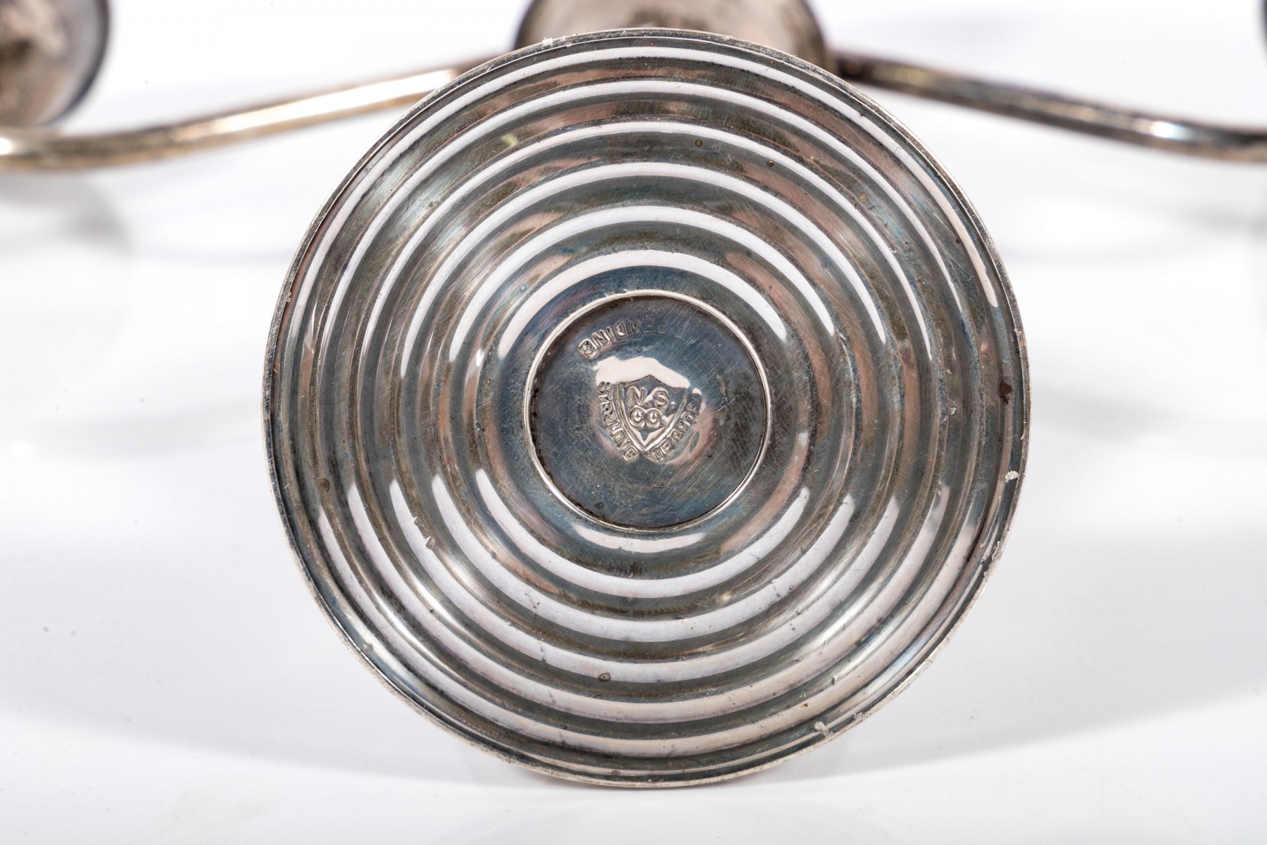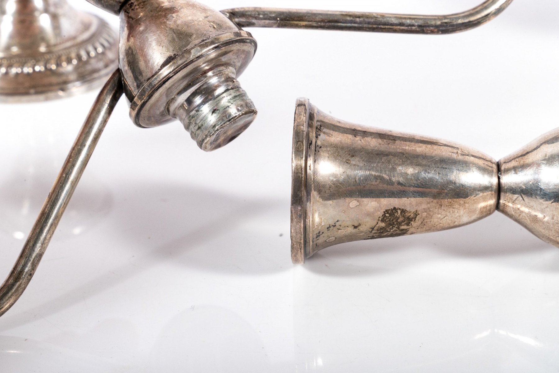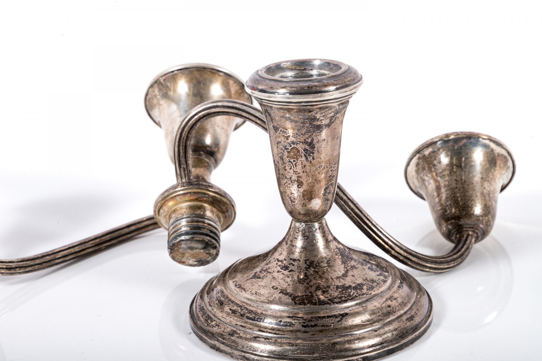 A wonderful garniture trio of weighted sterling silver candelabras. The pair displays simply curving arms and an hourglass figure over bases with elegantly flourished relief borders. The third sports dramatic twisting arms over a simple base with a concentrically tiered base.