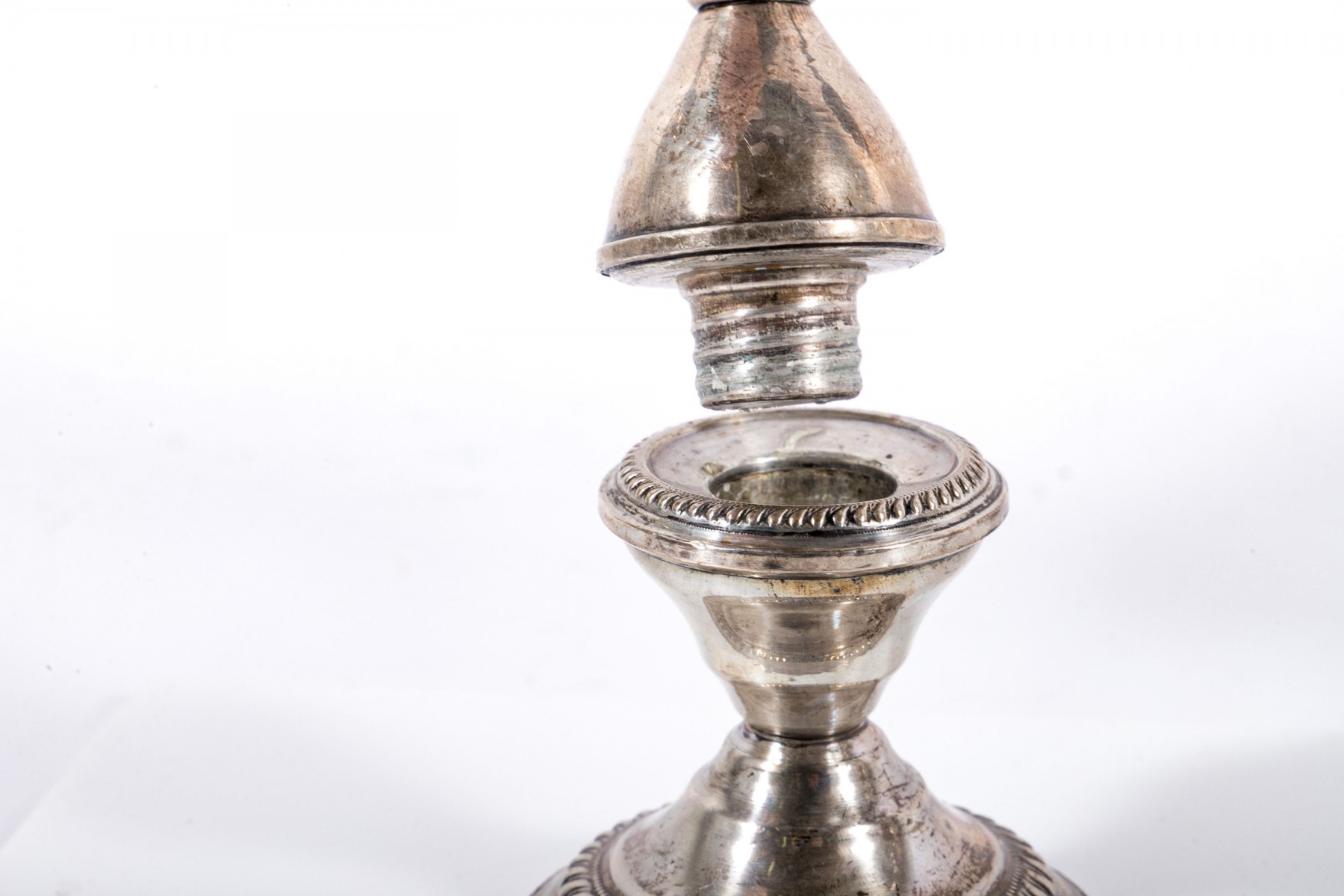 Tarnishing, minor denting, minor wax residue. The pair has matching tops that are a different pattern from the matching bases; the bases are not threaded leading to the tops having a wobble. The third's top is also a different pattern than the bottom, leading to a minor gap where the threading doesn't align perfectly.