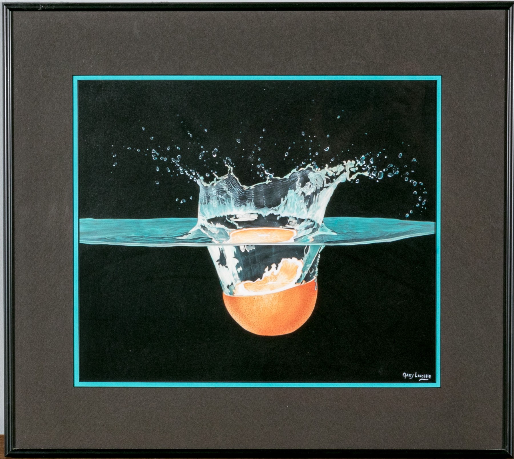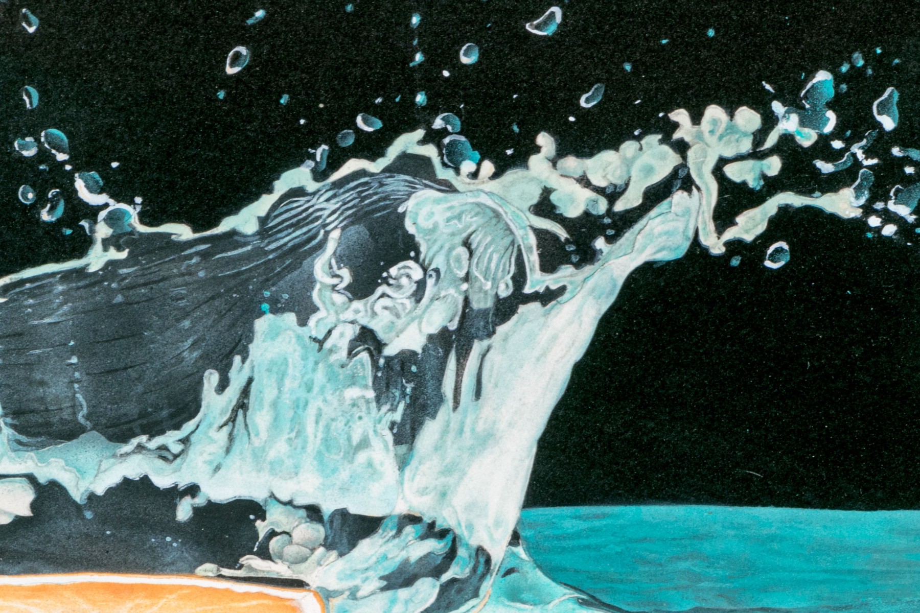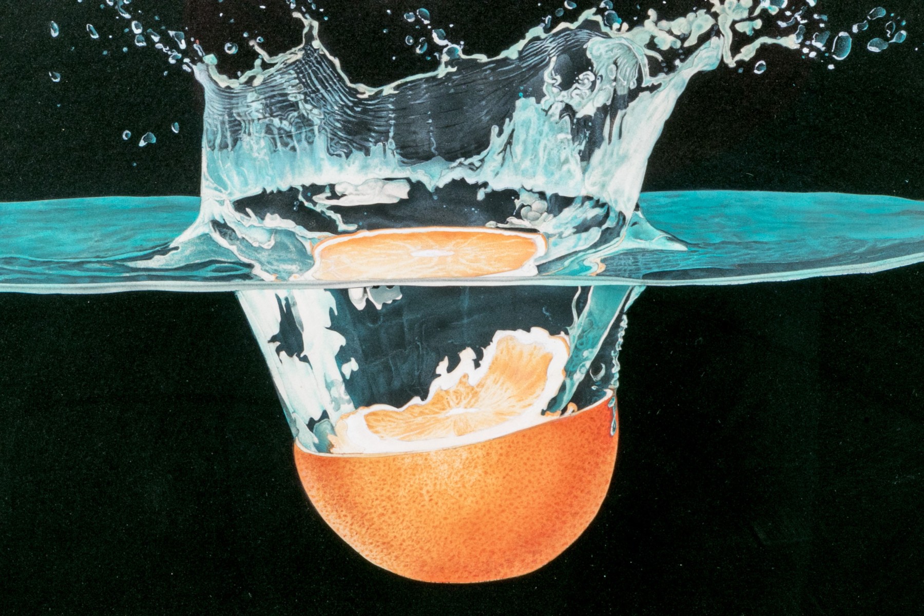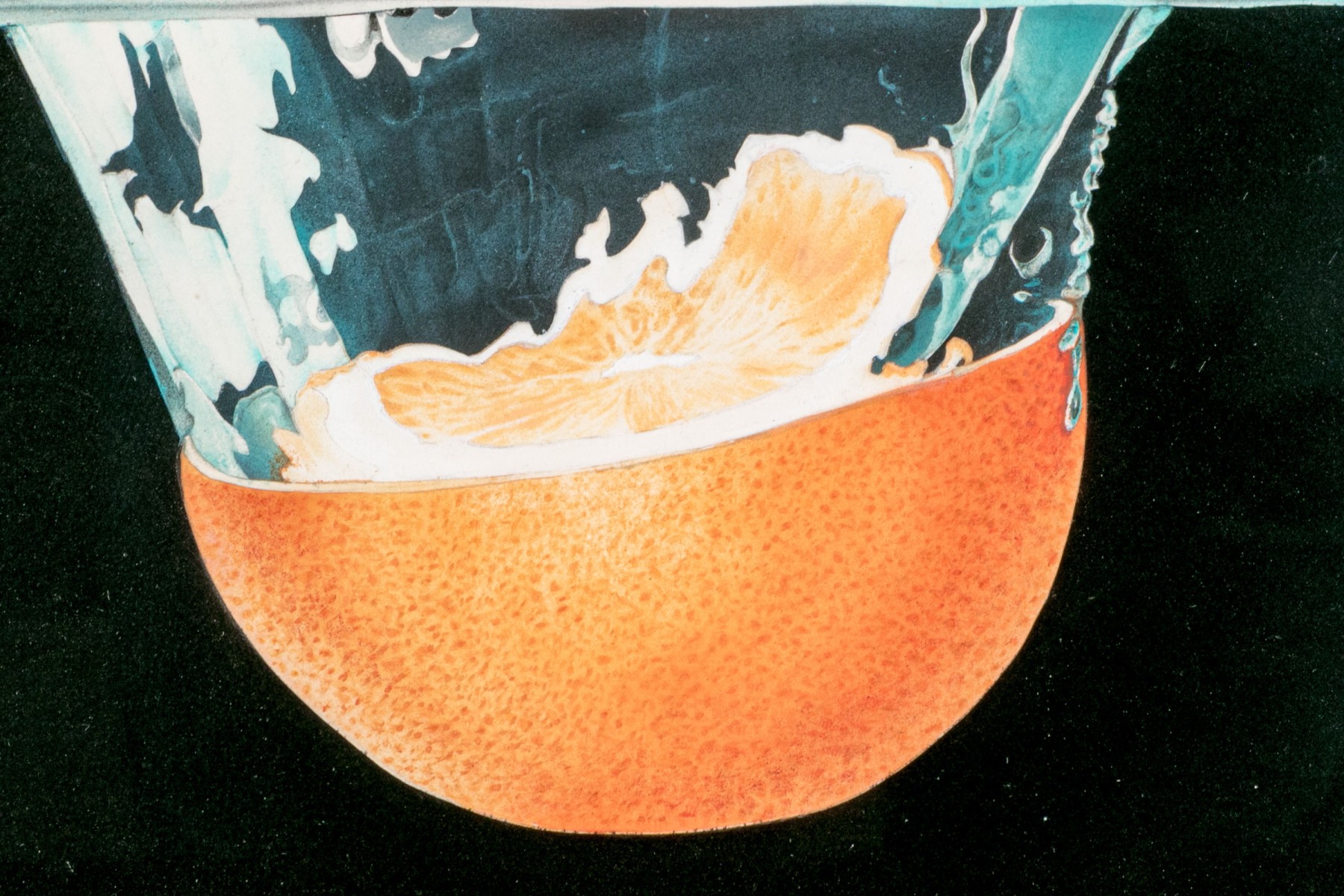 The artist has used a black ground substrate with pastel colors and painted a scene that seemingly is static and fleeting at the same time. The image depicts a cut half orange having been dropped and plunged into water where the splash is marvelously depicted with fantastic draughtsmanship.