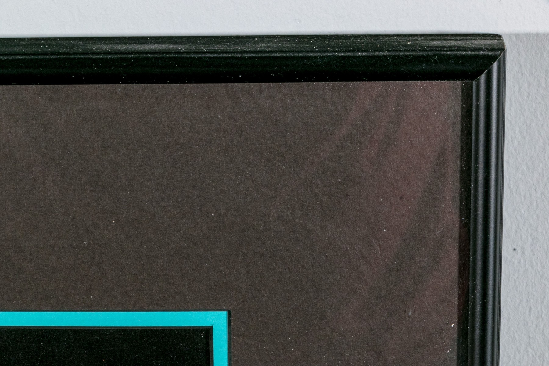 The painting has a thin turquoise-teal and black mat within a black finished frame and glazed with plexiglass.