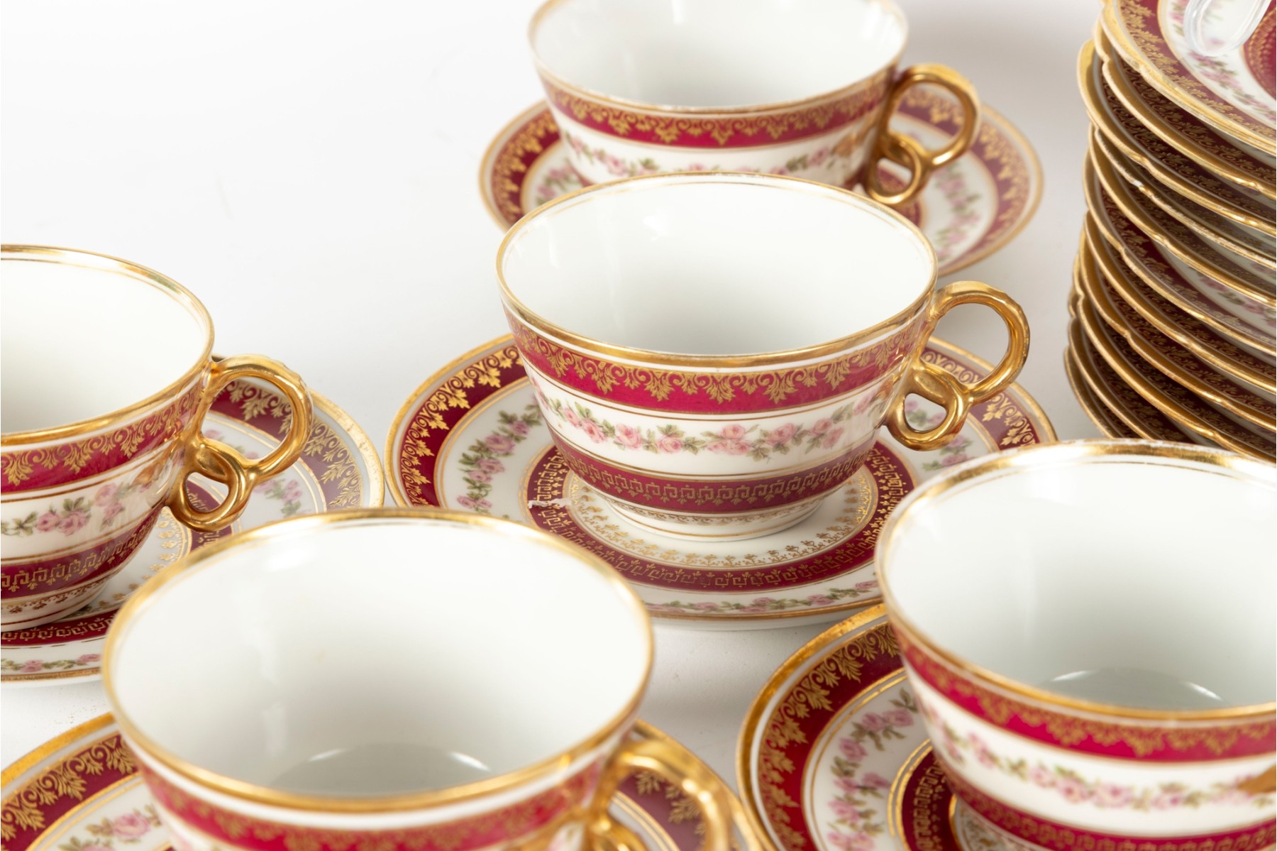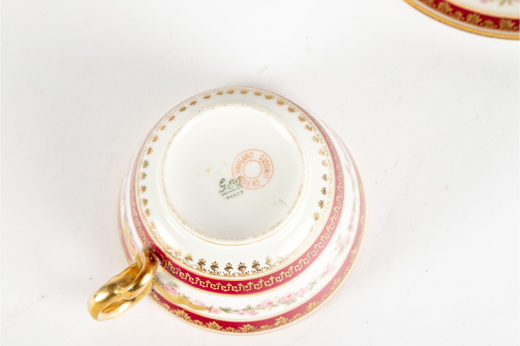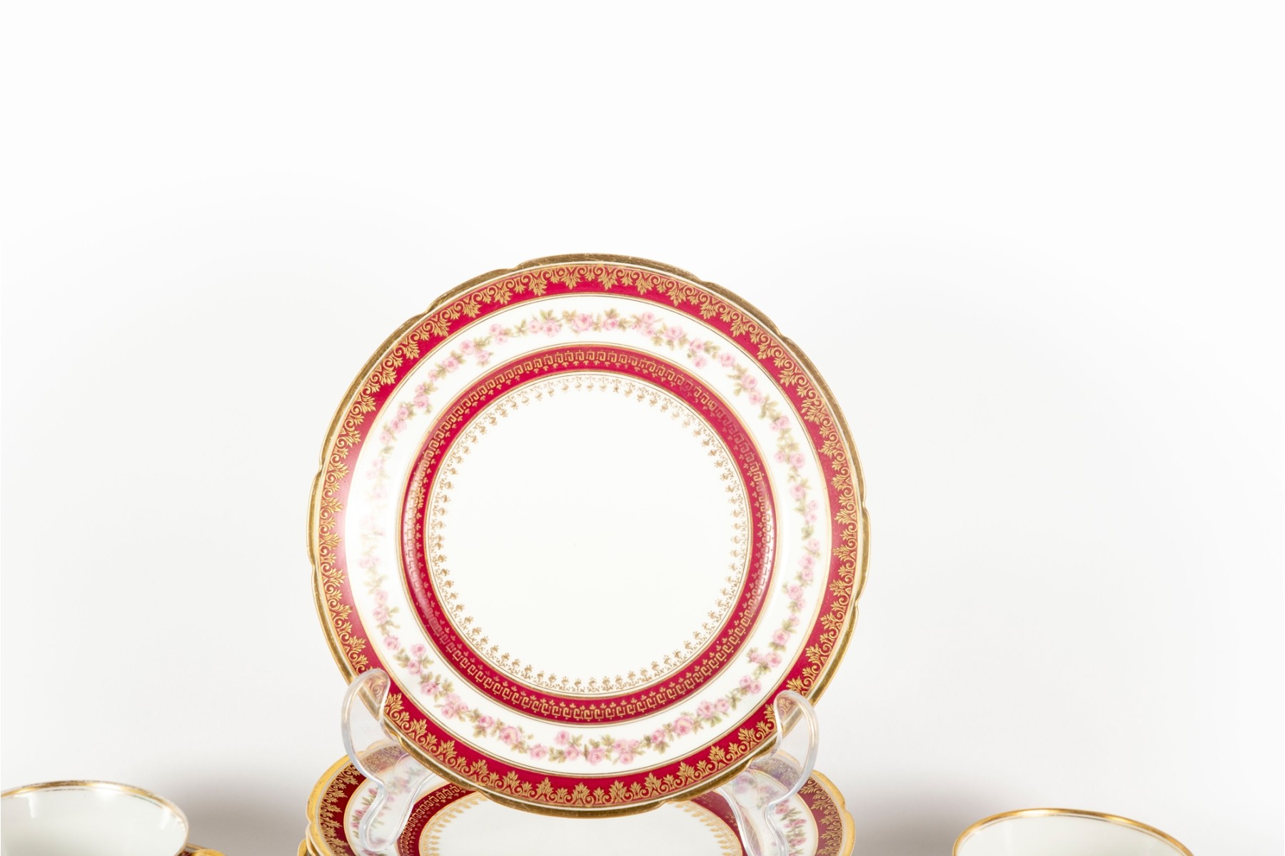 A delightful GDA Haviland Limoges porcelain service designed with bright white bodies, gilt rims, and ruby red borders including gilt foliate tessellations and key frets. The pieces are further decorated with pretty pink flowers and soft green foliage. Contents as shown and sold as is.