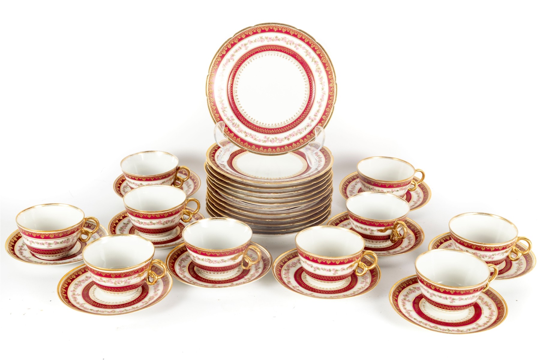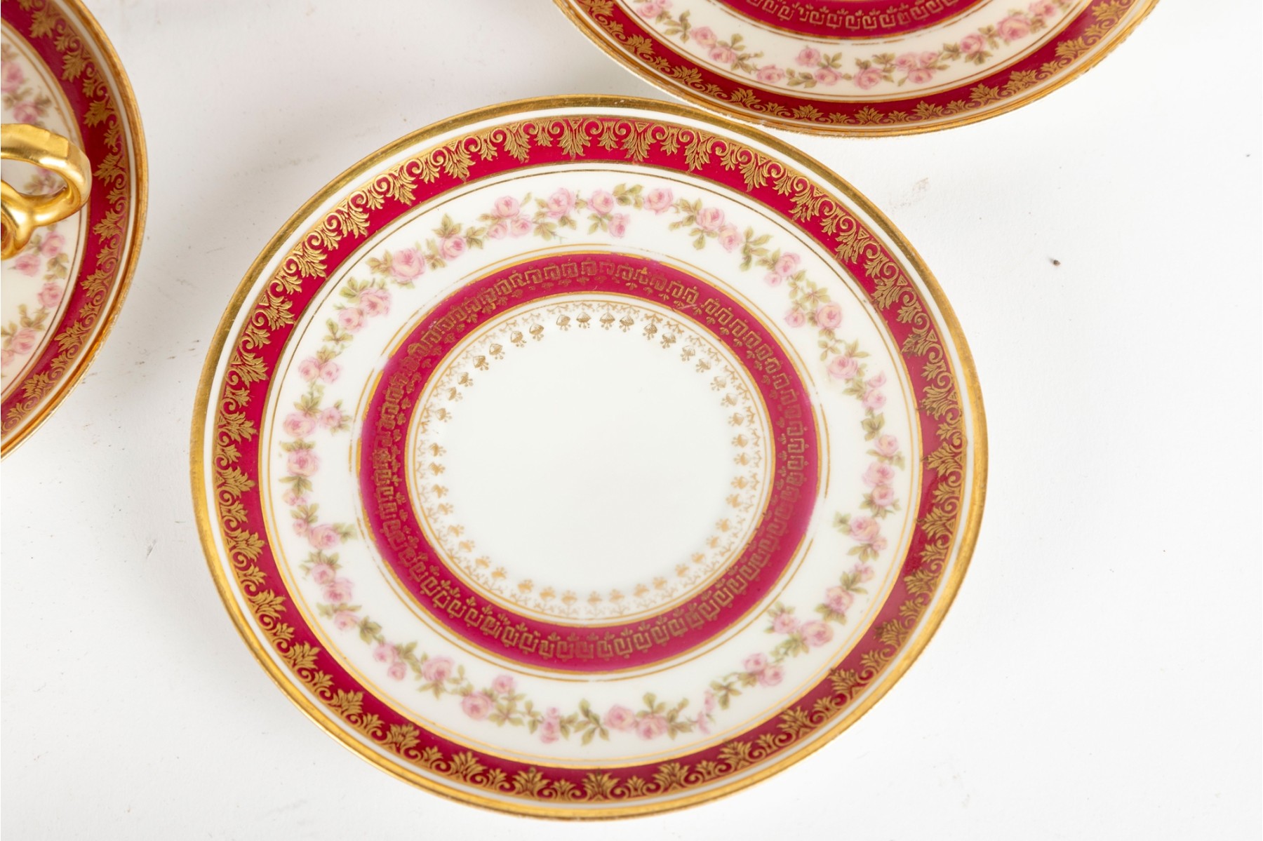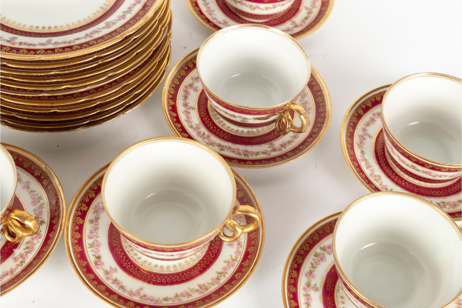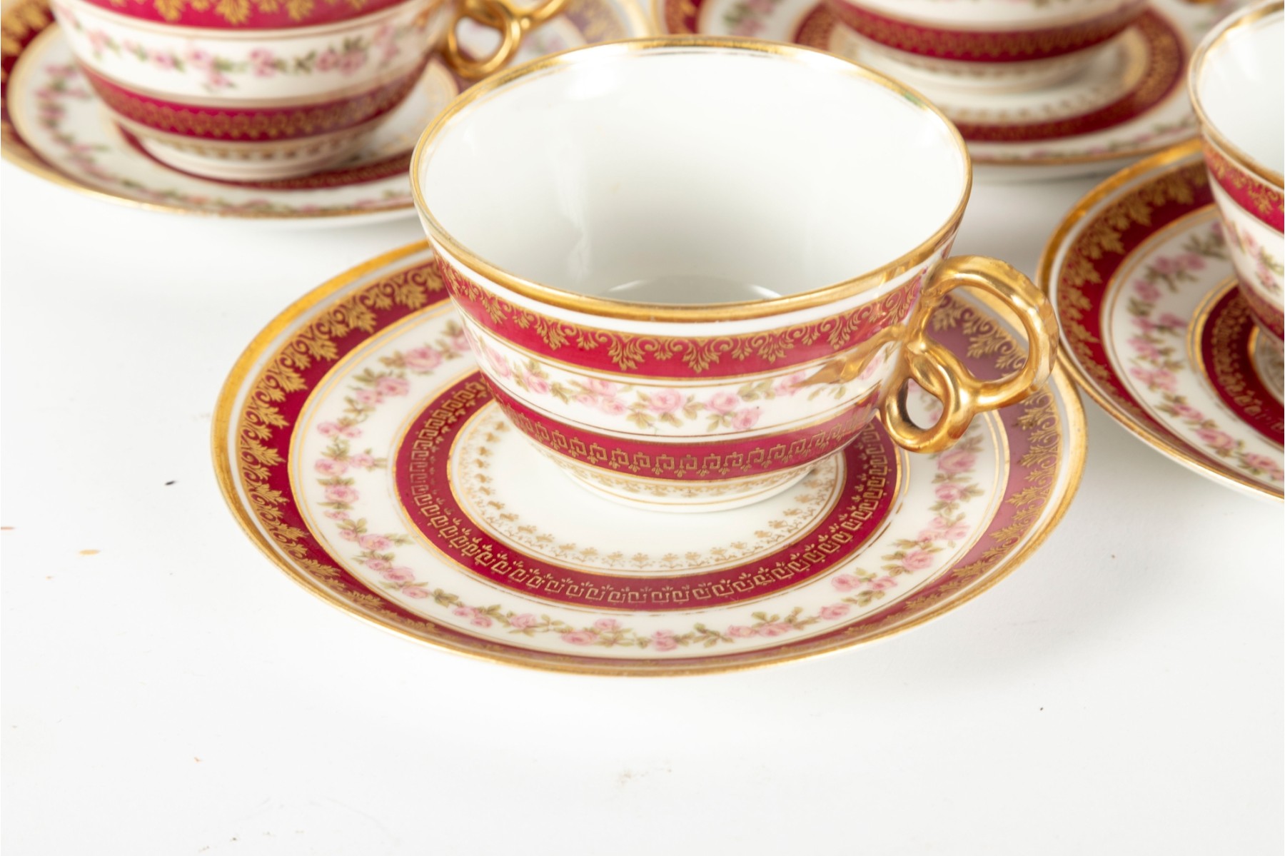 A delightful GDA Haviland Limoges porcelain service designed with bright white bodies, gilt rims, and ruby red borders including gilt foliate tessellations and key frets. The pieces are further decorated with pretty pink flowers and soft green foliage. Contents as shown and sold as is.