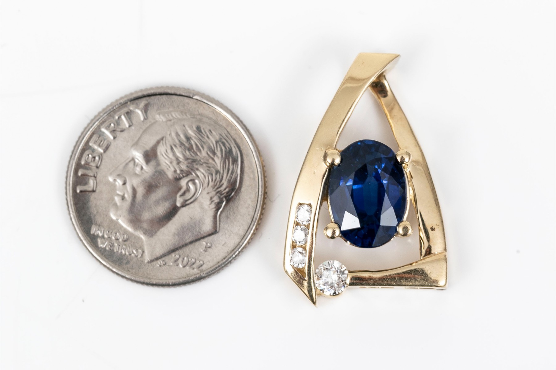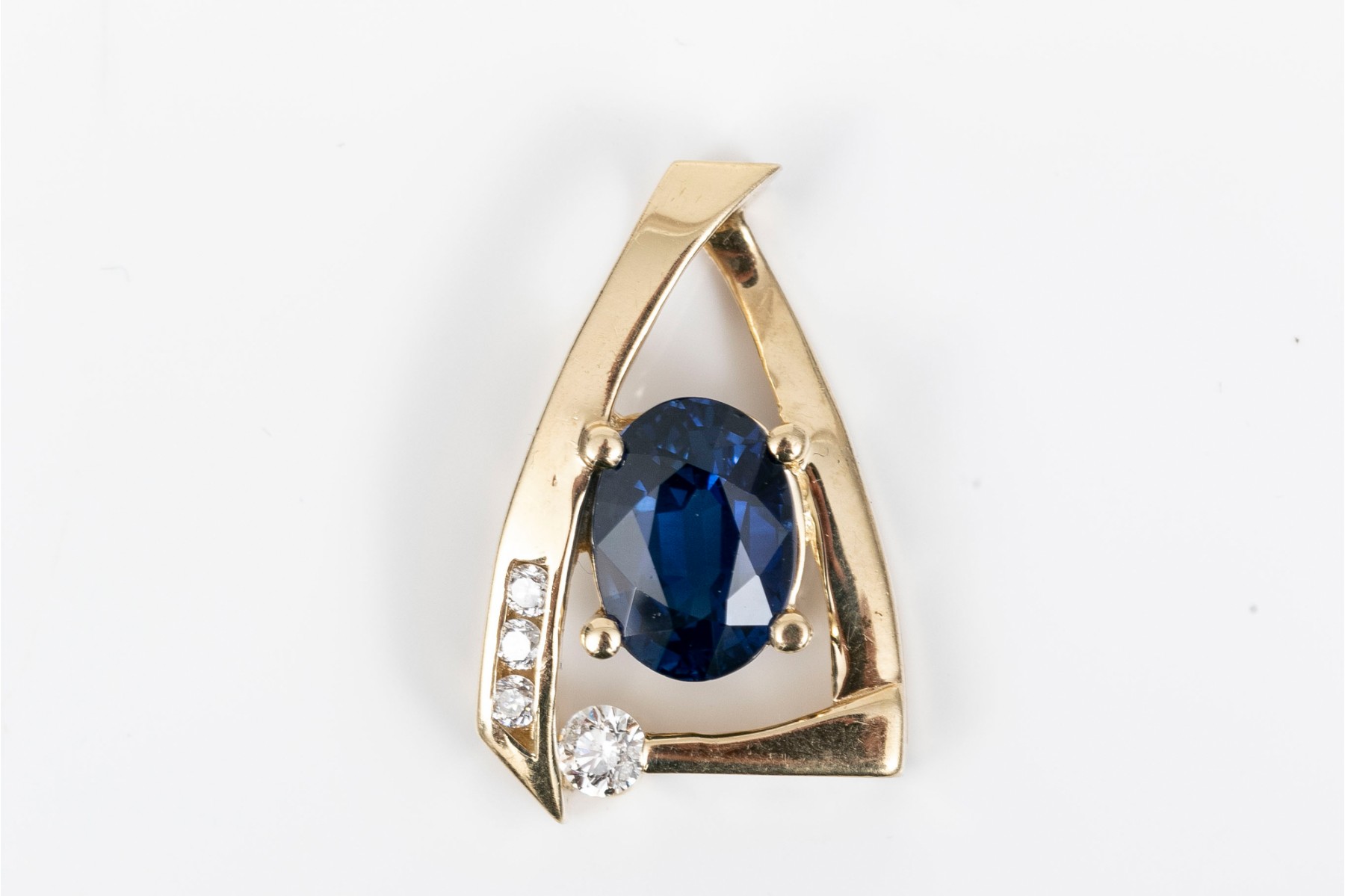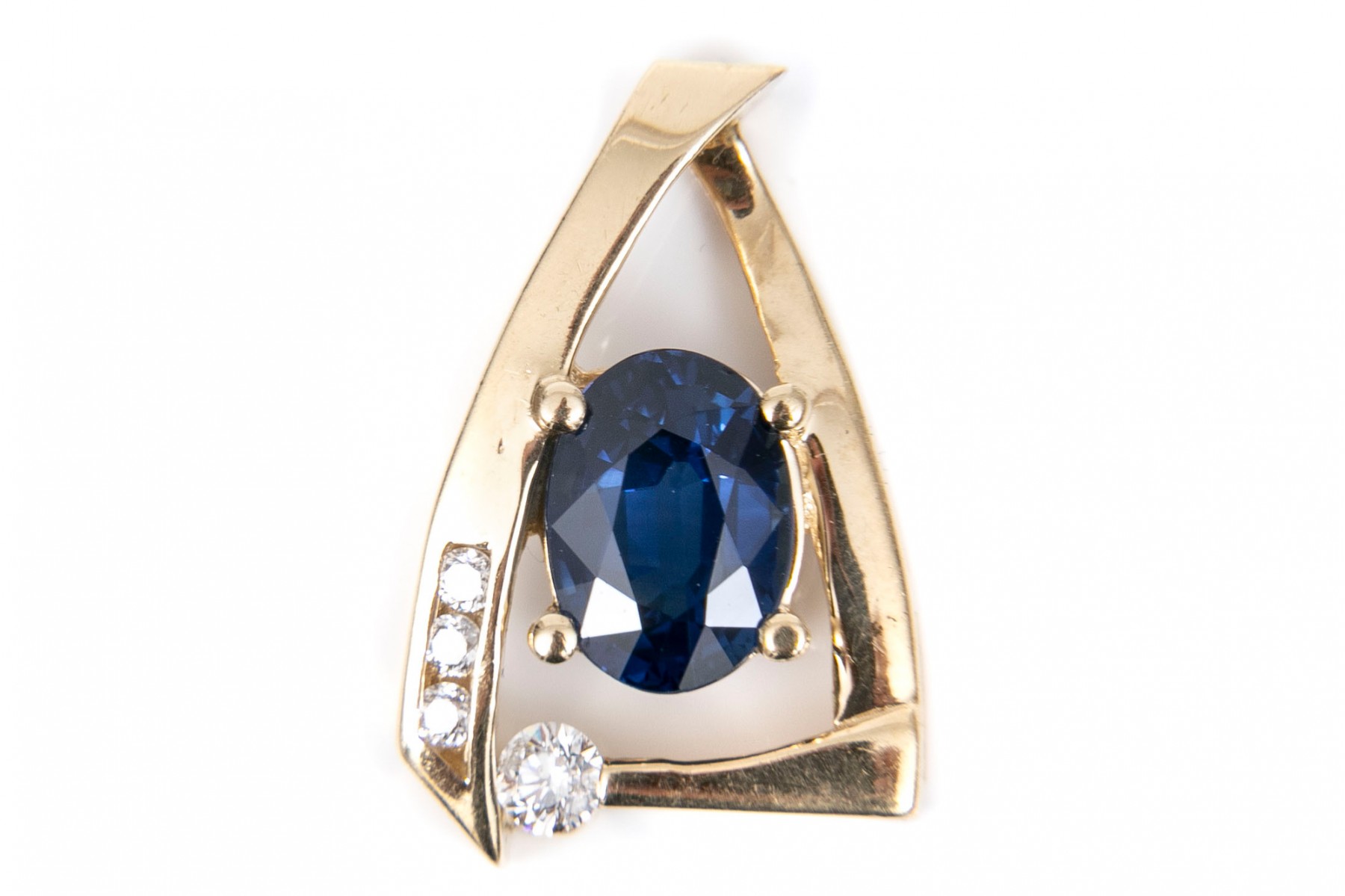 14K yellow gold pendant. This geometric triangular pendant is a set with a single oval faceted sapphire at the center while round brilliant diamonds are set off to the side. The diamonds are approximately 0.19 TCW and the sapphire is approximately 2.2 cts.
