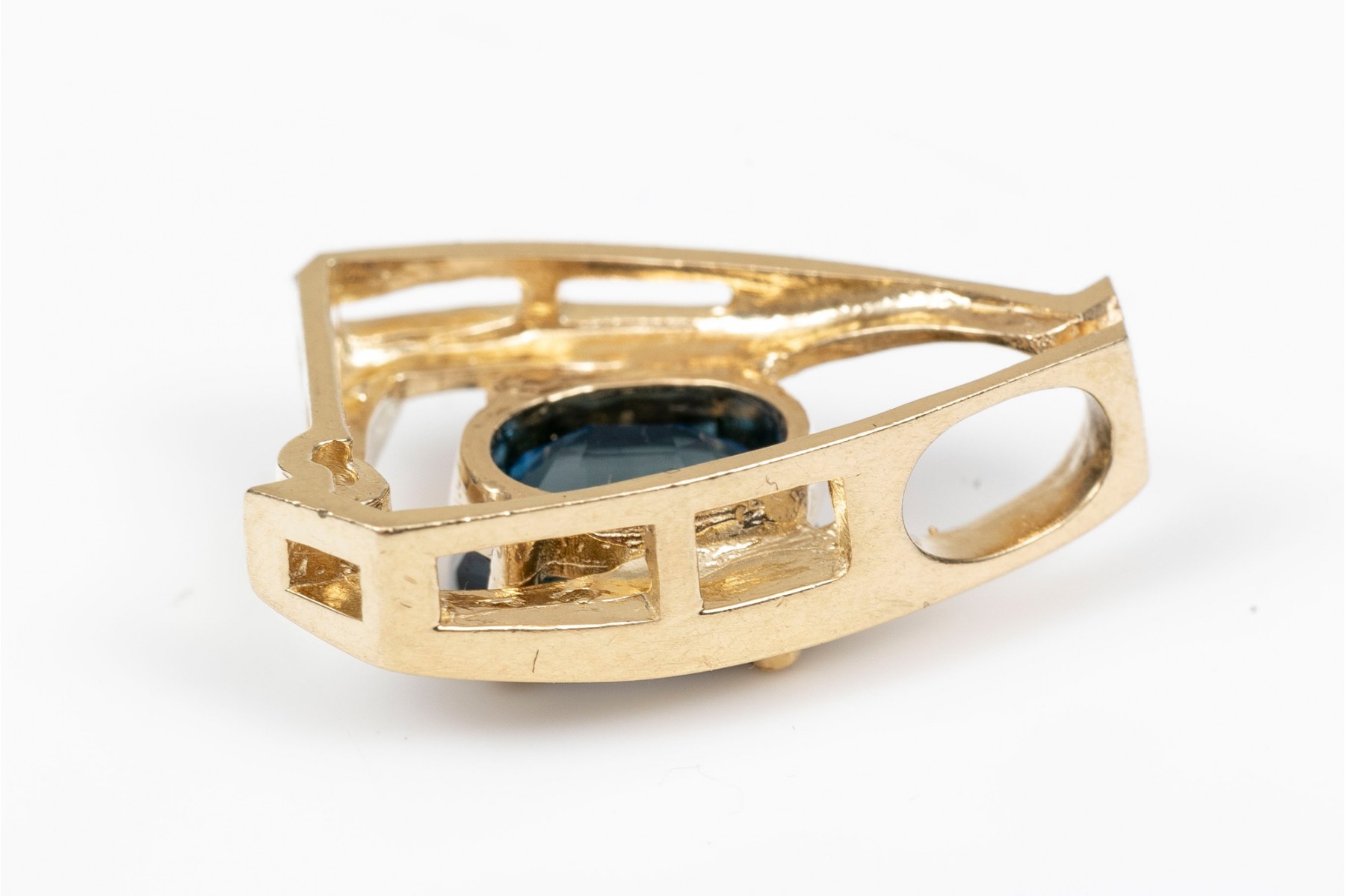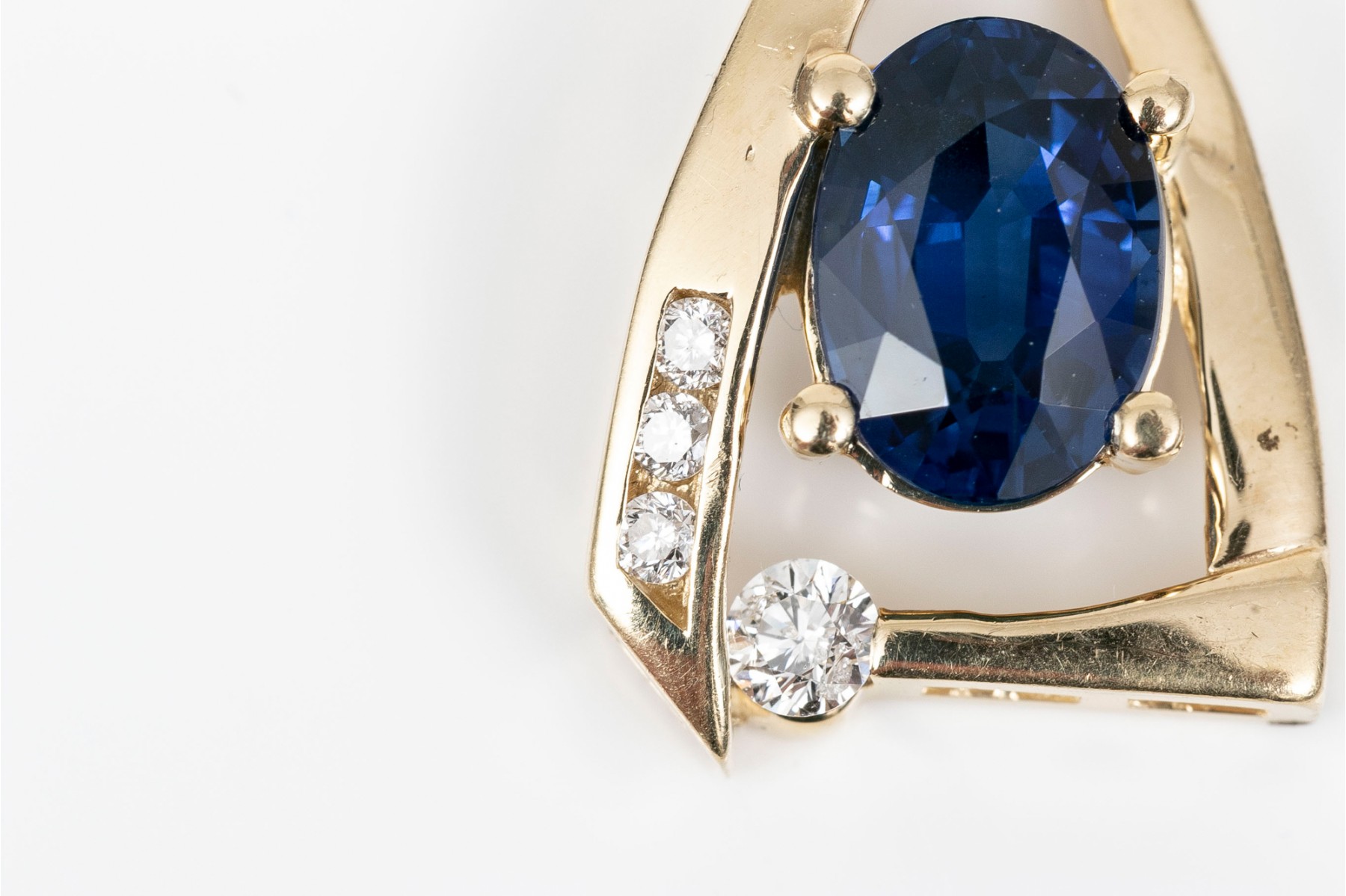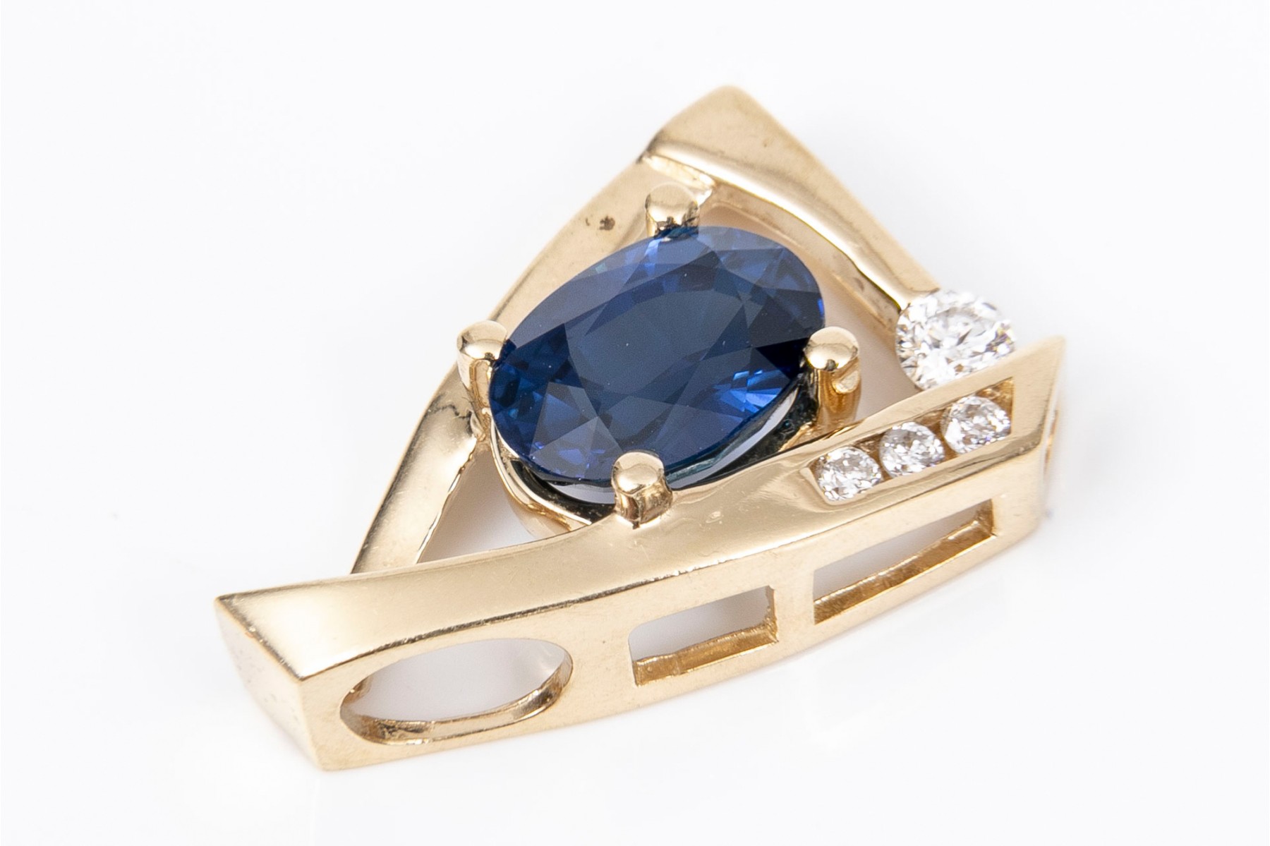 14K yellow gold pendant. This geometric triangular pendant is a set with a single oval faceted sapphire at the center while round brilliant diamonds are set off to the side. The diamonds are approximately 0.19 TCW and the sapphire is approximately 2.2 cts.