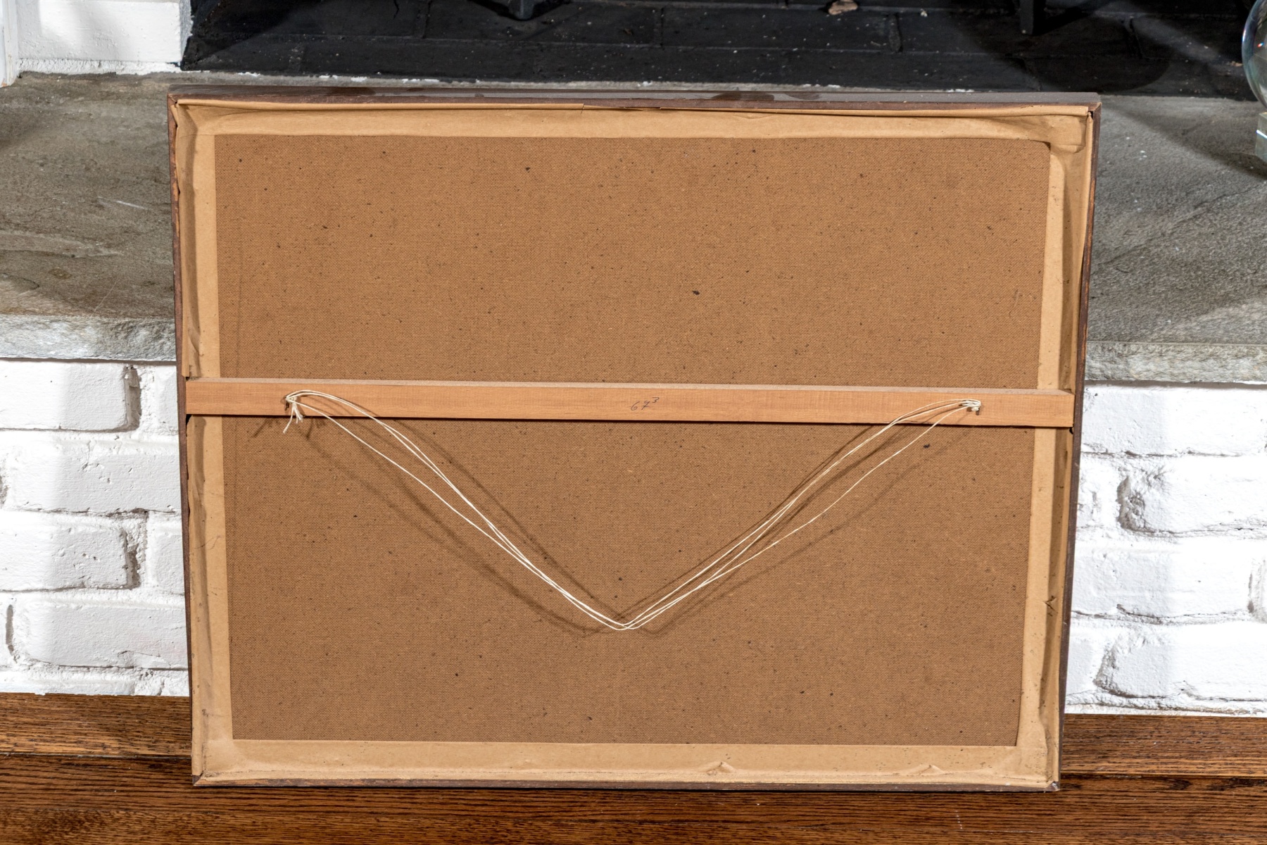 Displayed with a wood fillet and burlap surround in a wood frame.