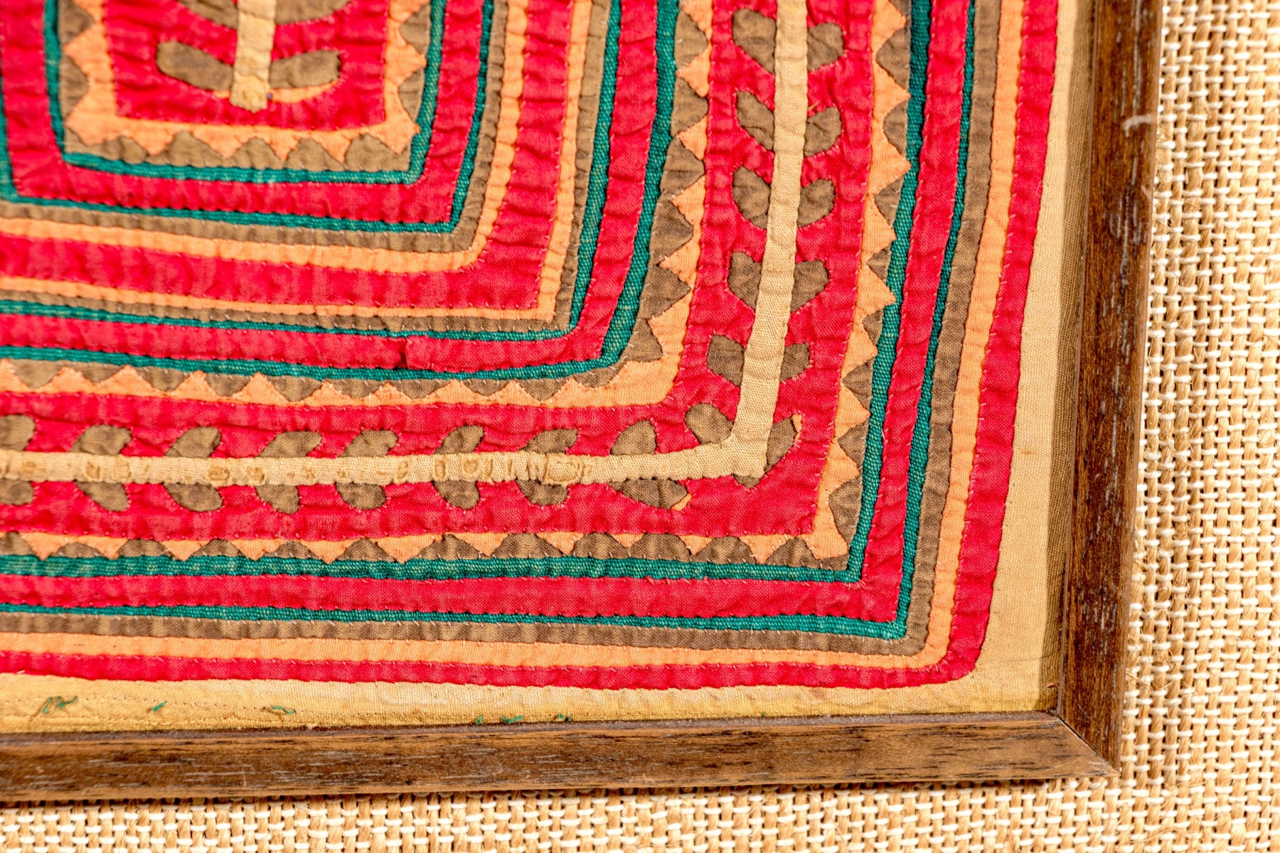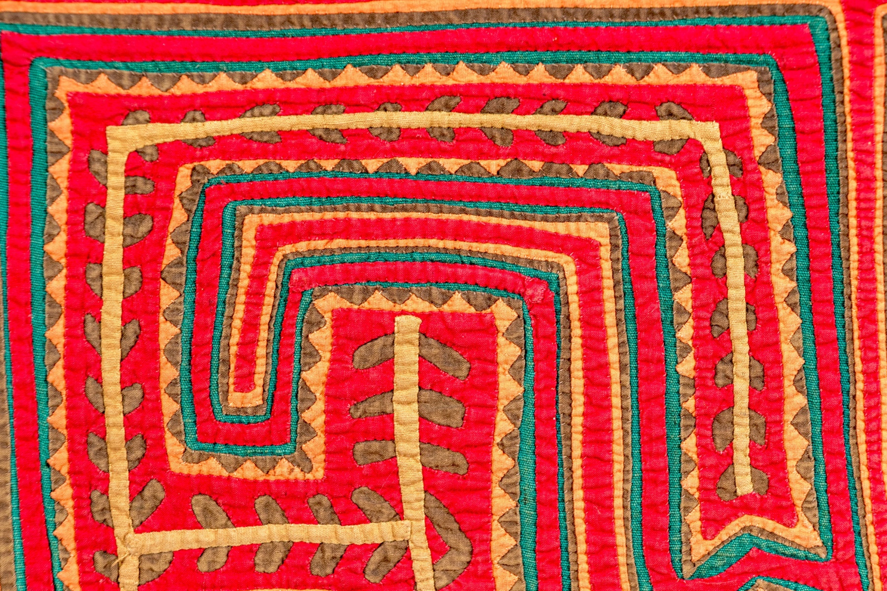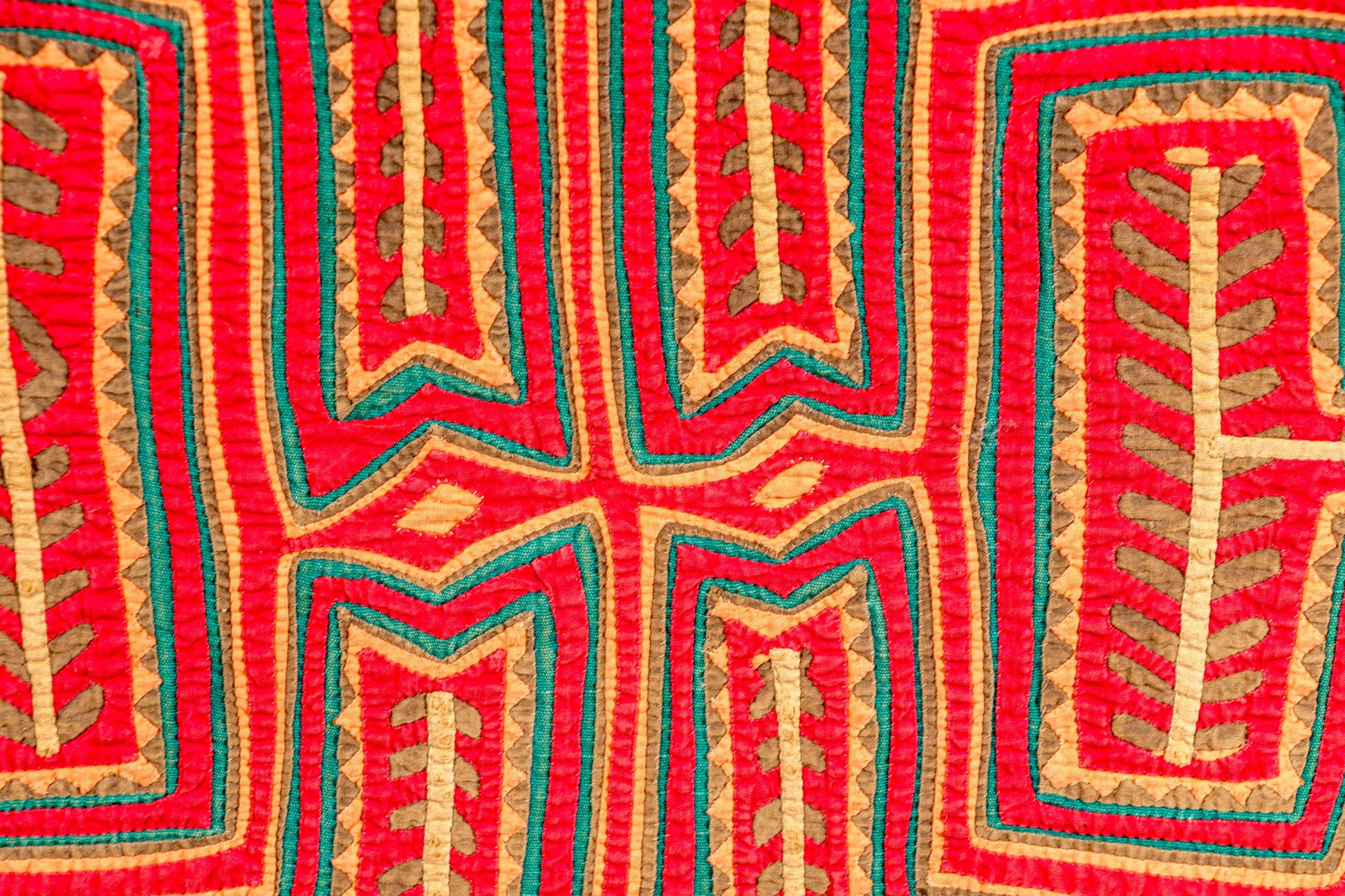 A fabulous Kuna Mola textile showcasing a symmetrical geometric design of yellow vines with green leaves surrounded by teal, sage green, and red borders.