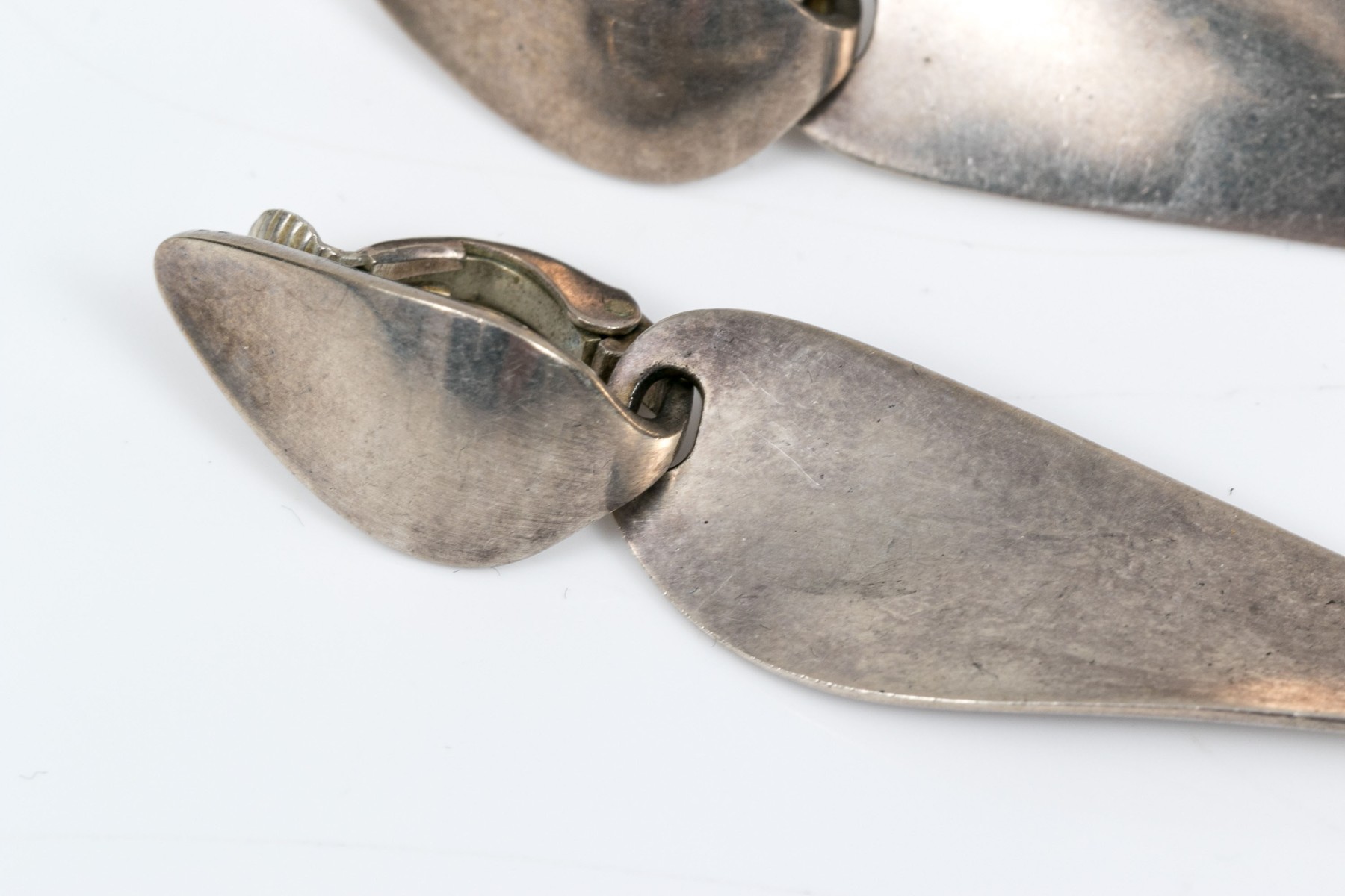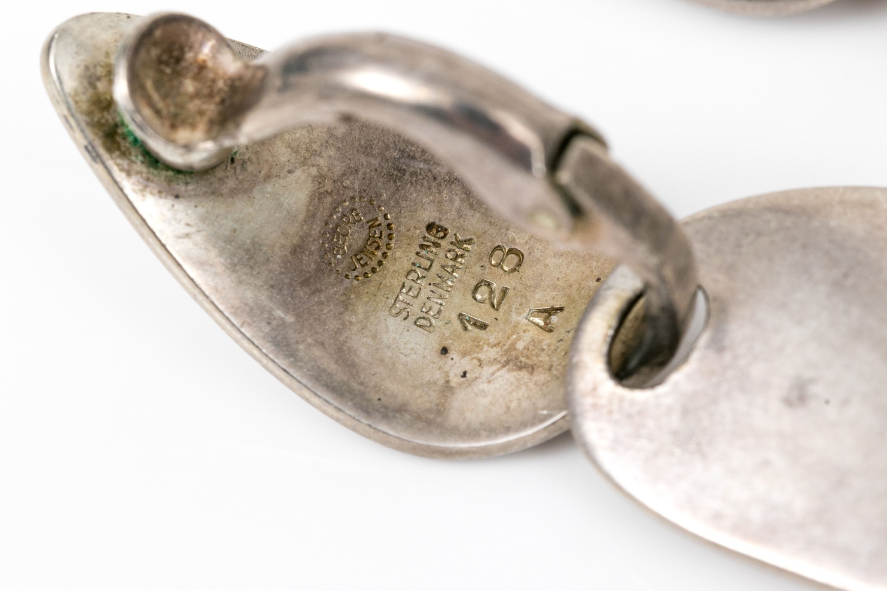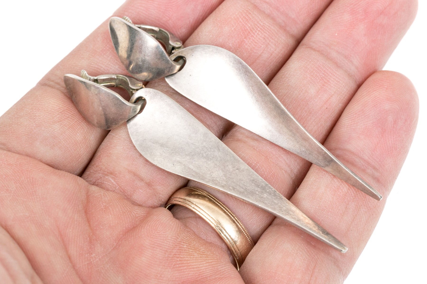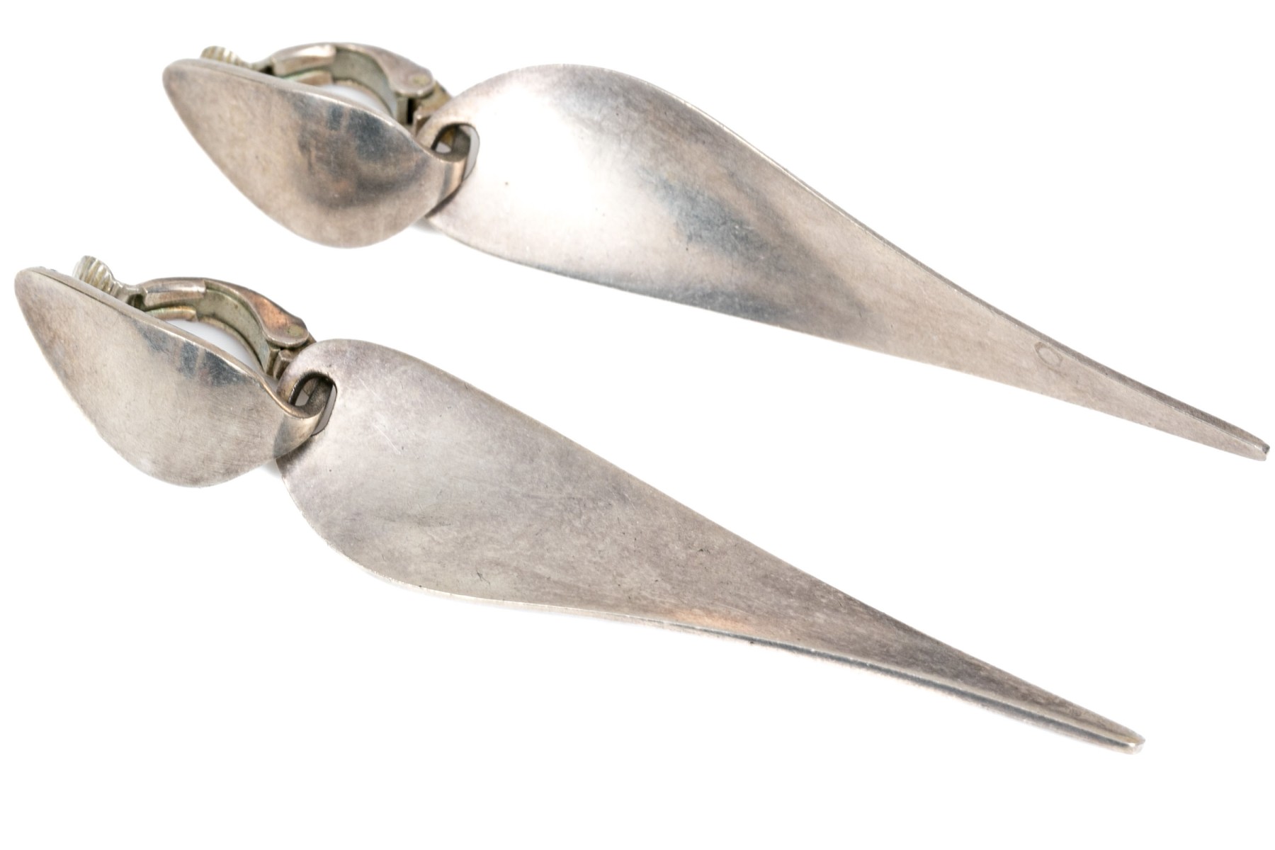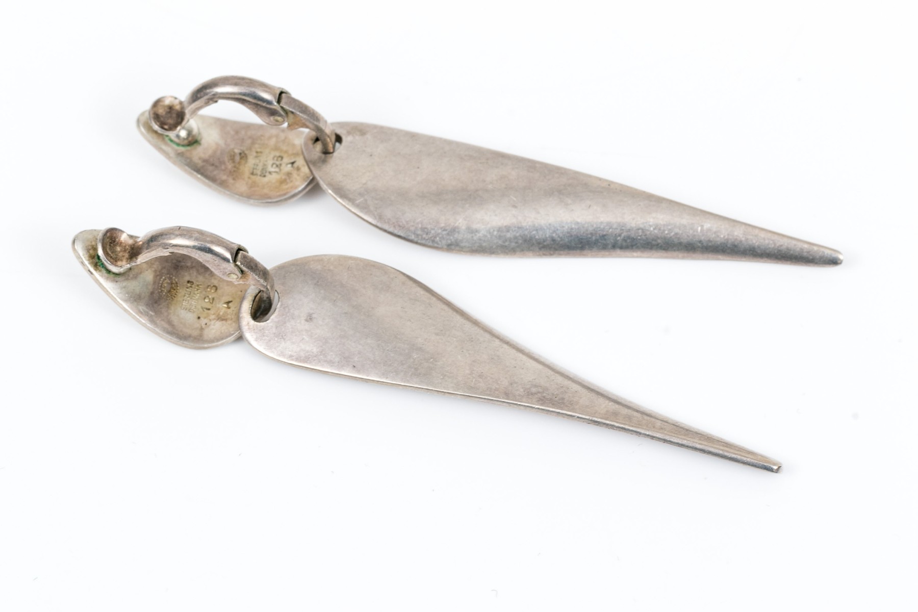 Sterling silver earrings. These wonderful Georg Jensen pendant earrings are pattern number 128A, designed by Nanna Ditzel along with her husband, Jorgen Ditzel, and features and organic convex and concave drop, and are finished with a clip on style back