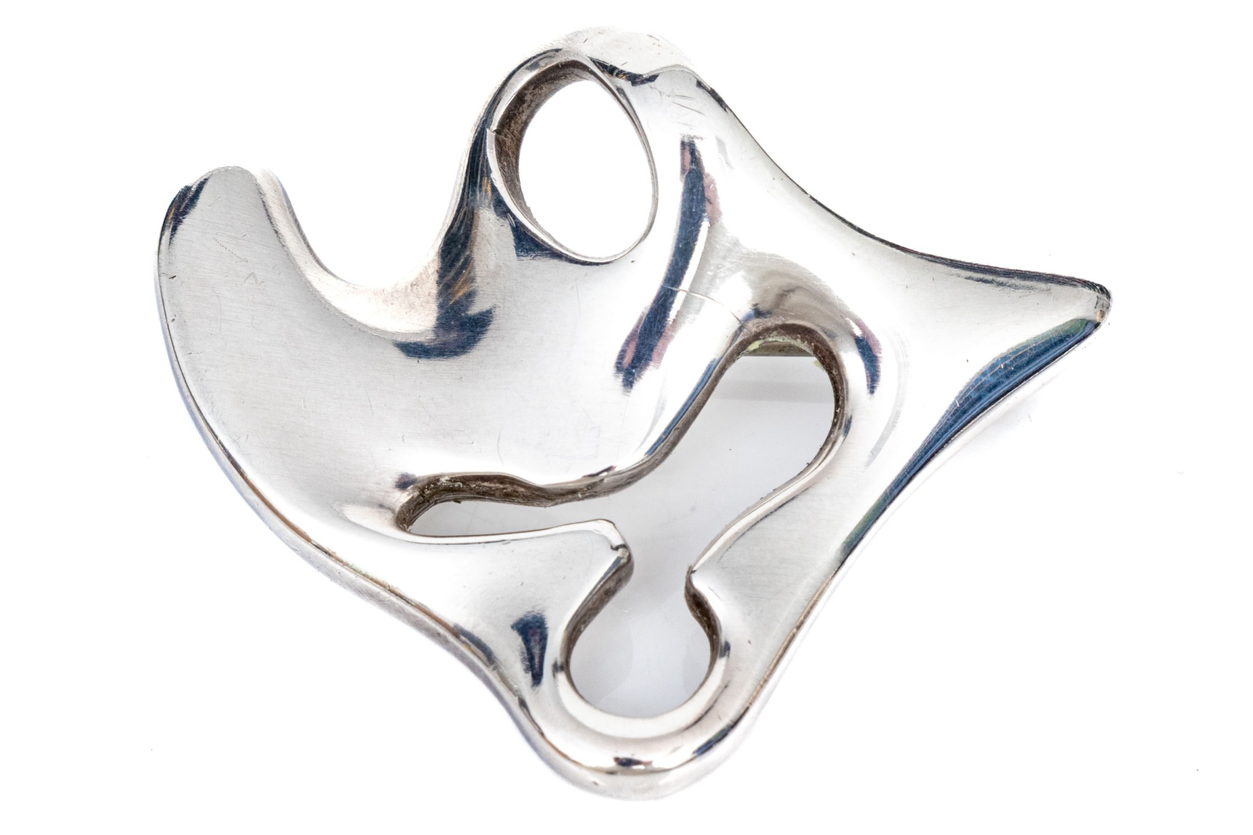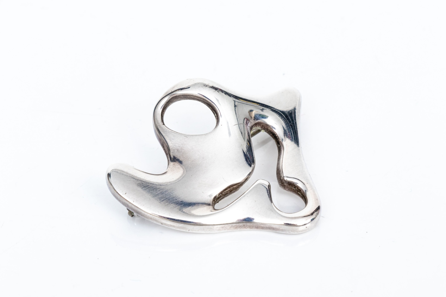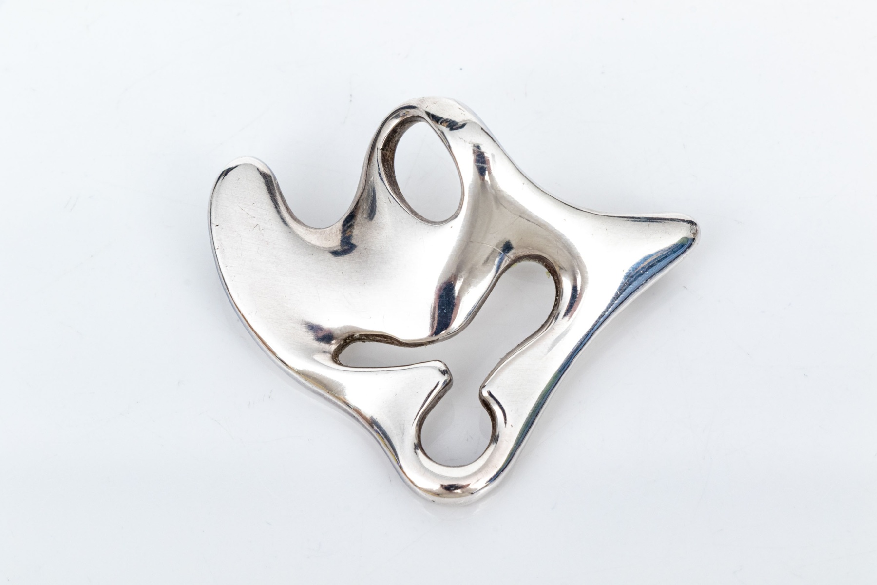 Georg Jensen sterling silver "Amoeba" pattern number 322 brooch, circa 1961. This gorgeous sterling silver brooch was designed by Henning Koppel in 1953, as brooch pattern number 322 (the "Amoeba" bracelet was designed in 1947), and "was inspired by natural, organic forms, specifically microscopic organisms and biomorphic shapes". The brooch has a pierced, naturalistic form and a high polished finish.