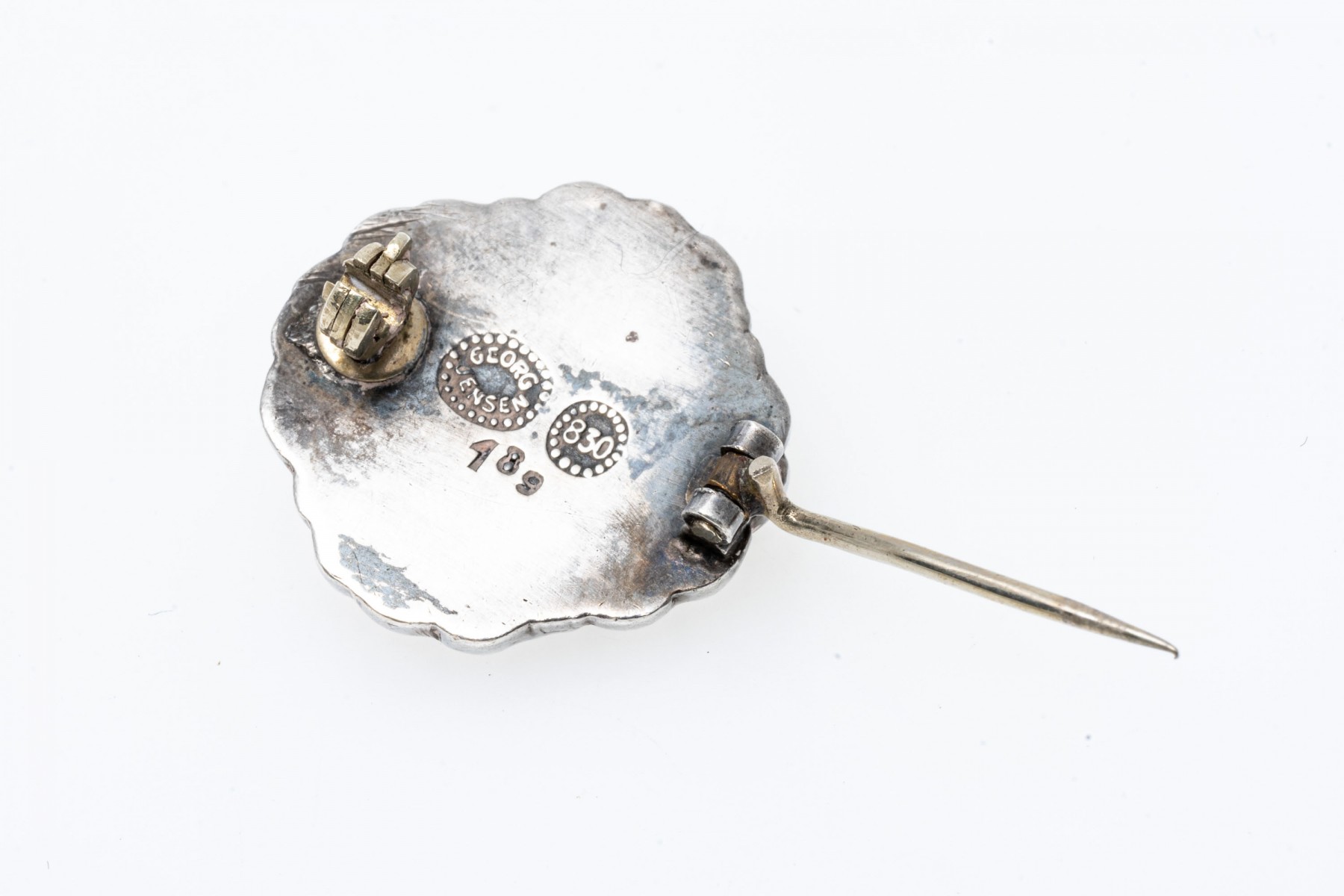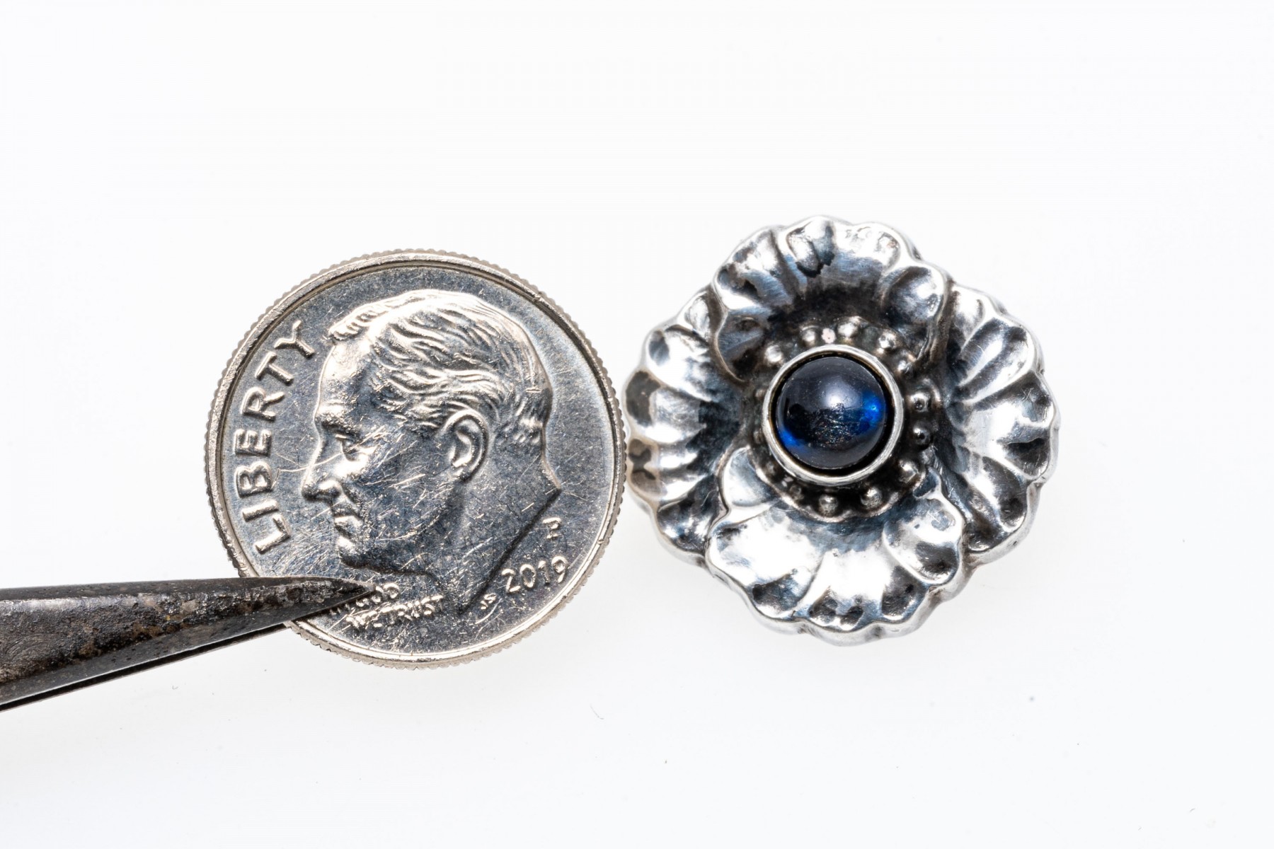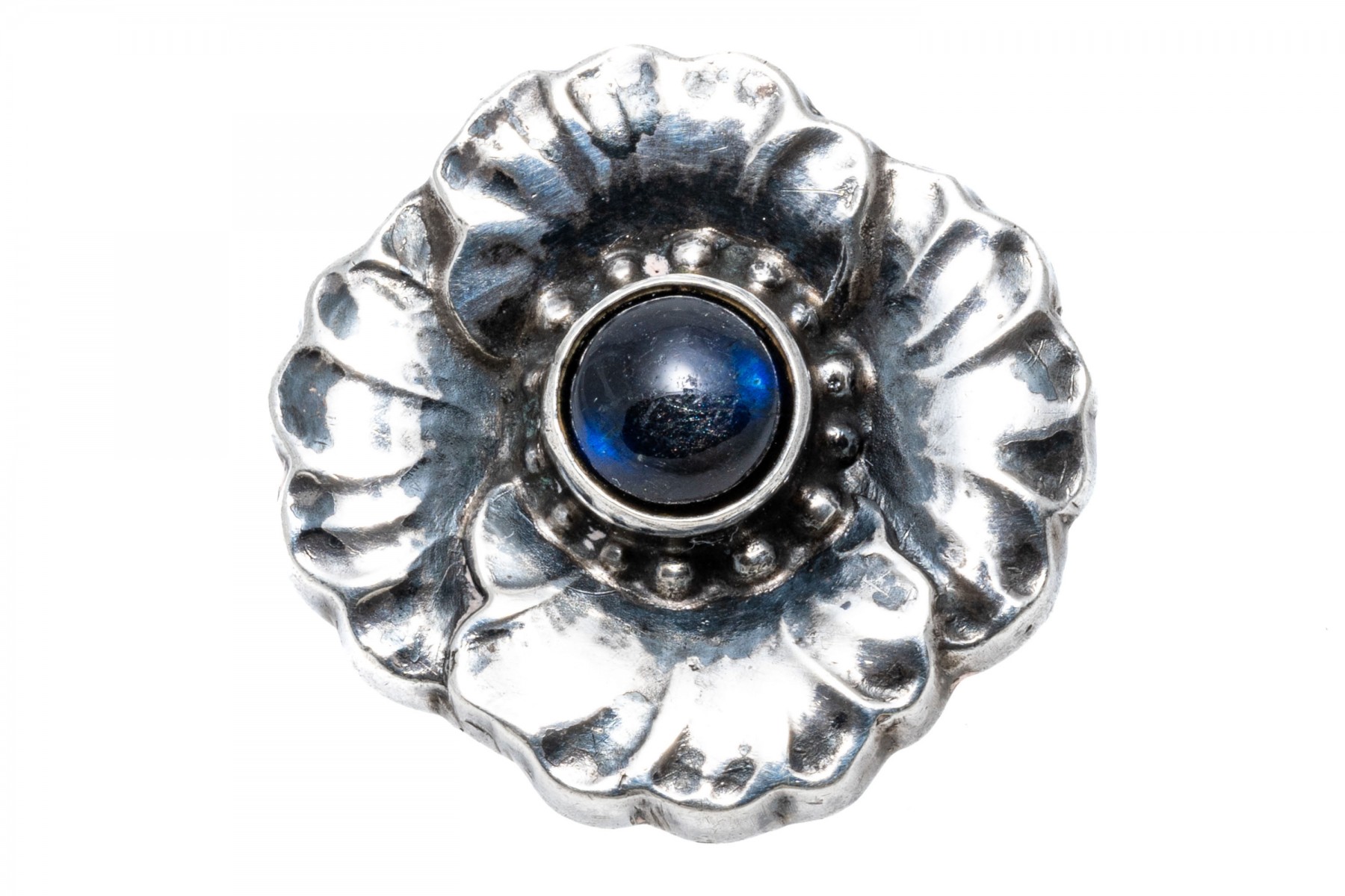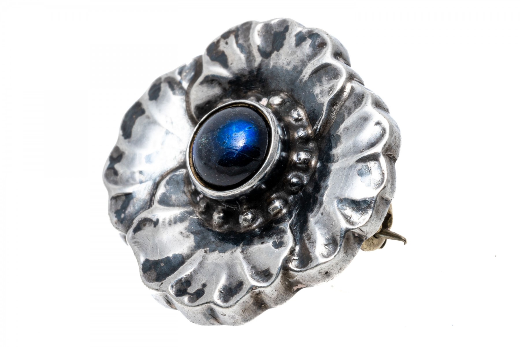 Georg Jenson diminutive floral design brooch, #189, made between 1915-1927. Made of .830 silver, it has a round blue cabochon center, possibly labradorite